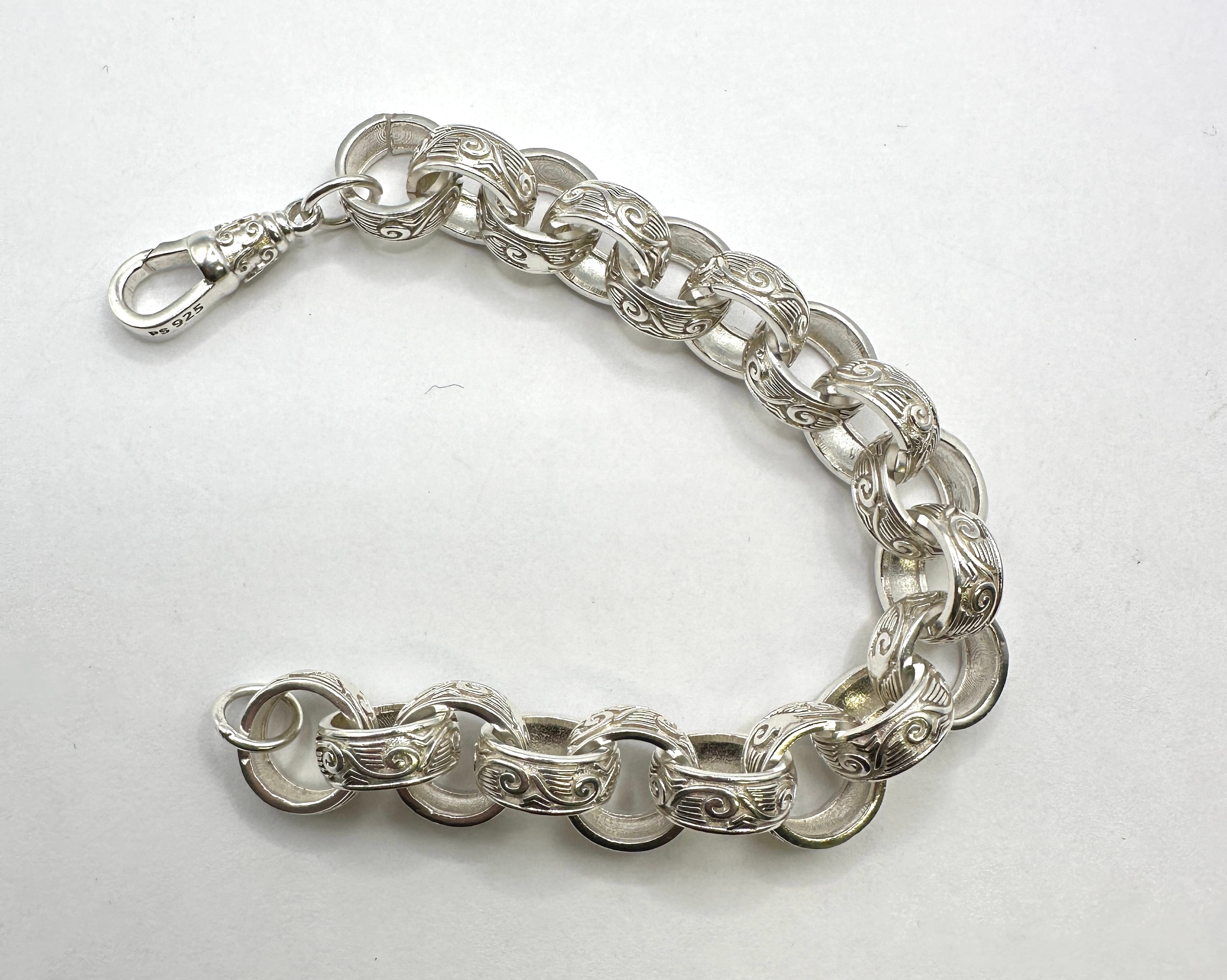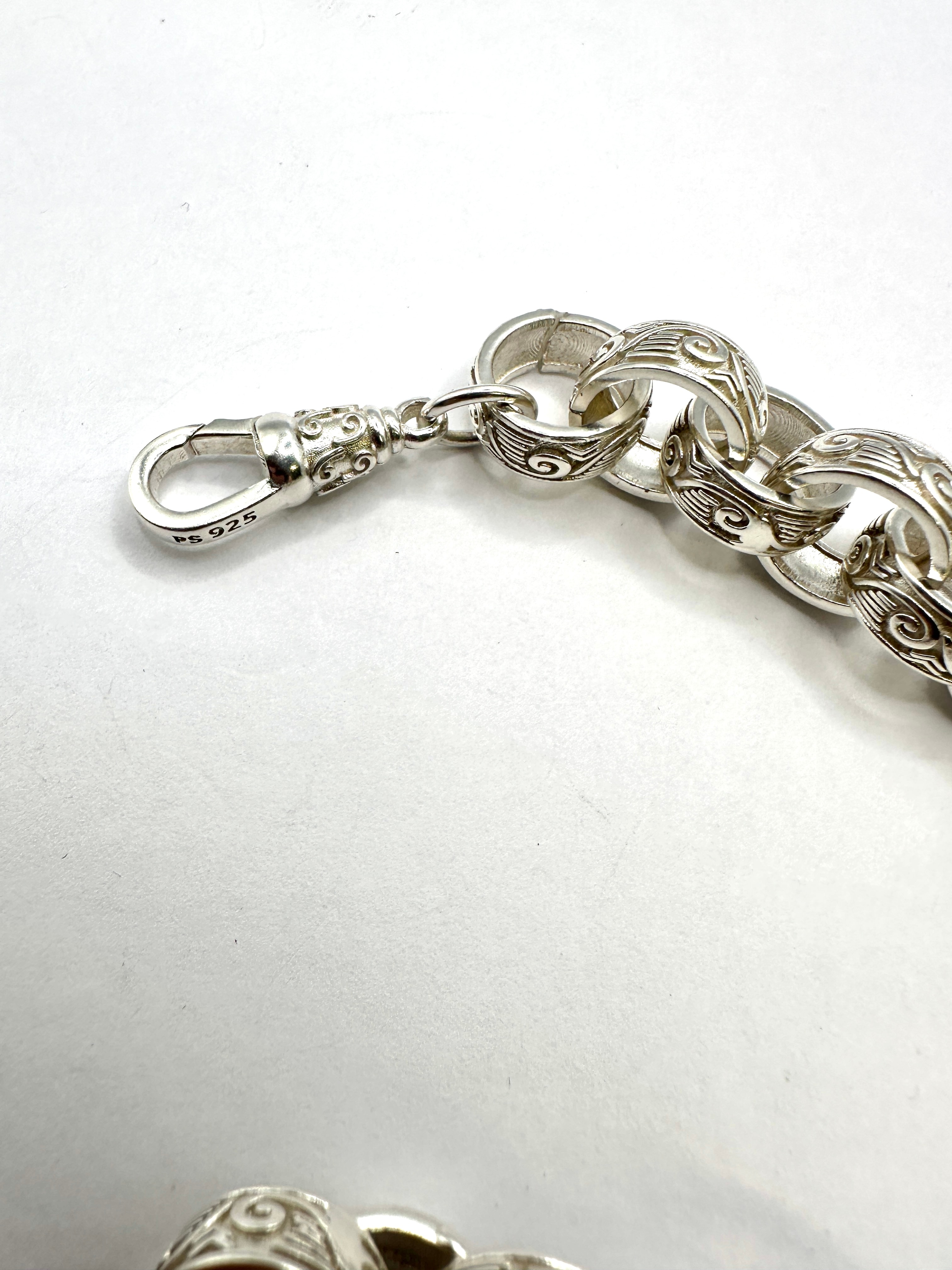 A substantial 925 silver bracelet comprised of oval-shaped links, each featuring intricate engraved or embossed scrollwork patterning. The attached lobster claw clasp is marked “S 925.”