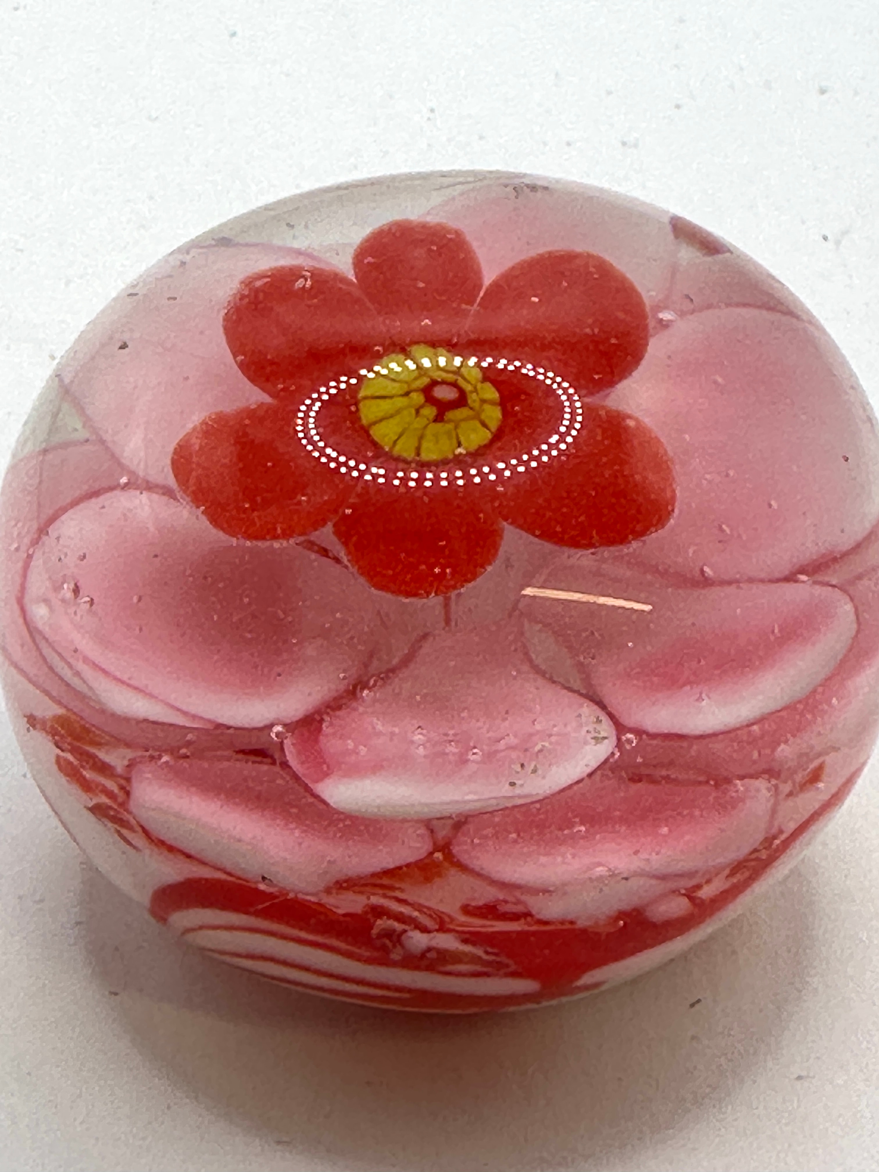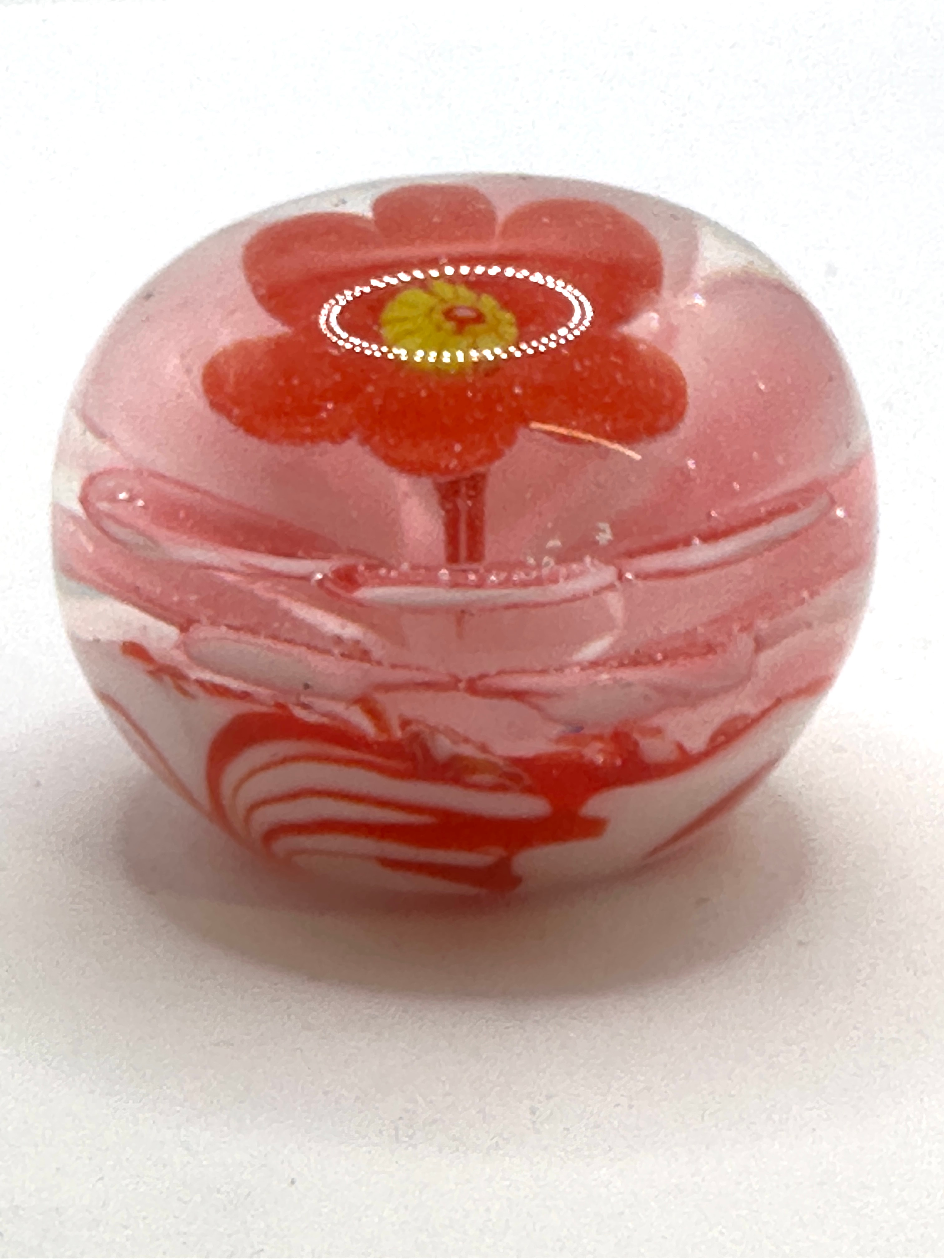 A spherical clear glass paperweight featuring an intricate internal floral design. A prominent central red flower with a yellow and white dotted center is encased, surrounded by layers of translucent pink glass elements. The base exhibits a distinct swirling pattern in red and white, suggesting lampwork techniques. No visible manufacturer’s marks or signatures are discernible.