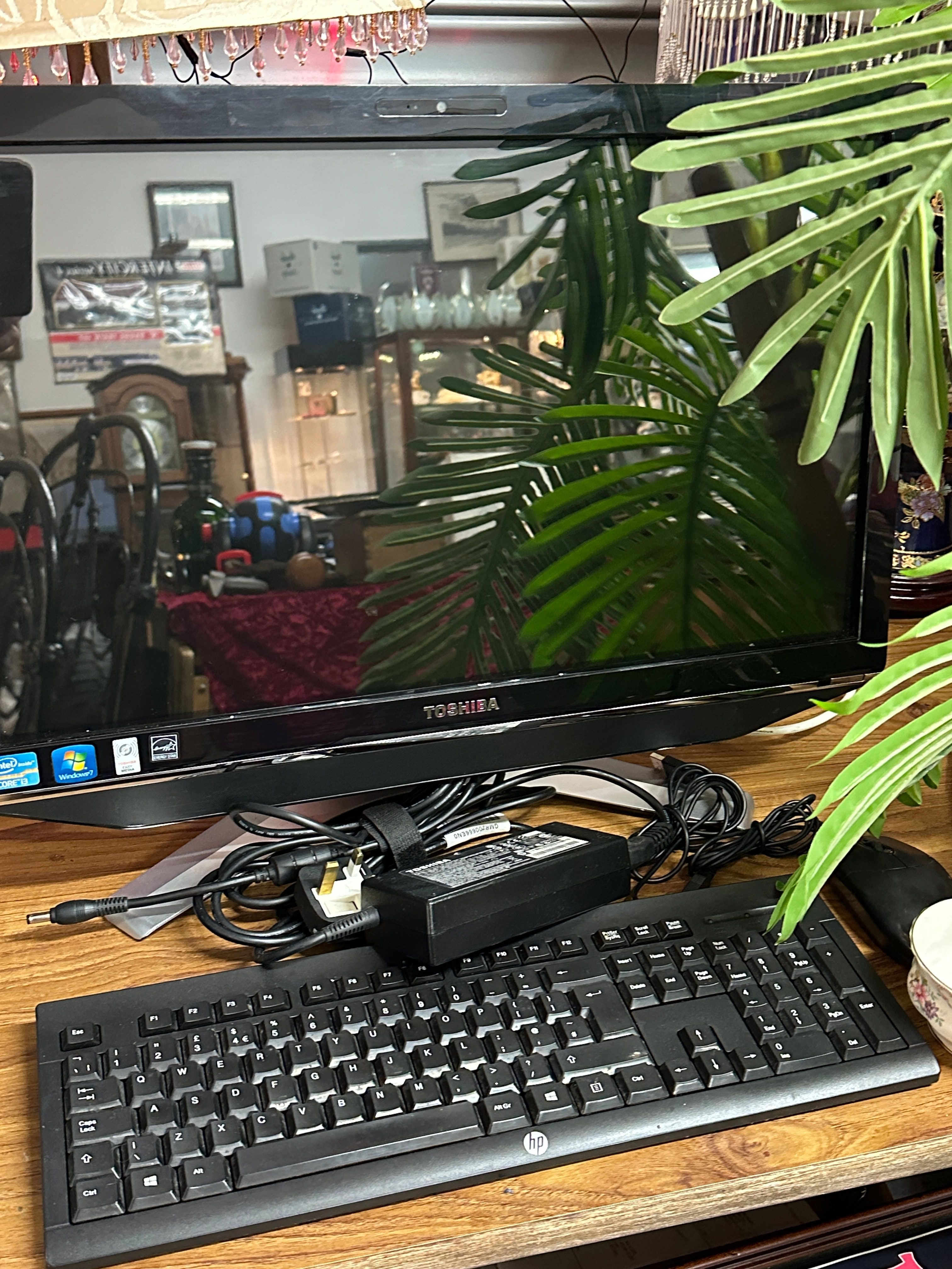 A Toshiba all-in-one computer, featuring a glossy flat-screen display set within a black plastic casing. The lower bezel displays the “TOSHIBA” brand name and includes “Intel Inside Core i3”, “Windows 7”, “TOSHIBA eco utility”, and “ENERGY STAR” stickers. A camera or sensor aperture is present on the upper bezel. Accompanying the main unit are a black HP-branded keyboard and a black power adapter with associated cables, bearing the label “GMRZ066ENO”.