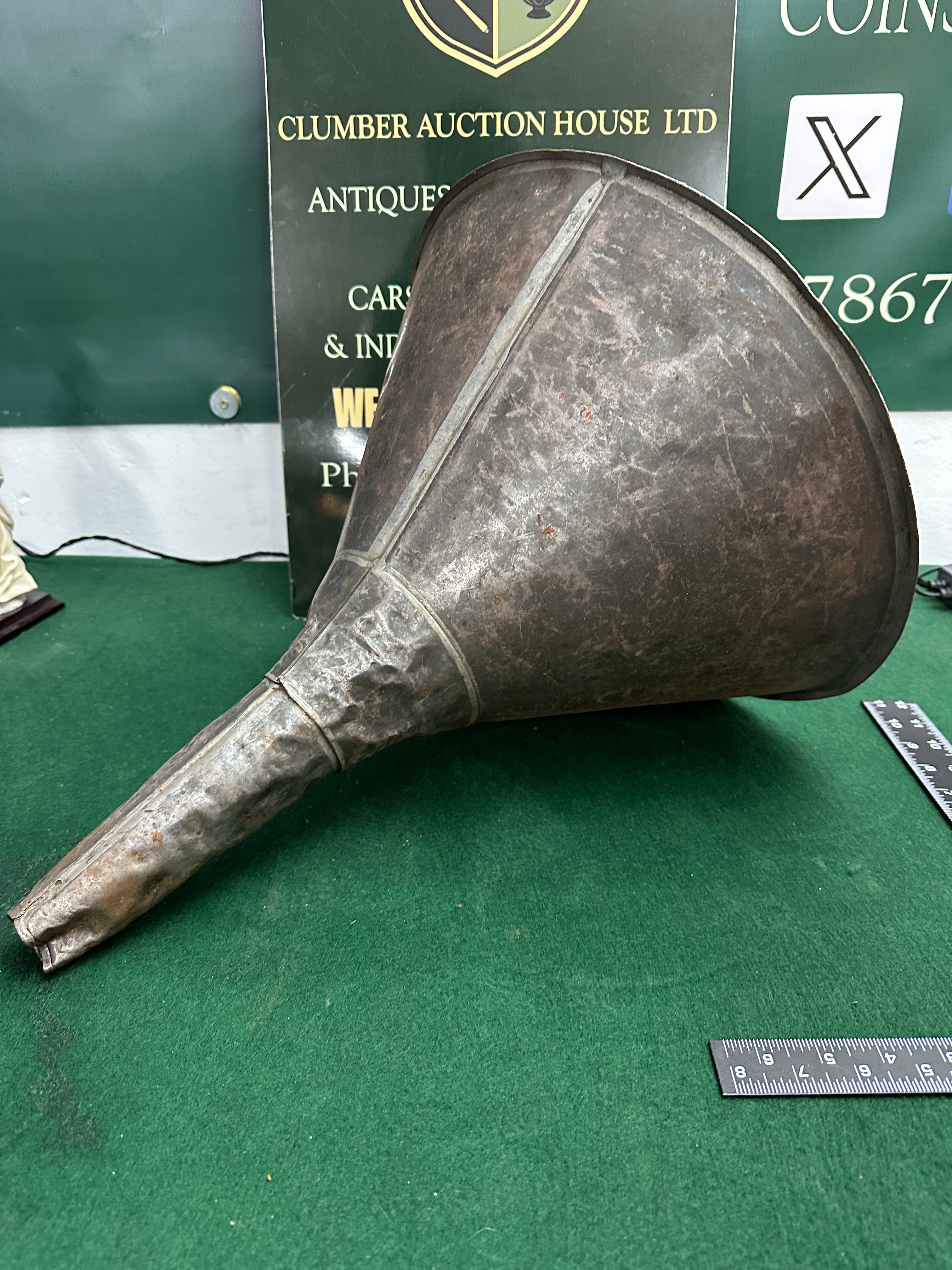 A large, vintage utilitarian funnel crafted from aged metal, likely galvanized steel or tin, featuring a conical body tapering to a long, narrow spout. Its construction displays visible seaming and an irregularly formed, dented rim, suggesting a hand-worked or older manufacturing process.