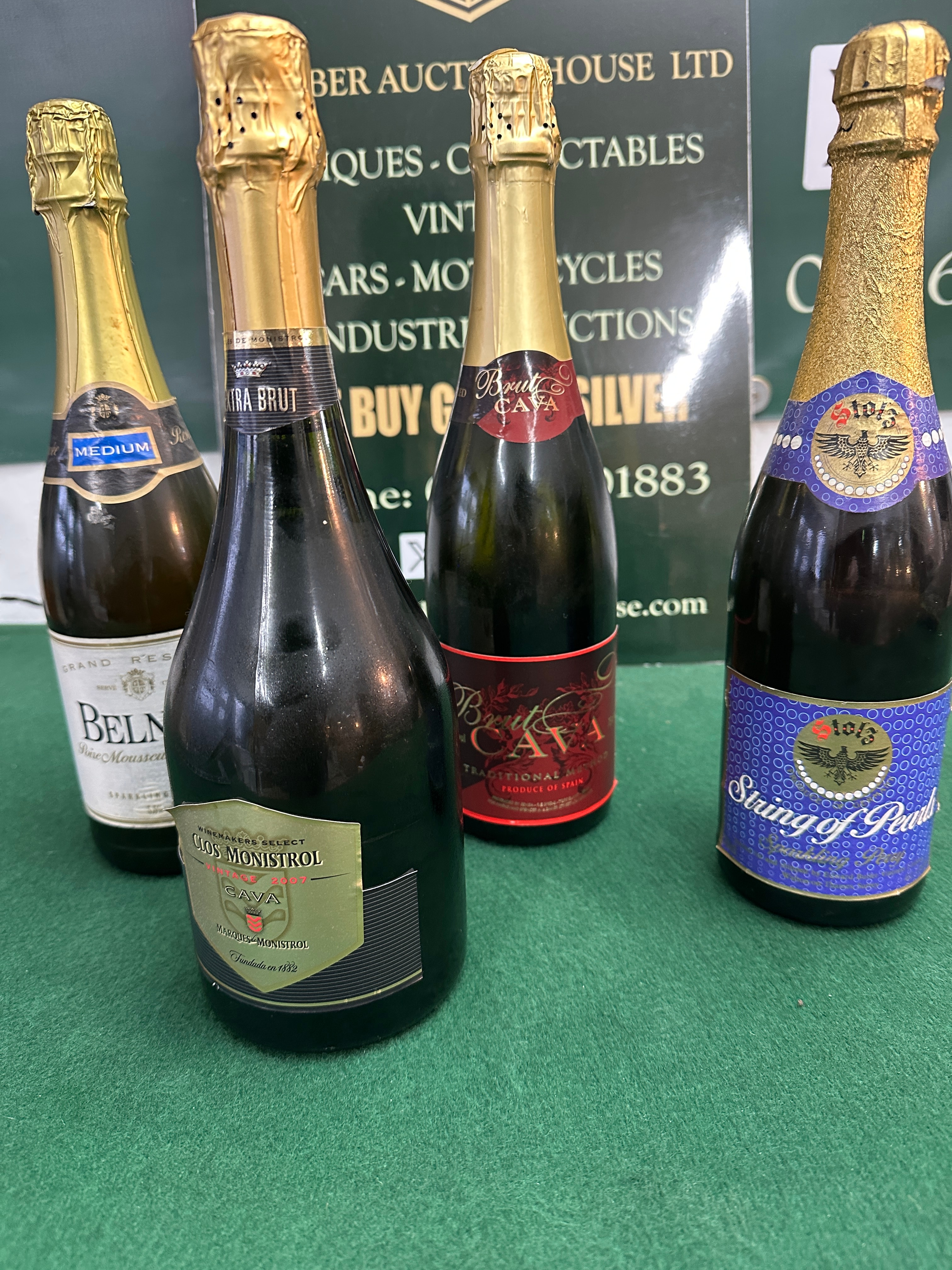 This lot comprises a collection of four dark glass bottles of sparkling wine, each sealed with a gold foil cap and adorned with paper labels featuring various branding. The bottles include one “Clos Monistrol Cava” Vintage 2007 Extra Brut, noting “Fundada en 1882” (Founded in 1882), another “Brut Cava” marked “Traditional Méthod” and “Produce of Spain”, a third labeled “String of Pearls” with an eagle emblem and the year “1913”, and a fourth “Belmont” Grand Reserve labeled “Medium” sparkling wine.