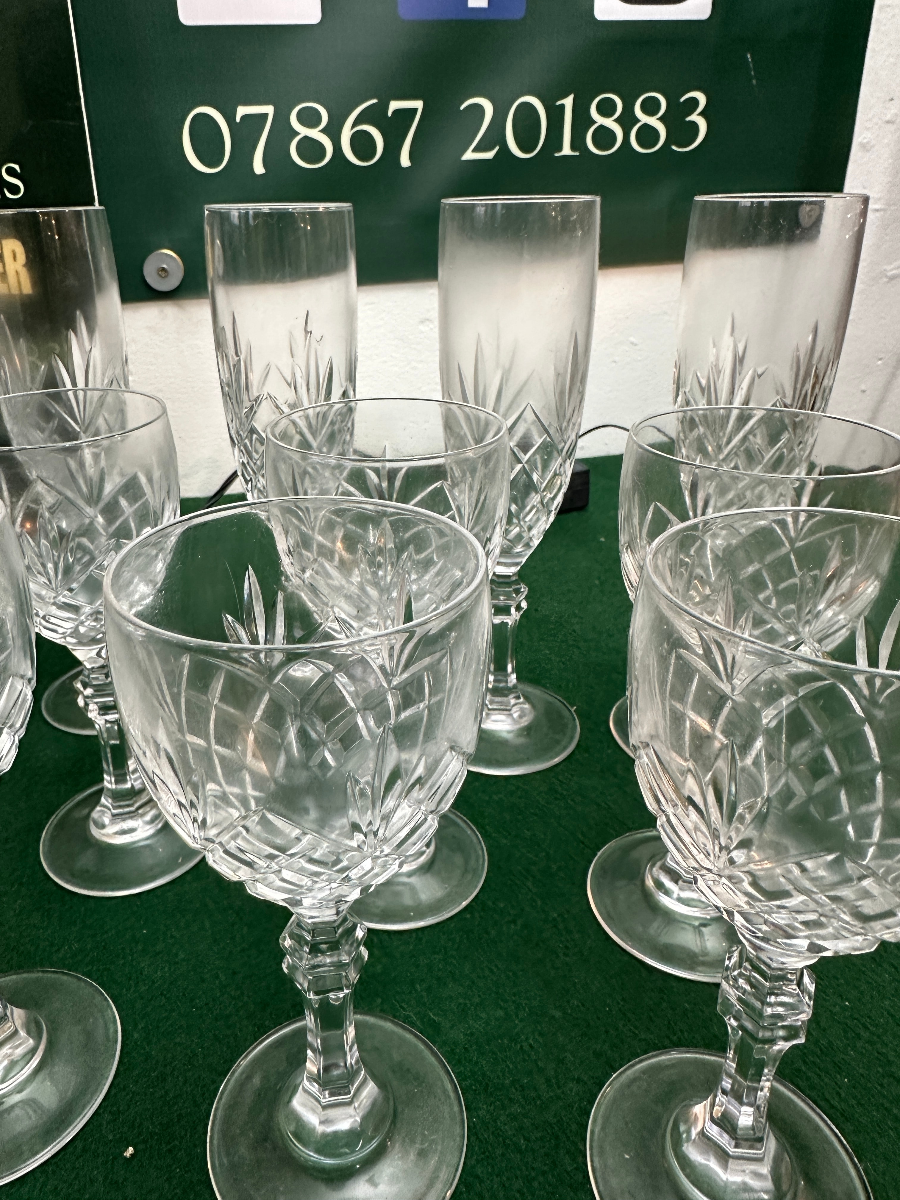 A collection of Godinger Shannon Crystal Dublin cut glass tableware, comprising a single decanter with a faceted stopper and a variety of stemmed drinking glasses, including wine goblets and champagne flutes. Each piece features consistent, elaborate traditional geometric cut patterns, primarily consisting of diamond hobs and starburst motifs, applied to both the decanter’s bulbous body and the bowls of the various glasses. No specific maker’s marks or discernible text are visible on any of the items.