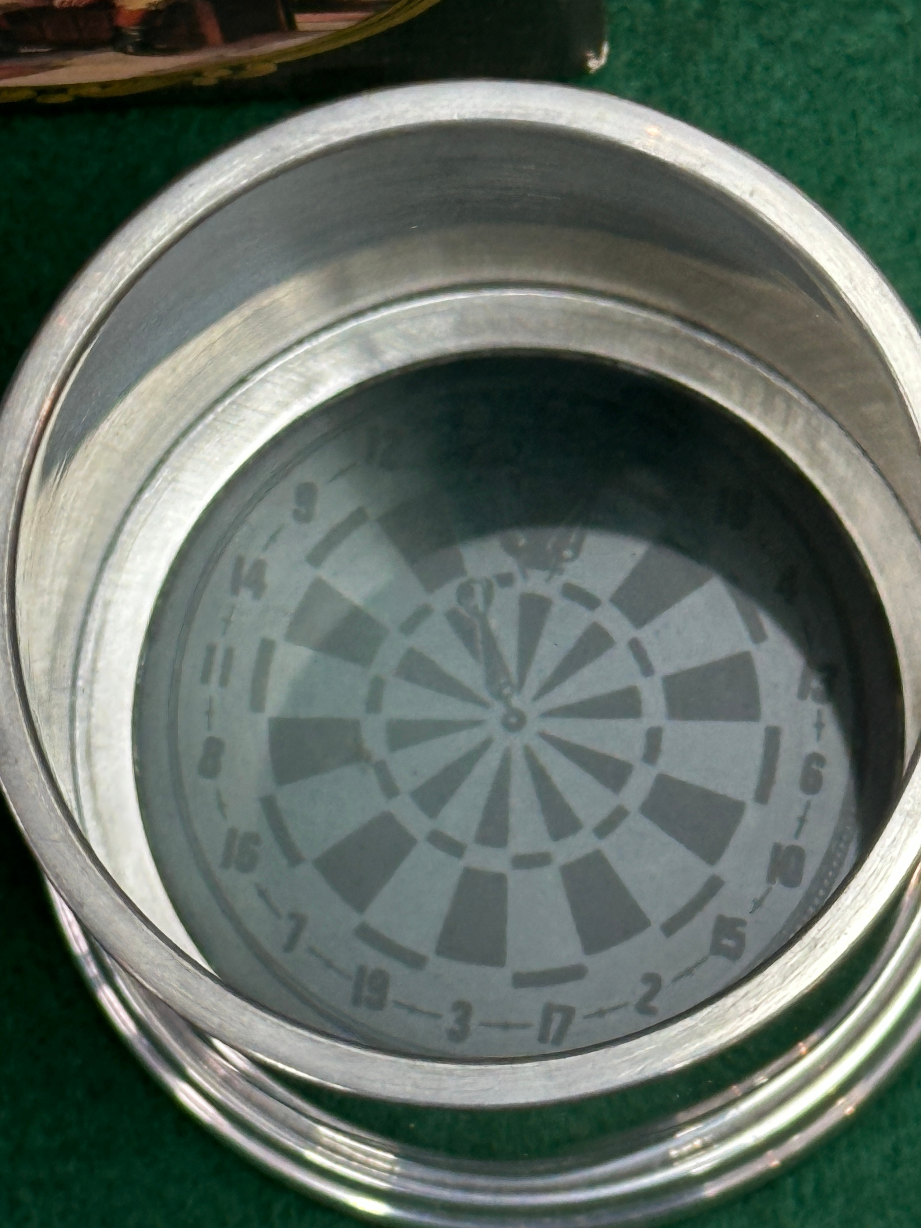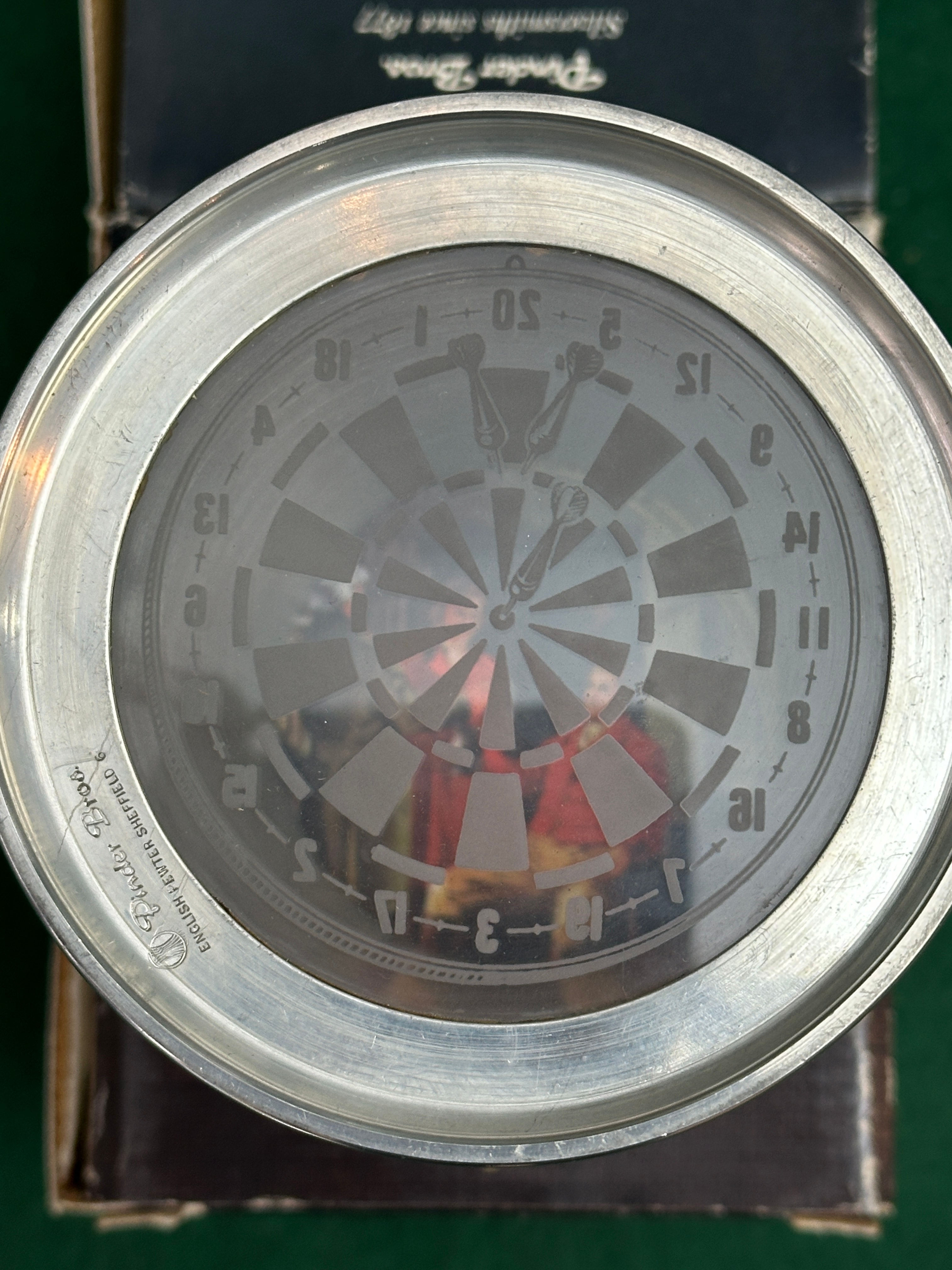 A traditional English pewtar tankard by Pinder Bros. Sheffield, presented with its original dark green presentation box. The polished pewtar tankard features a stepped base, a prominent handle, and horizontal banding around its body. The inverted base displays an etched dartboard motif, complete with numerical scoring and three darts, accompanied by the text “Wadler Bros.” and “ENGLISH PEWTAR SHEFFIELD”. The accompanying dark green presentation box identifies the object as “A TRADITIONAL english tankard by Pinder Bros. Sheffield” and features a graphic depicting men drinking.