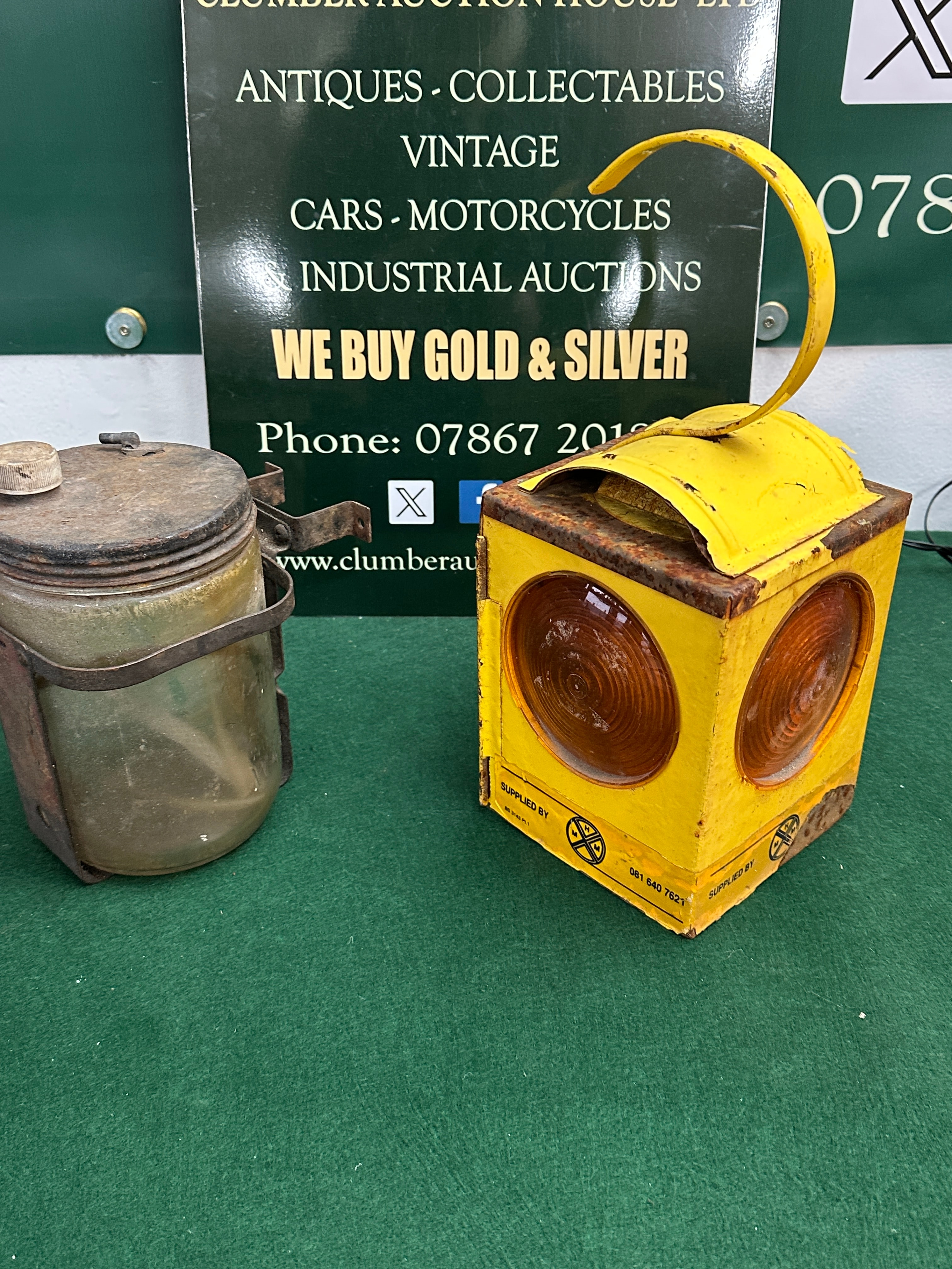 A pair of vintage industrial paraffin road lamps, comprising a lamp and its associated fuel container. The lamp features a square-bodied metal construction, painted yellow with extensive chipping and visible rust. It is fitted with four circular amber lenses and a bent metal carrying handle on its top. Markings on the lamp include “SUPPLIED BY”, “BS 3143 PT.1”, a circular emblem with a cross-like symbol, and a partial number “81 640 7621”. The accompanying fuel container is a cylindrical glass jar, its body hazy, enclosed by rusted metal strapping. It is topped with a heavily tarnished metal lid featuring a small capped spout. Both objects show significant wear and tear, consistent with age and practical use.
