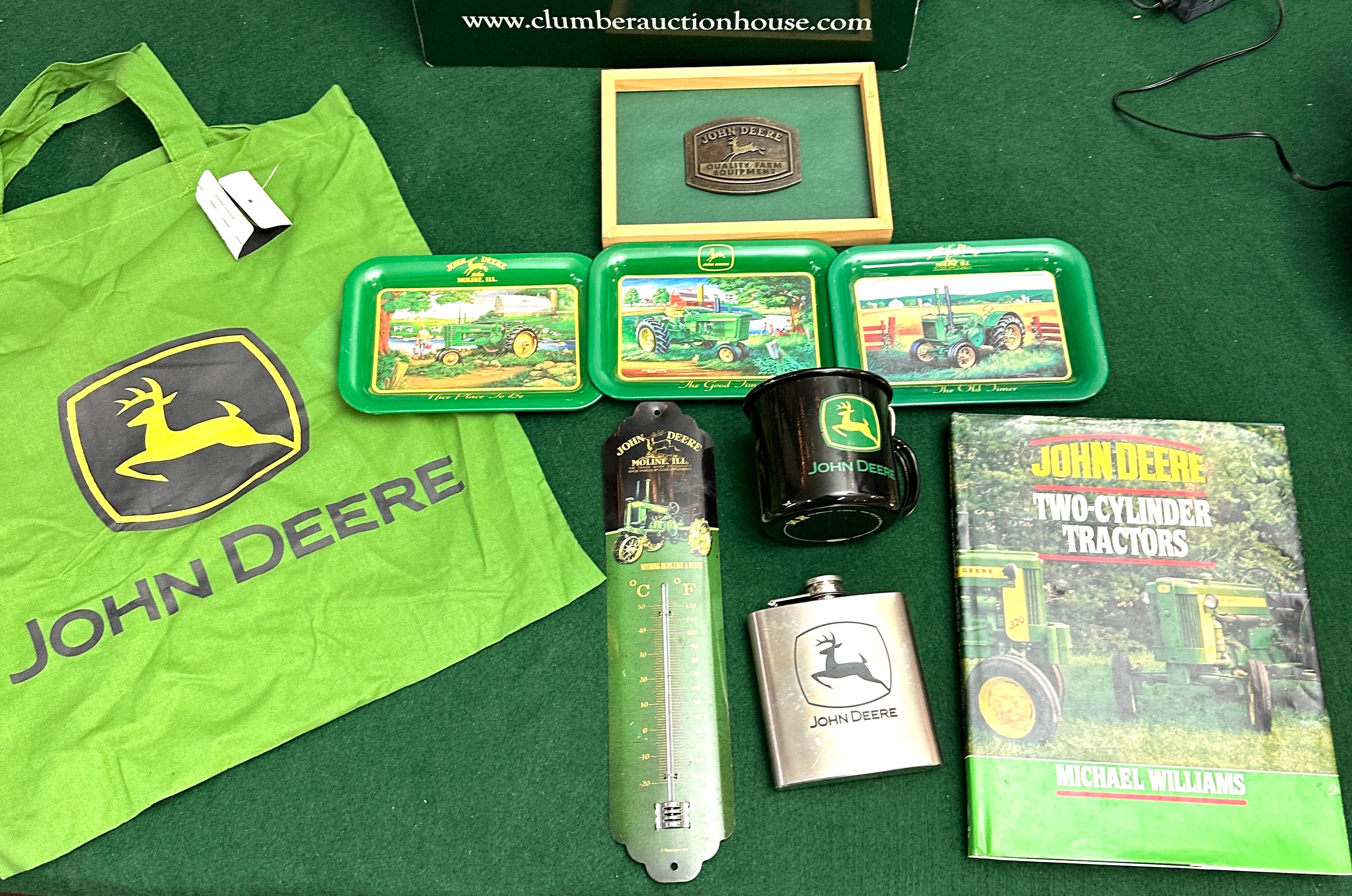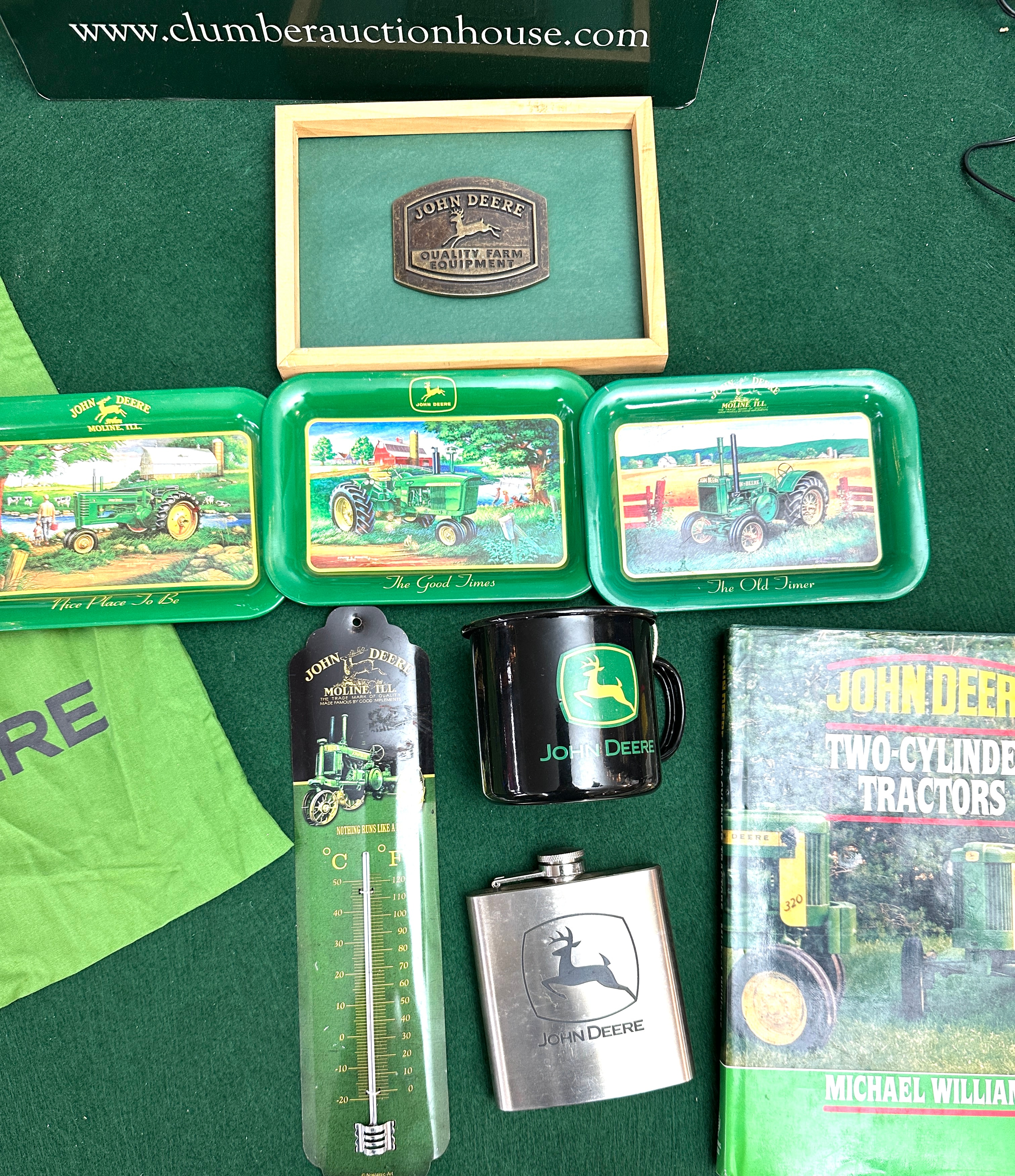 A collection of John Deere branded merchandise and collectibles. The group includes three green rectangular metal serving trays, identified by web intelligence as ‘Vintage Metal John Deere Advertisement Small Trays Set Of 3,’ depicting various John Deere tractors with phrases such as ‘The Good Times’ and ‘The Old Timer.’ Also present are a bright green fabric tote bag, a bronze-toned metal belt buckle presented in a wooden frame, a metal thermometer featuring a John Deere tractor and ‘Moline, Ill.’, a black ceramic mug, a stainless steel hip flask, and a hardcover book titled ‘JOHN DEERE TWO-CYLINDER TRACTORS’ by Michael Williams. All items prominently feature the ‘JOHN DEERE’ name and its iconic deer logo, often accompanied by ‘QUALITY FARM EQUIPMENT’ and ‘Moline, Ill.’ or ‘MOLINE ILLINOIS’.
