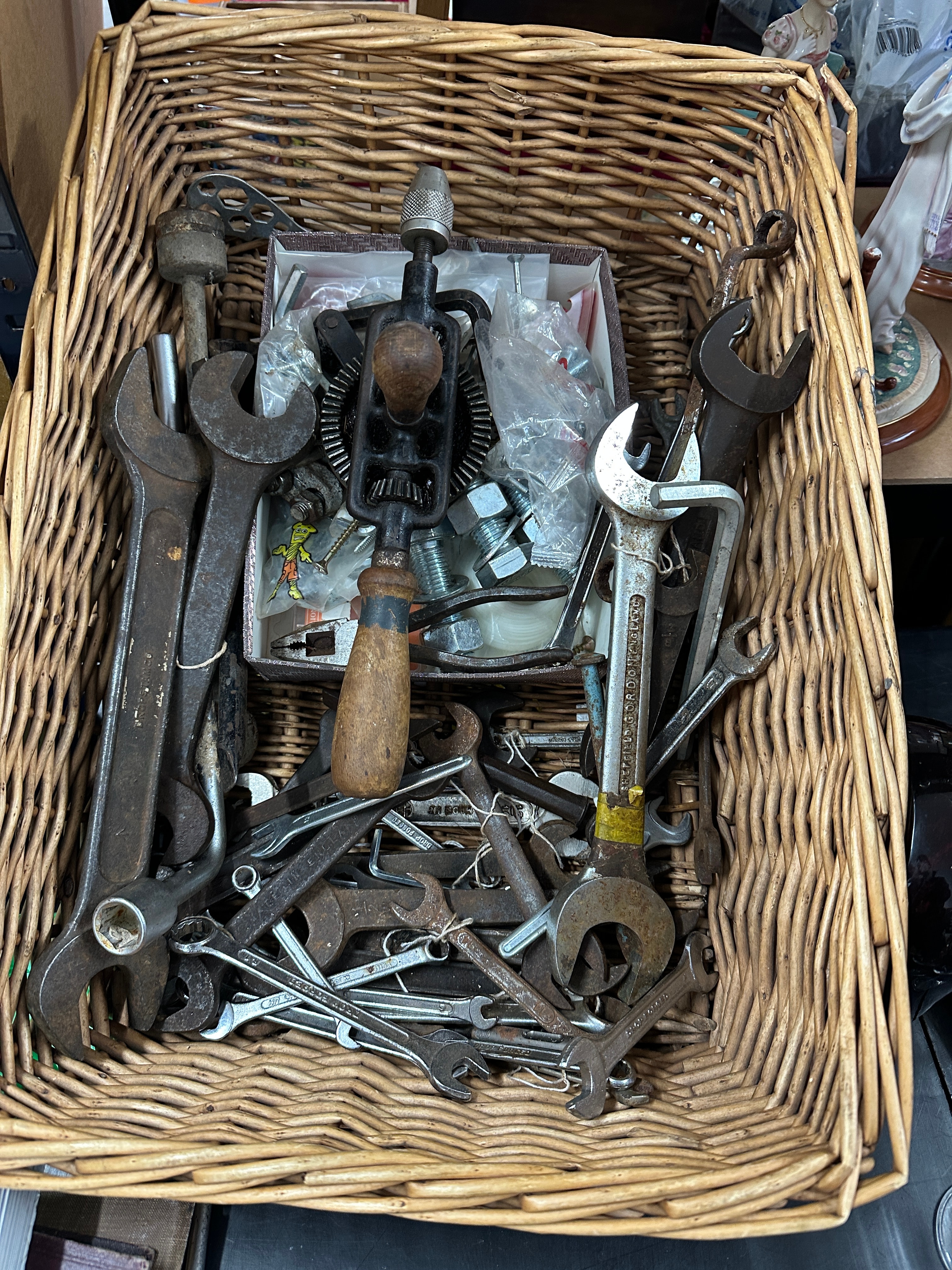 A large, rectangular natural woven wicker basket containing a varied assortment of hand tools and loose fasteners. The tools, primarily composed of steel and wood, include numerous open-ended, box-end, and combination wrenches of various sizes, an older hand drill with wooden handles, and several hexagon wrenches. Visible markings on some wrenches include “DROP FORGED”, while another tool bears the text “SHEFFIELD GORDON”. Within the basket, a smaller cardboard box holds modern nuts, bolts, and screws, some packaged in clear plastic bags.