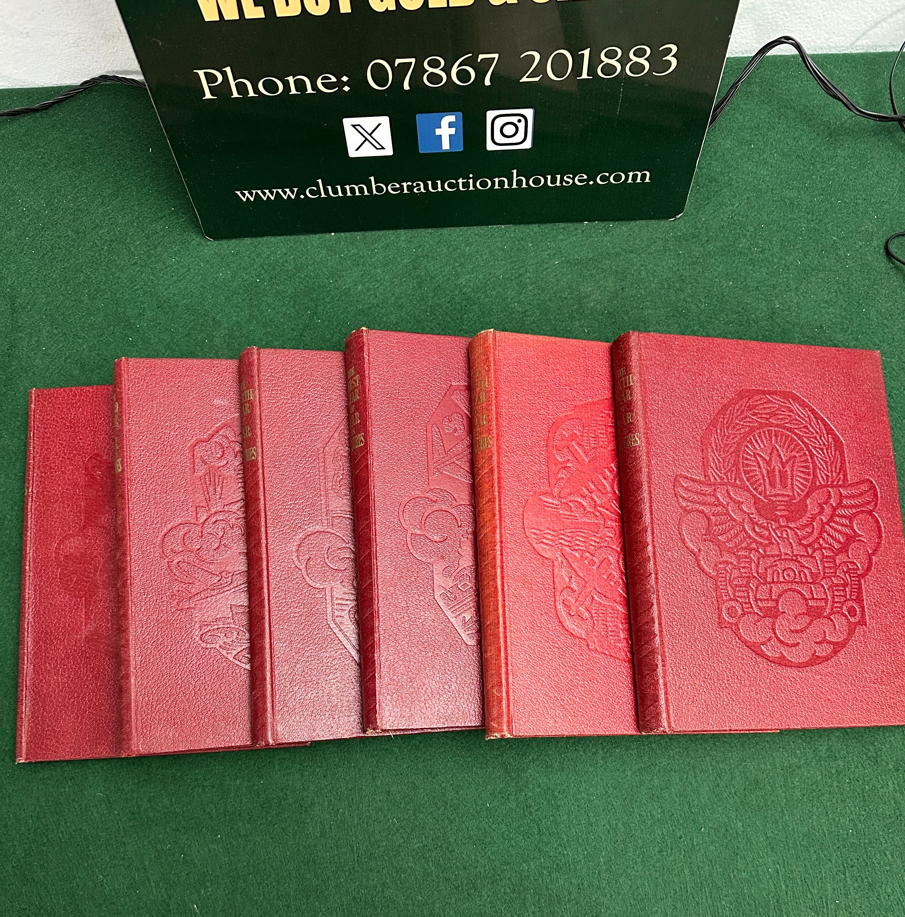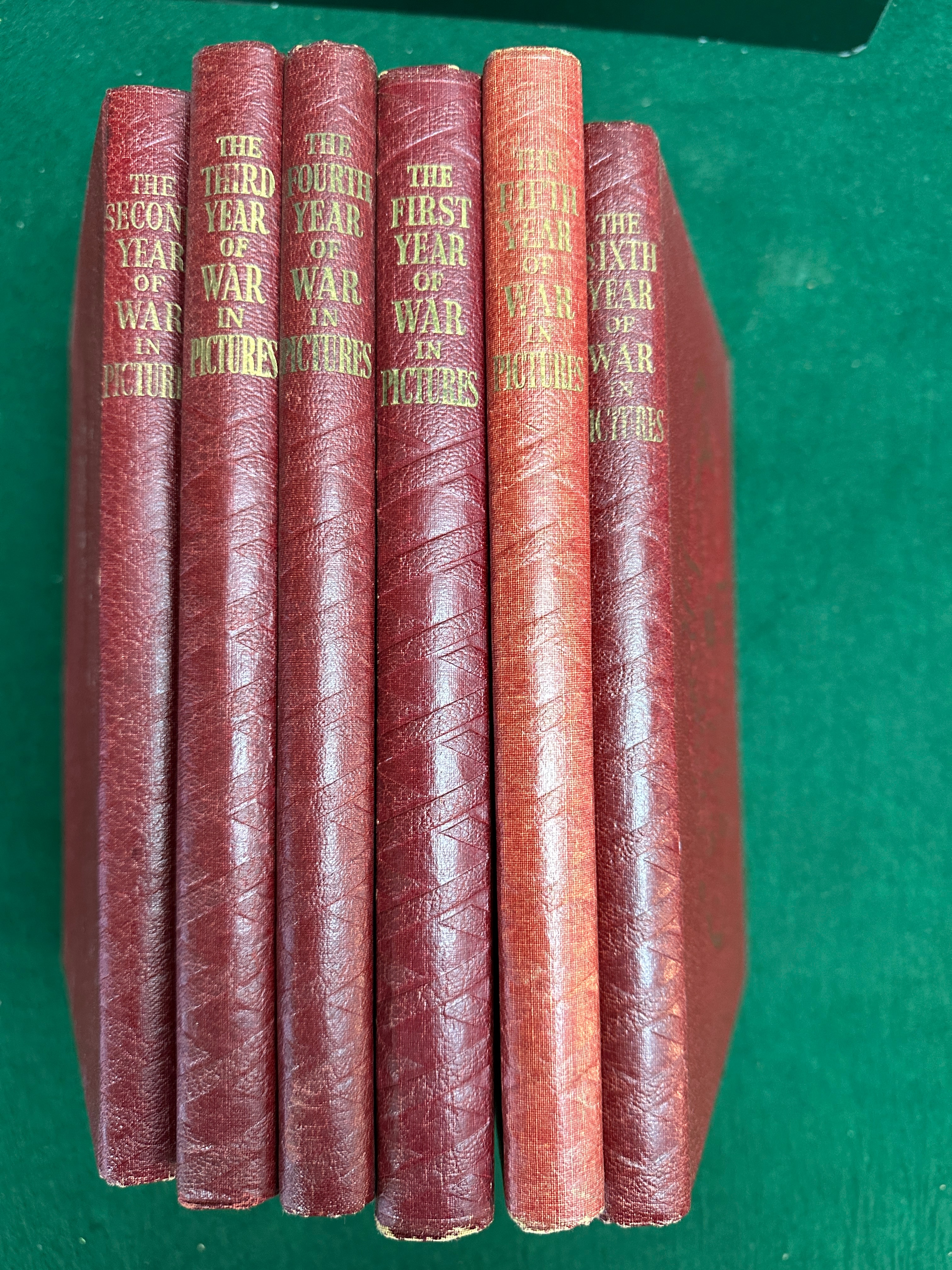 A set of seven hardcover volumes from ‘The War in Pictures’ series, a pictorial history of World War II. The volumes are uniformly bound in deep red or maroon cloth, featuring an embossed decorative emblem resembling a stylized crest or eagle on the front covers. Six of the volumes are titled ‘The First Year of War in Pictures,’ ‘The Second Year of War in Pictures,’ ‘The Third Year of War in Pictures,’ ‘The Fourth Year of War in Pictures,’ ‘The Fifth Year of War in Pictures,’ and ‘The Sixth Year of War in Pictures.’ The seventh volume shares the same binding style, but its spine text is largely obscured.