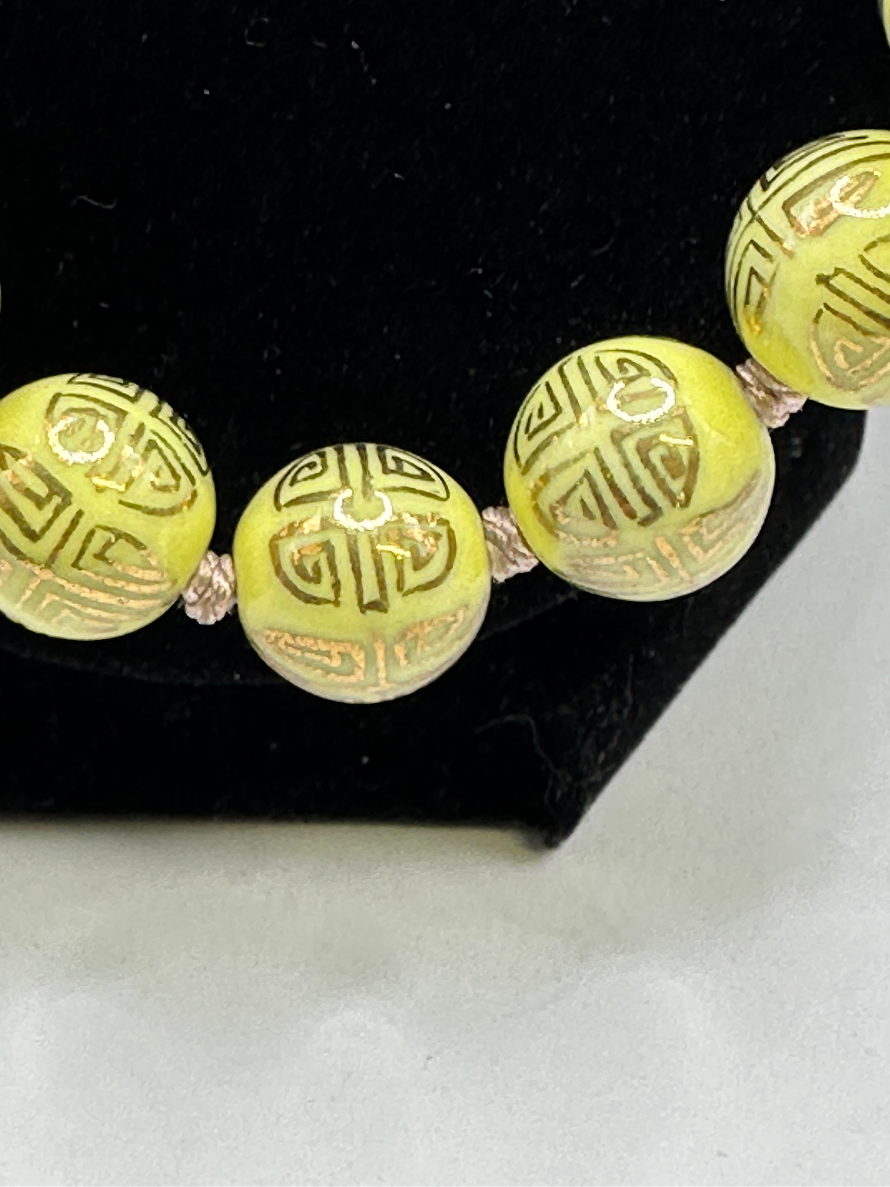 A single-strand beaded necklace presenting an East Asian aesthetic, likely vintage or antique. It is comprised of approximately 30 large, spherical beads with a glossy, light yellow-green (celadon) finish, appearing to be ceramic or glass. Each bead is individually knotted on a visible, possibly pinkish-brown or purple-hued cord. The beads are decorated with a repeating metallic (likely gilt or bronze-colored) geometric motif, clearly identifiable as the stylized Chinese character ‘壽’ (shòu), which translates to “longevity” or “long life.”