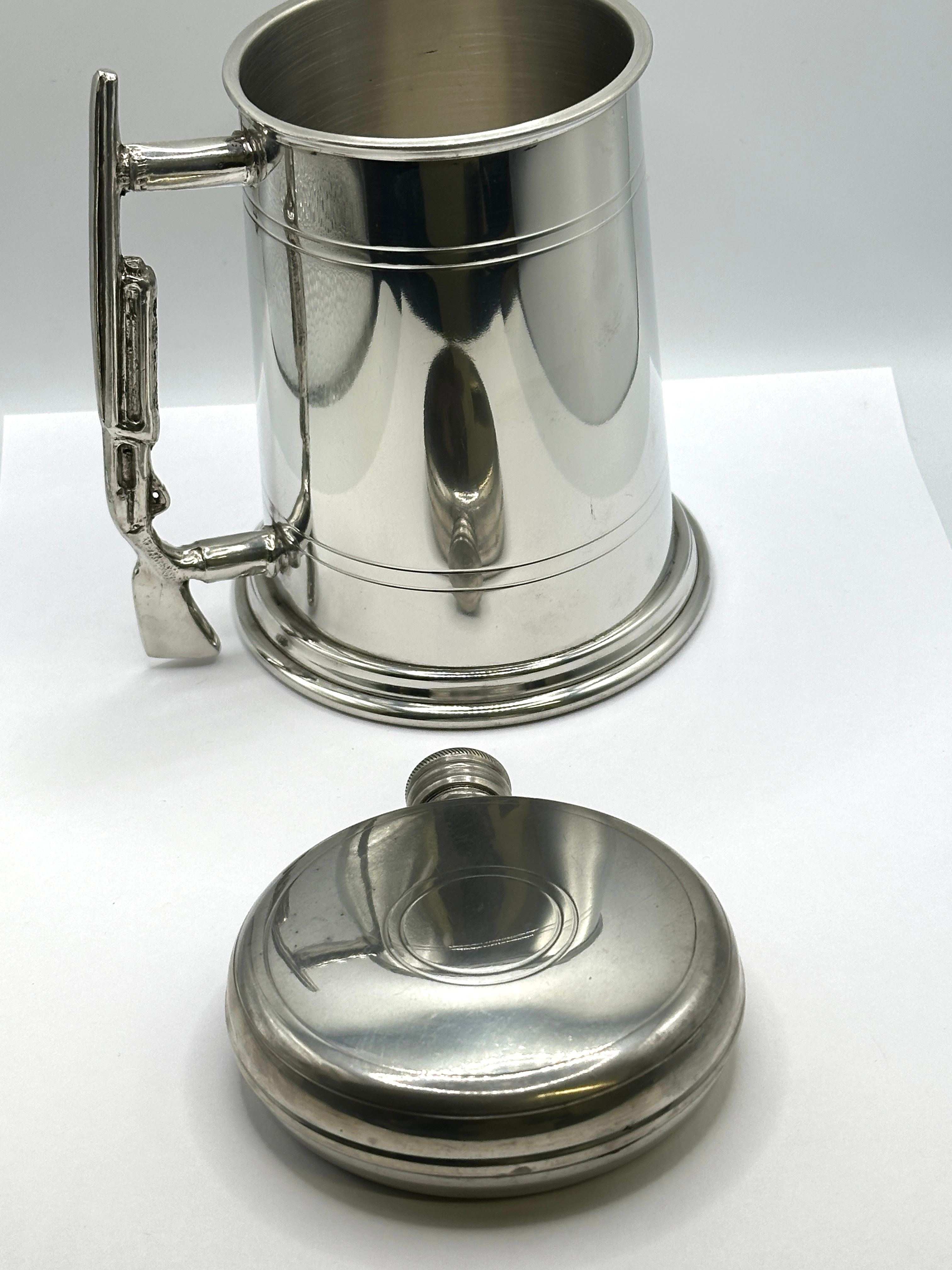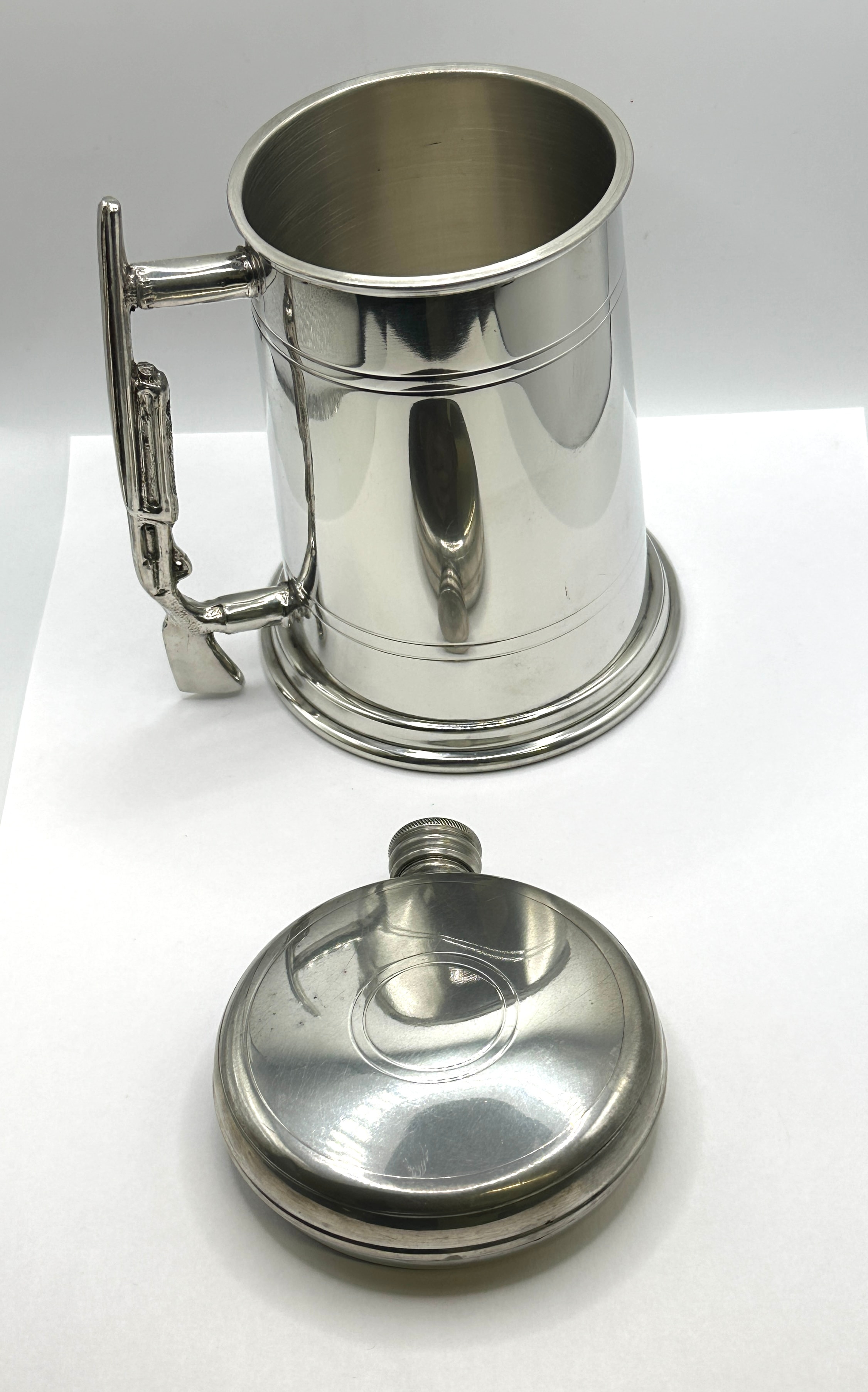A Pewter tankard featuring a ribbed body, a flared base, and a distinctive handle designed in the form of a rifle, complete with a trigger guard and stock. Faint, unidentifiable markings are visible near the base of the handle. The accompanying hip flask is round-bodied with a ribbed screw-top cap and a shallow circular depression on one side.