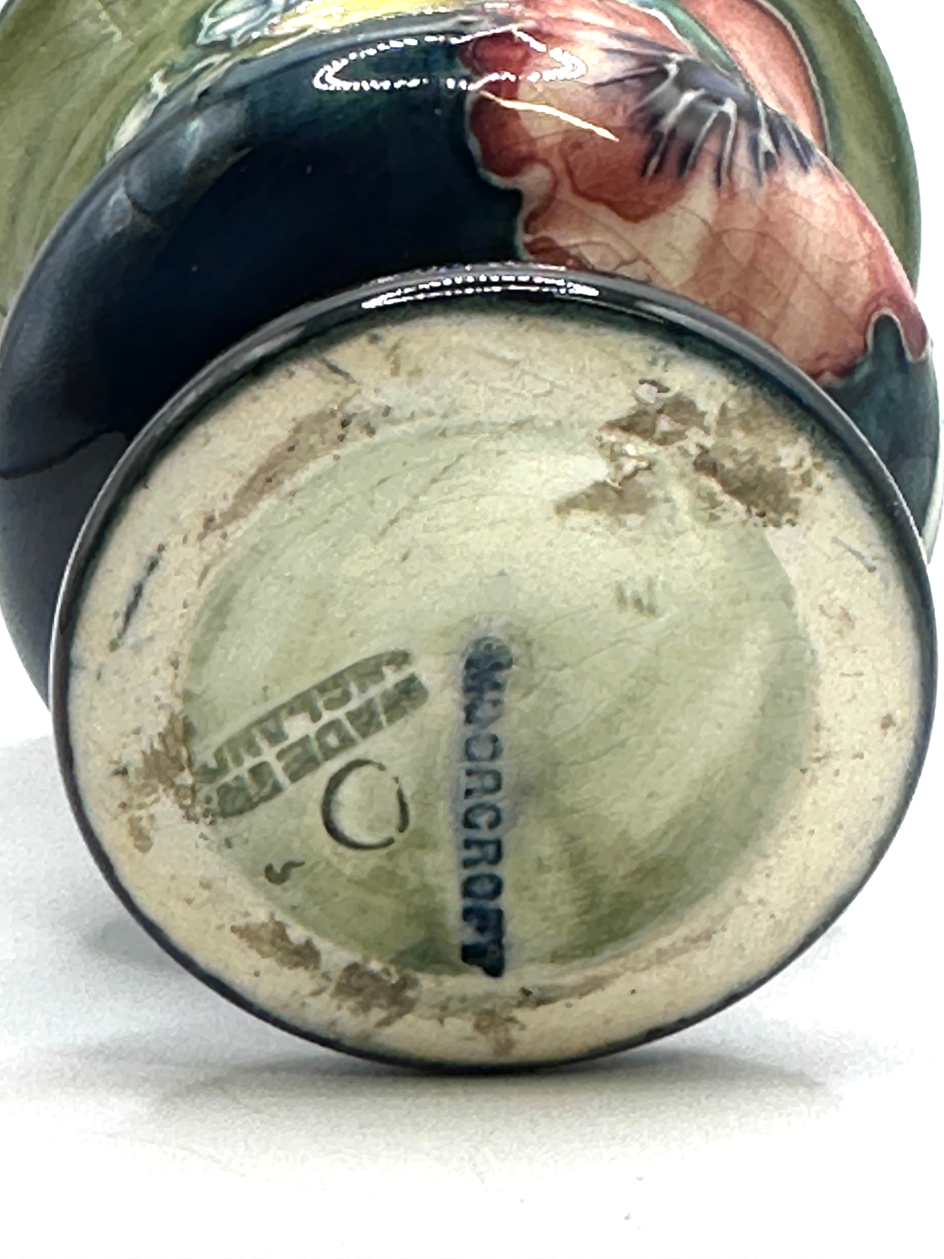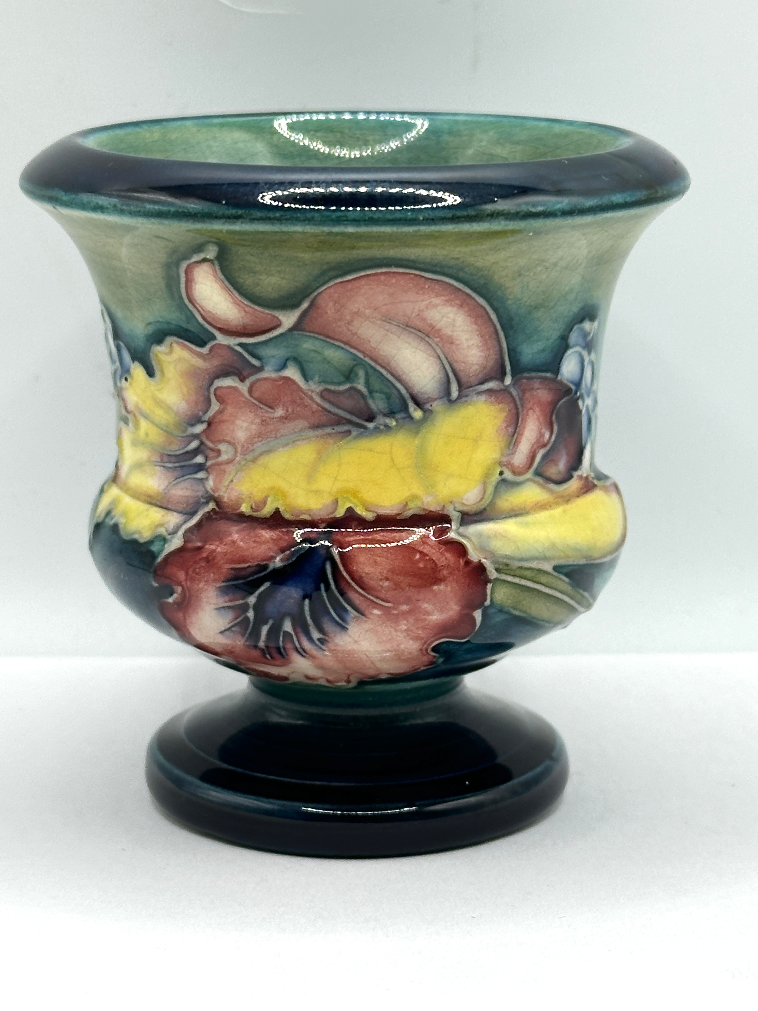 A Moorcroft ceramic vase, featuring a stylized floral design. This footed ceramic vase features a vibrant, stylized floral design primarily in yellow, red, and dark blue hues, outlined in a technique resembling tube-lining, set against a graduated green and dark blue background. The body has a glossy finish, with visible crackle in some glazed areas. The base is marked in dark blue with “MOORCROFT” written vertically, alongside an impressed stamp reading “MADE IN ENGLAND” and another small impressed mark, possibly a ‘C’.