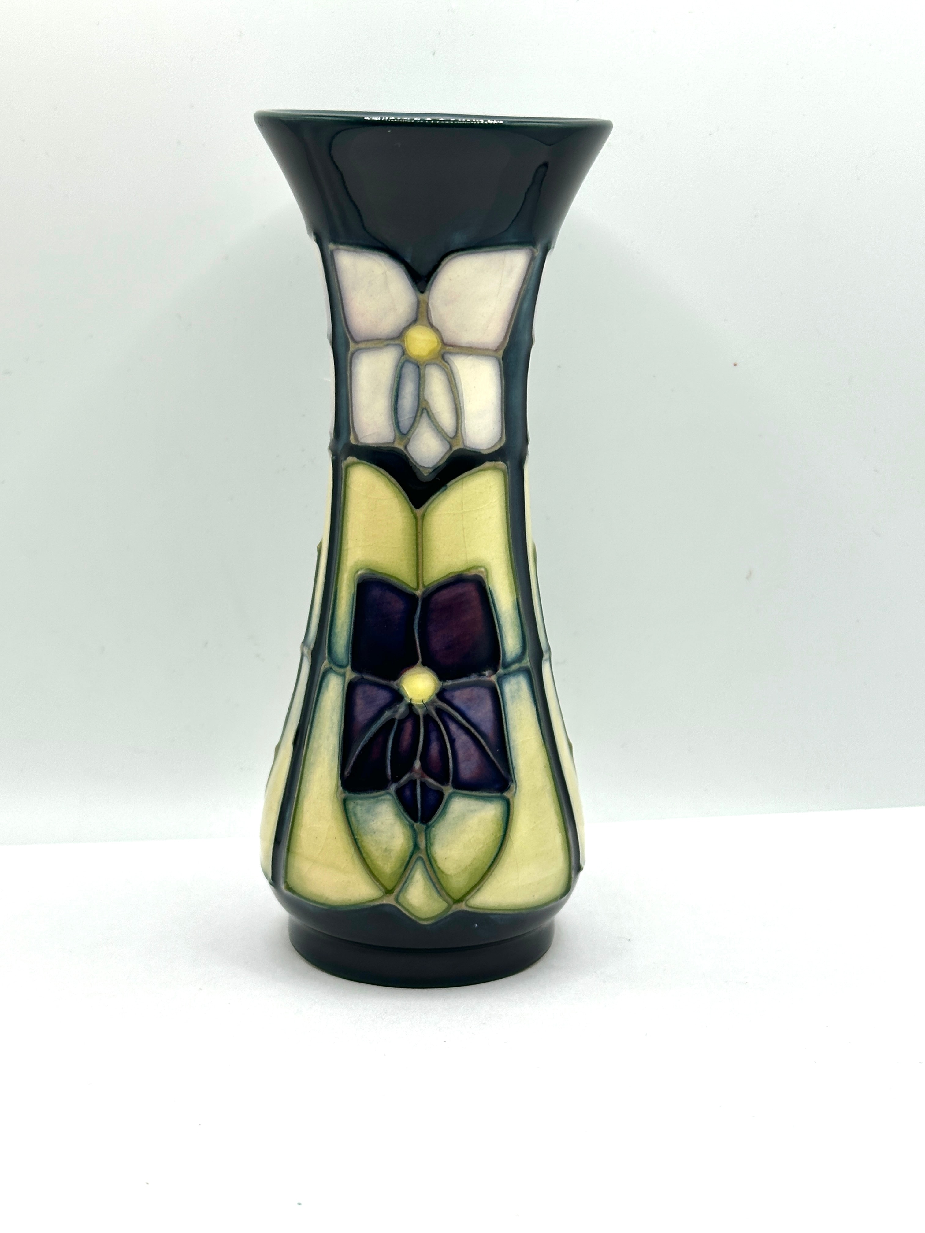 A Moorcroft ‘Violet’ pattern ceramic vase. It features a waisted profile, flared rim, and circular foot. The design showcases stylized floral motifs in shades of cream, light yellow, deep purple, and dark teal, outlined in a darker glaze. The base is impressed with ‘MOORCROFT’ and ‘MADE IN ENGLAND’, alongside a hand-painted green script signature resembling ‘T.J.W.’ and an additional impressed square mark.