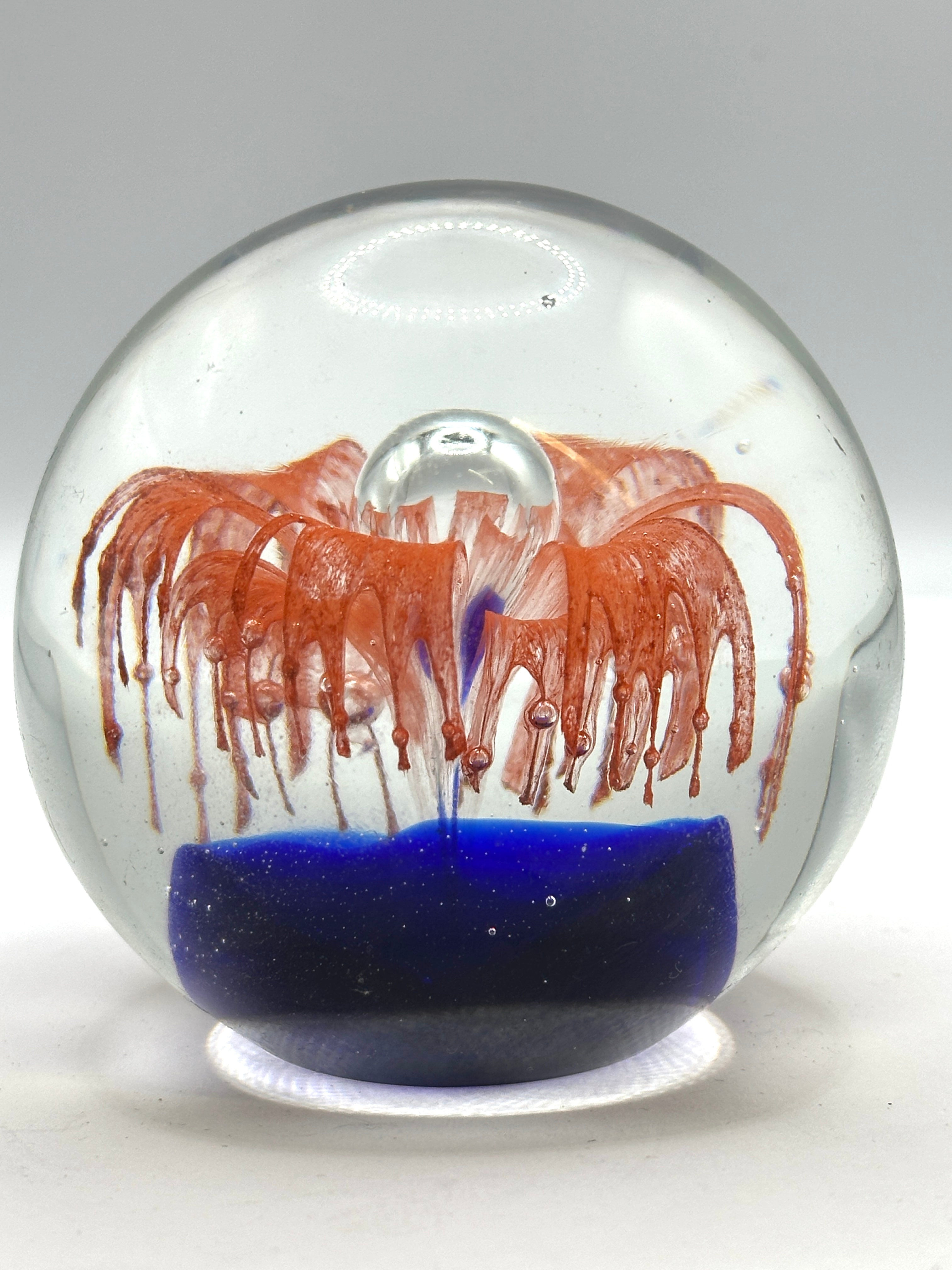 A spherical clear glass paperweight encasing an abstract internal design. A central clear glass dome-shaped element sits atop a formation of reddish-orange, translucent glass strands or tendrils, which spread outwards and downwards into the clear glass body. Beneath this, an opaque, deep cobalt blue glass base forms the bottom layer of the internal composition. Small air bubbles are visible both within the clear glass encasement and integrated into the colored design elements. No discernible text, signatures, or maker’s marks are visible on the surface or within the piece.