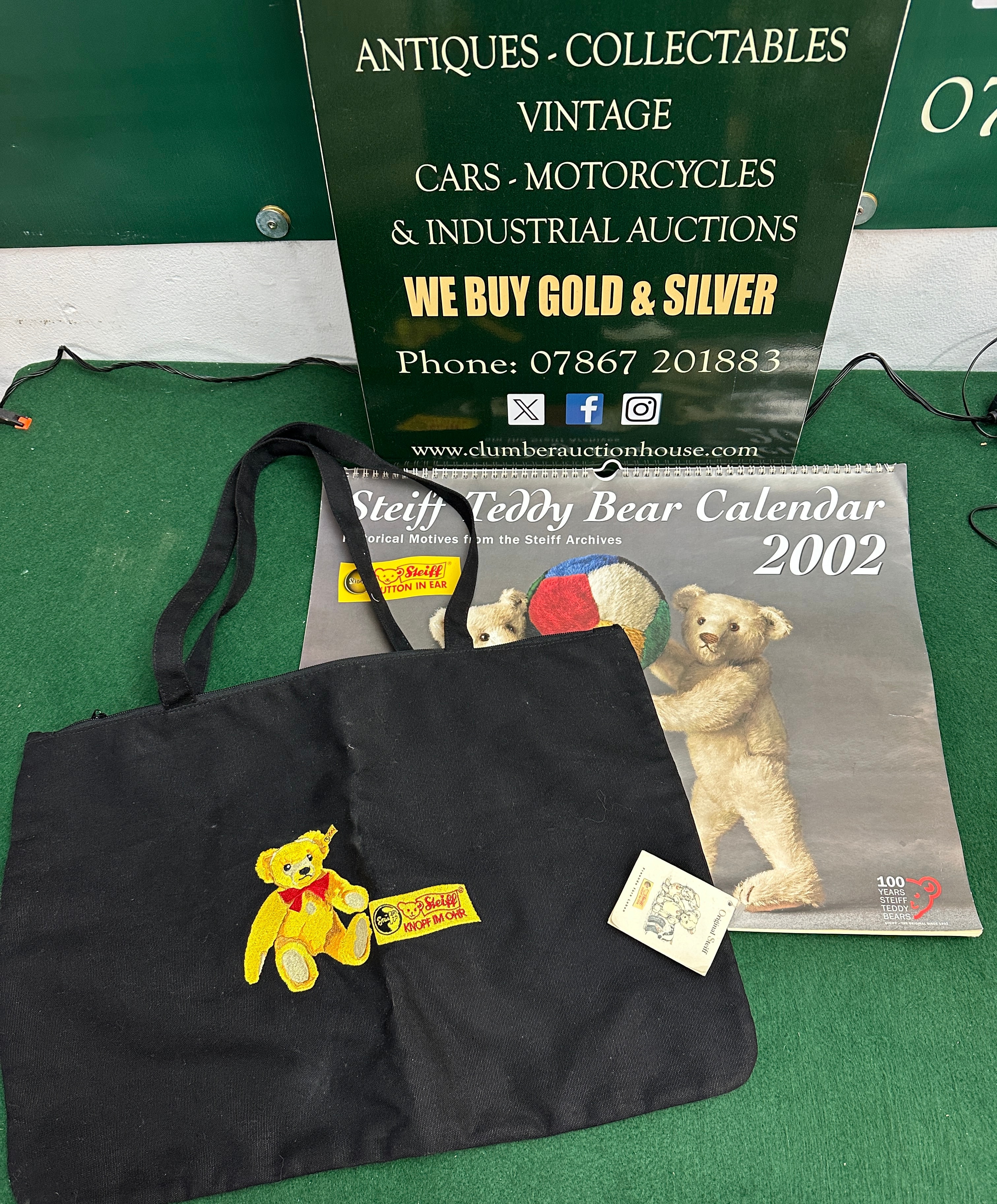 A Steiff Teddy Bear Tote Bag, crafted from black fabric with a zippered closure and carrying handles. The bag is adorned with an embroidered yellow Steiff teddy bear featuring a red bow and the prominent “Steiff Knopf Im Ohr” (Button in Ear) logo. This lot is accompanied by a spiral-bound “Steiff Teddy Bear Calendar 2002,” which highlights “Historical Motives from the Steiff Archives” and commemorates “100 YEARS STEIFF – THE ORIGINAL SINCE 1902,” depicting a large, light-colored teddy bear on its cover. Also included is a small white folded booklet or hang tag, marked “Original Steiff.”