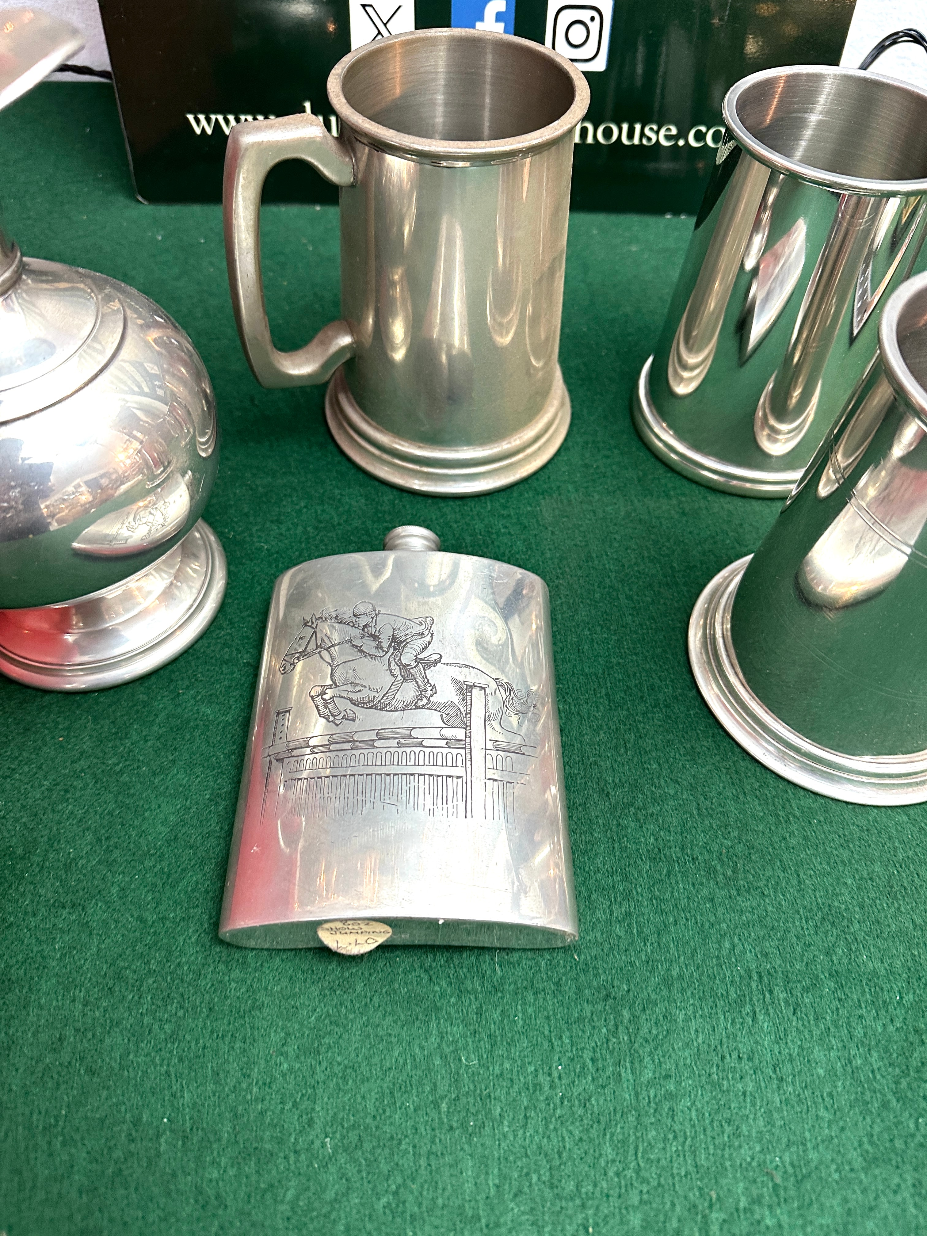 A collection of six items crafted from pewter, exhibiting a traditional or vintage style. The lot comprises one footed ewer or jug with a handle and hinged lid; two handled tankards with flared bases, consistent with examples identified in market research as ‘Pewter Tankards with Glass Bottoms’; and two conical, unhandled vessels, possibly functioning as measures or beakers, also with flared bases. Completing the set is a rectangular hip flask featuring a screw-top cap and an engraved scene depicting two horses jumping a hurdle. A small white sticker on the flask reads ‘102, Suncap, G-L-G’; no other manufacturer’s marks or hallmarks are visibly discernible.
