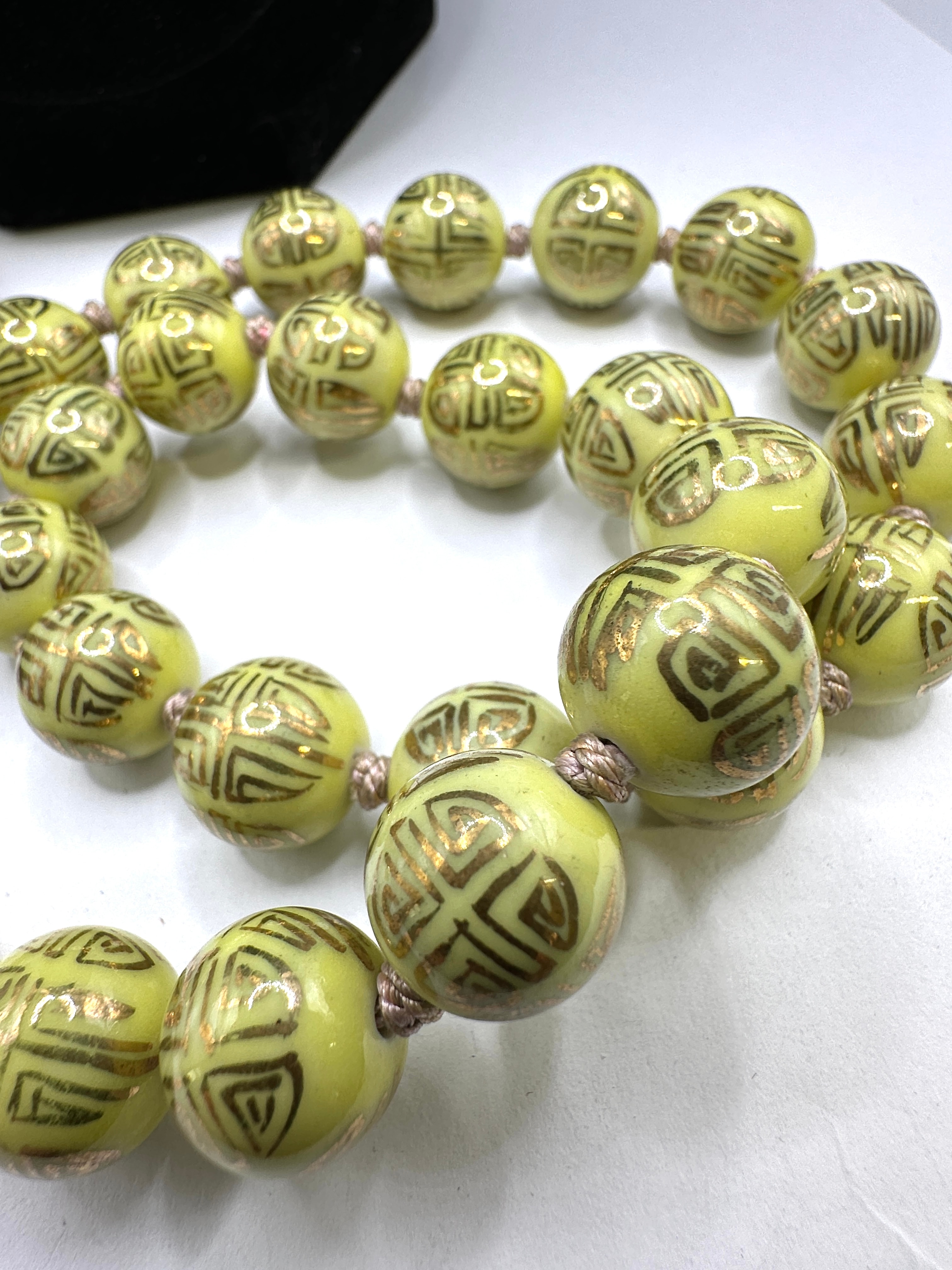 A necklace composed of numerous spherical beads, each strung individually on a light pink/purple cord. The beads are of uniform size and feature a light yellowish-green glazed surface. Each bead is adorned with a repeating, stylized geometric pattern rendered in a metallic, gold-colored pigment, which closely resembles the Chinese character “Shou” (壽), meaning “longevity.”