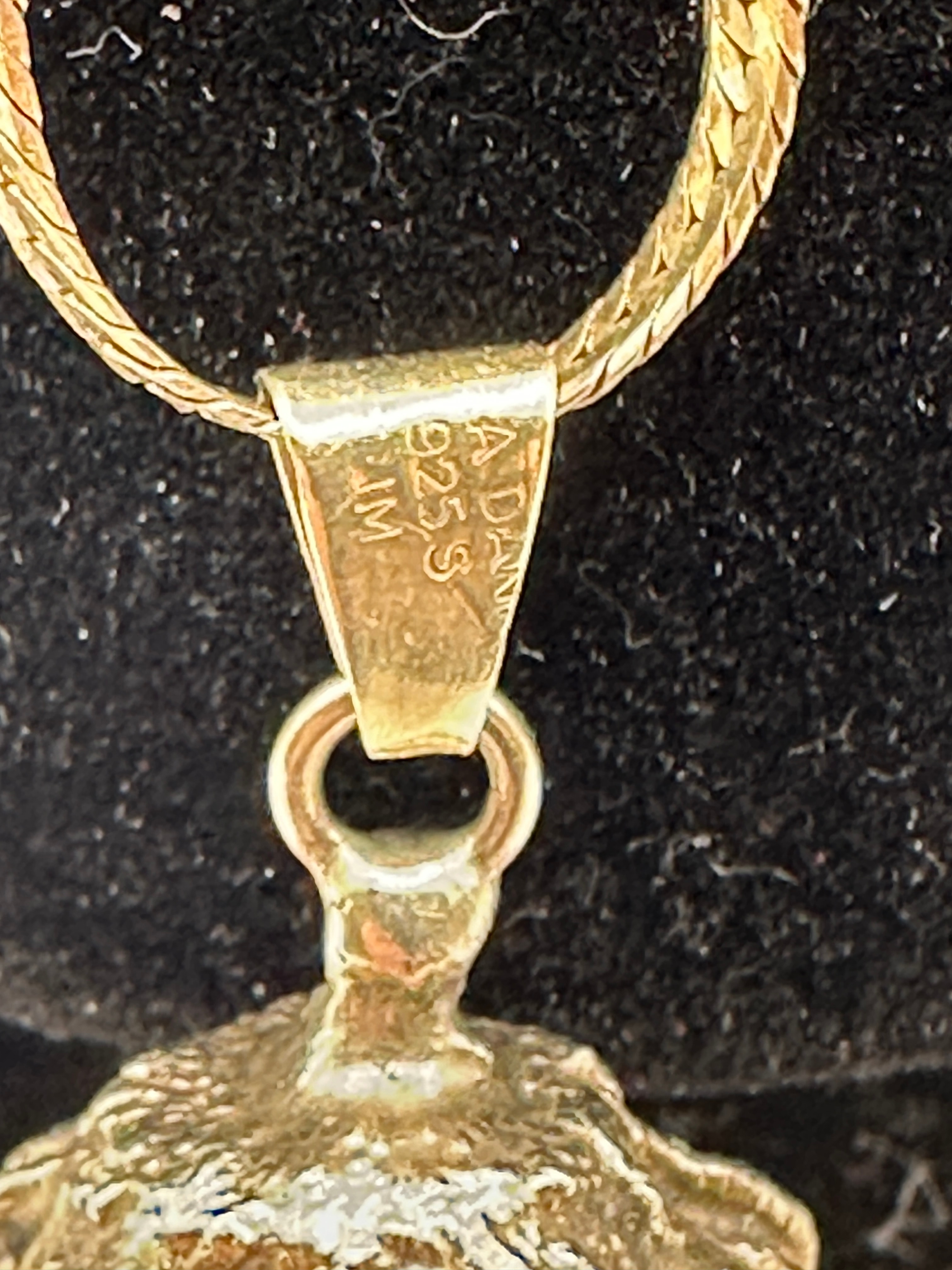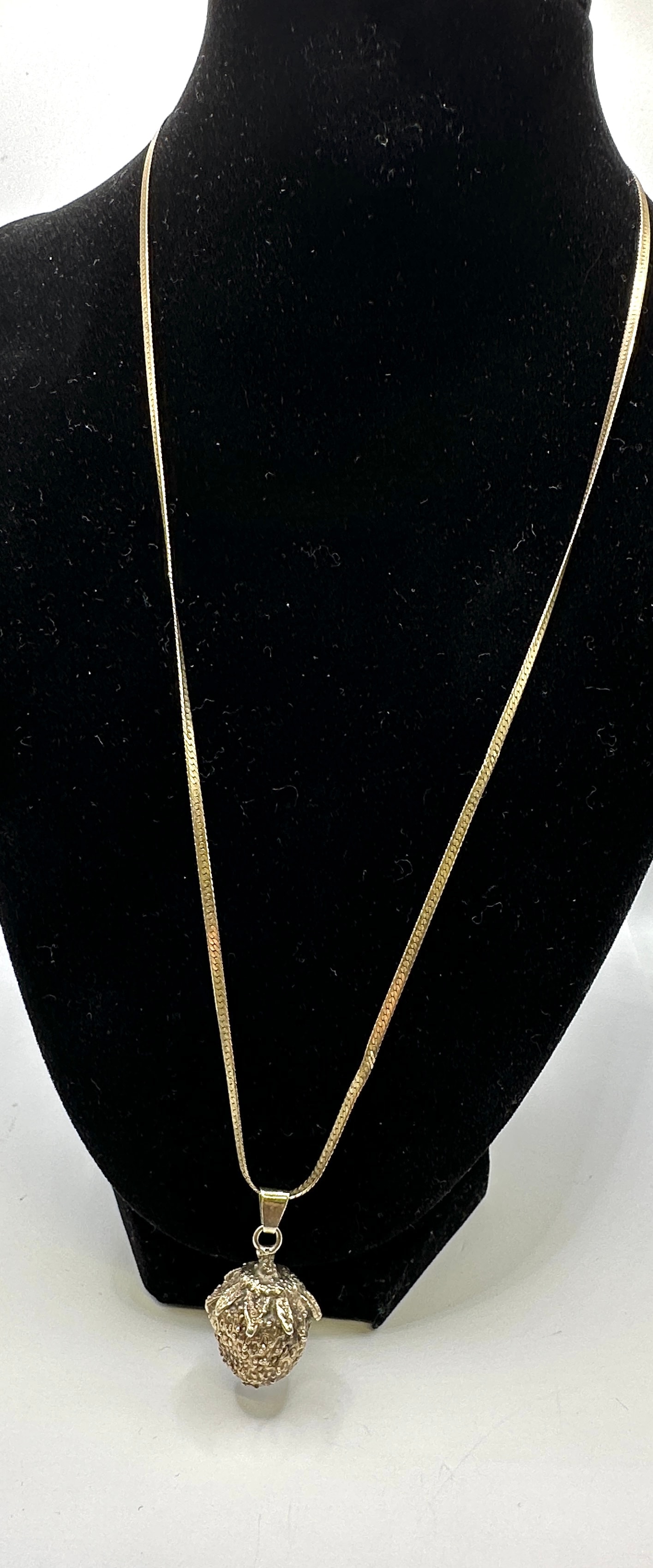 A necklace comprised of a flat, gold-toned chain, likely a herringbone or snake style, suspending a spherical, silver-toned pendant. The pendant exhibits an organic, naturalistic design, resembling a textured berry or fruit, detailed with numerous granular bumps across its surface and several leaf-like elements at its top. The pendant is joined to the chain by a triangular bail, clearly marked ‘ADAN 925 S.M’. As confirmed, the item’s materials are 925 silver, indicating the gold-toned chain is likely gold-plated sterling silver, complementing the sterling silver bail and silver-toned pendant.