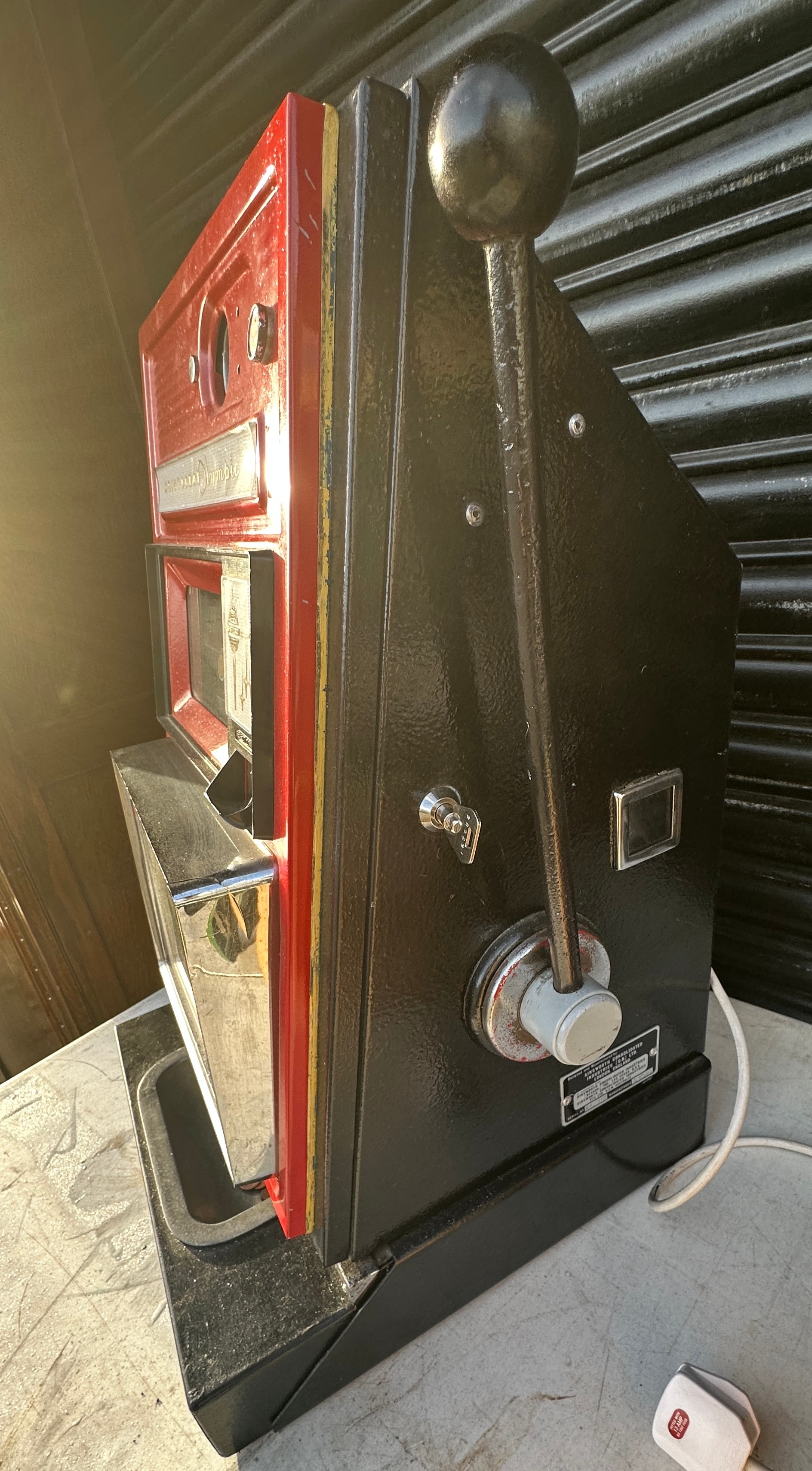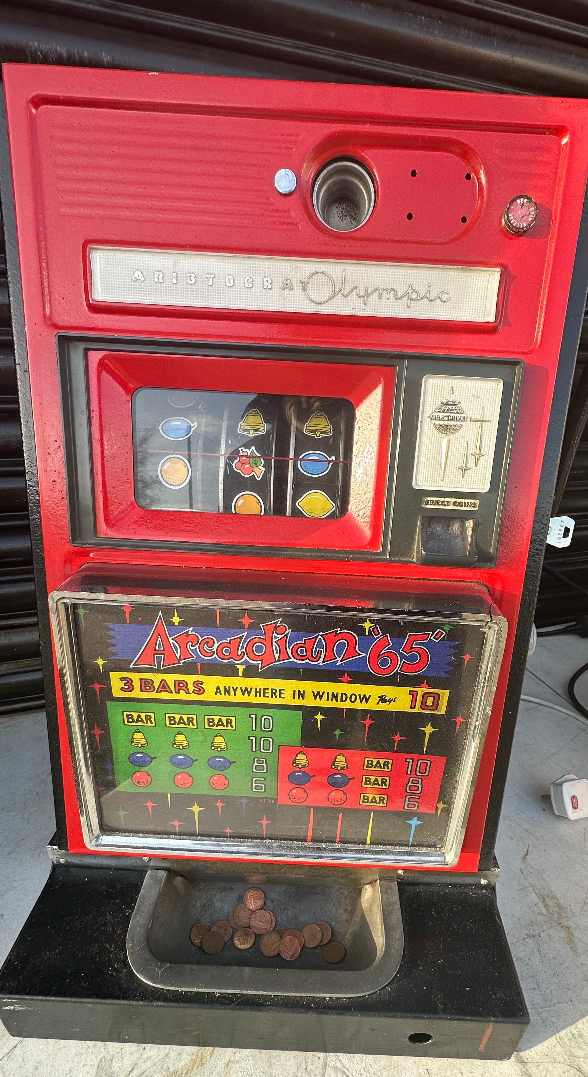 An Aristocrat Arcadian ’65 Penny Slot Machine, also known as a “one-armed bandit,” featuring a red and black painted metal cabinet with chromed accents. The machine incorporates a three-reel mechanism displaying fruit (cherry, lemon, orange, plum), bell, and “BAR” symbols, visible through a glass panel. Below the reels, a secondary glass display panel is prominently marked “Arcadian ’65” in a stylized font, detailing the payout schedule for various combinations, including “3 BARS ANYWHERE IN WINDOW pays 10”. A coin entry slot is visible, partially marked “INSERT COINS,” and a large, black-handled lever is positioned on the right side. The coin tray at the base contains several copper-colored coins. A manufacturer’s label is partially visible on the side panel. An electrical cord with a modern UK plug is also present.