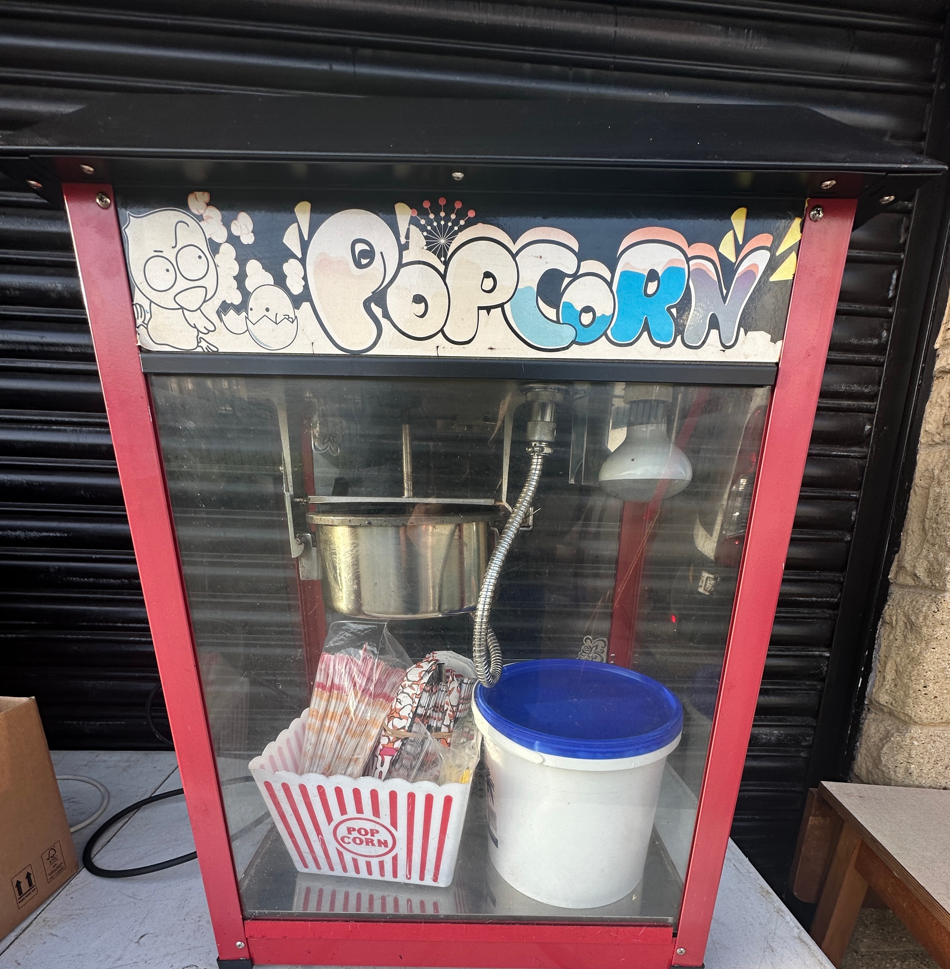 This modern, freestanding popcorn machine is designed for commercial or large-capacity home use. It features a red-painted metal frame and glass panels enclosing the main compartment. The black top section includes a decorative panel displaying stylized, colorful bubble letters spelling “POPCORN” alongside cartoon illustrations of chicks and popcorn kernels. Internally, the machine houses a stainless steel popping pot with a heating element and an integrated light. Accessories accompanying the machine include a white and red striped plastic serving tray labeled “POP CORN” and a white plastic bucket with a blue lid.