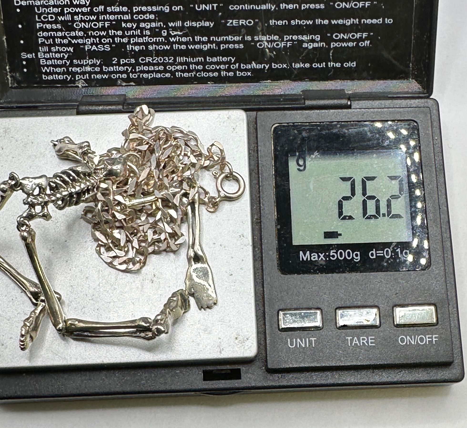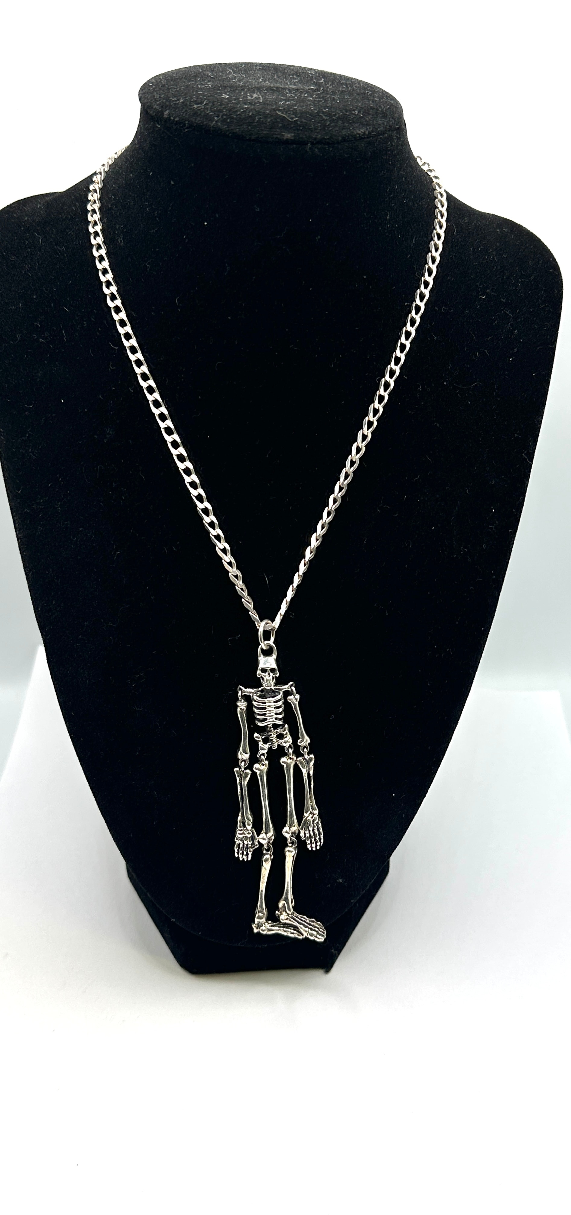 A contemporary necklace crafted from 925 silver, featuring a detailed full-body skeleton pendant. The pendant is suspended from a curb-link chain. No manufacturer’s marks or material hallmarks are discernible on the jewelry itself.