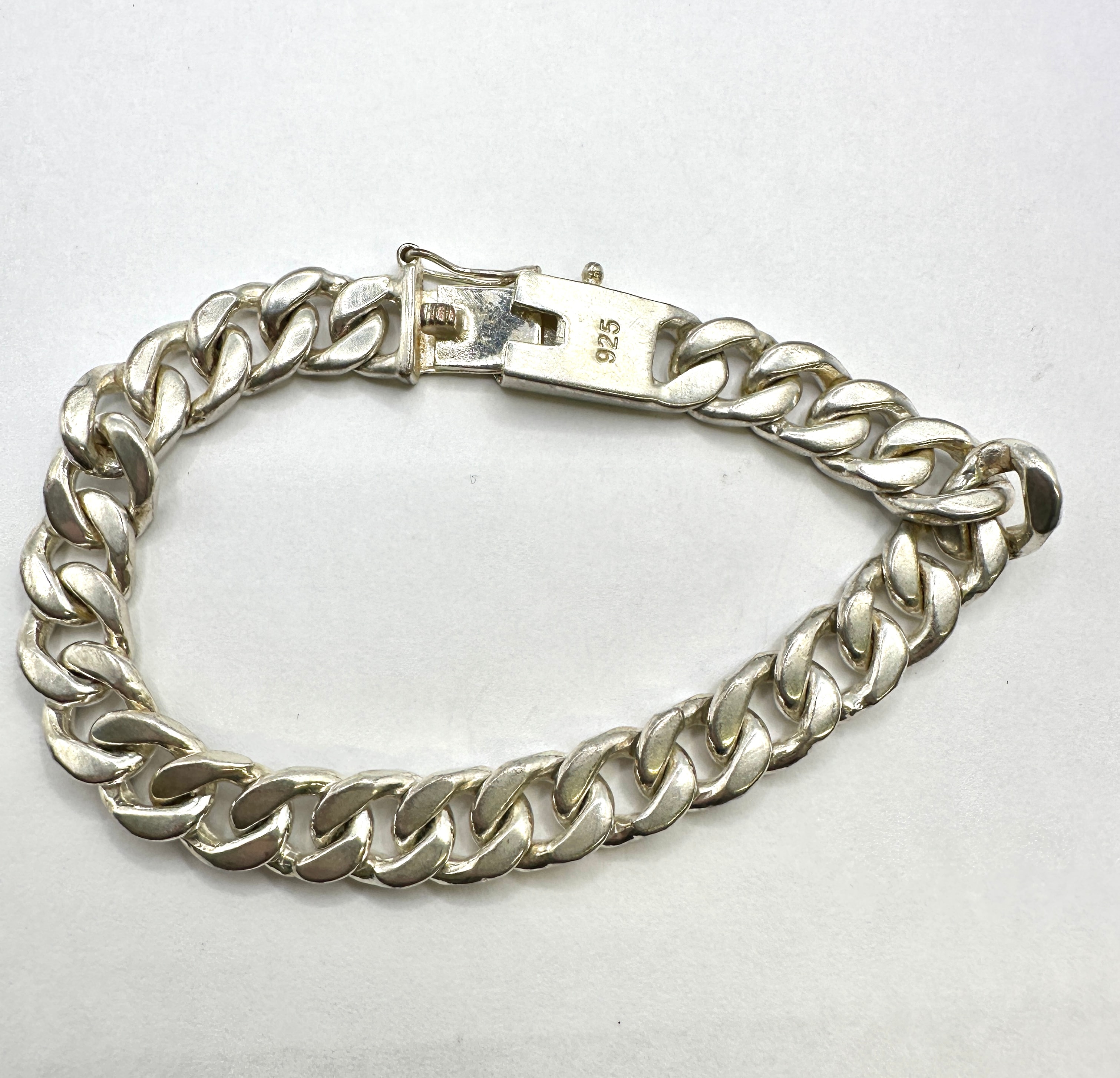 A heavy sterling silver 925 Cuban curb chain link bracelet, featuring interlocked, flattened, and twisted oval links, fastened by a lobster claw clasp with a safety bar. The bracelet is crafted from 925 silver.