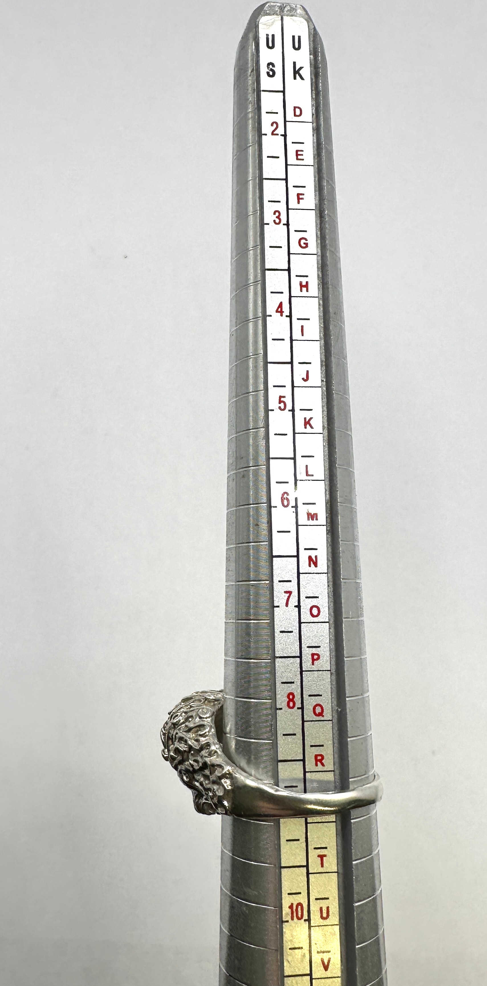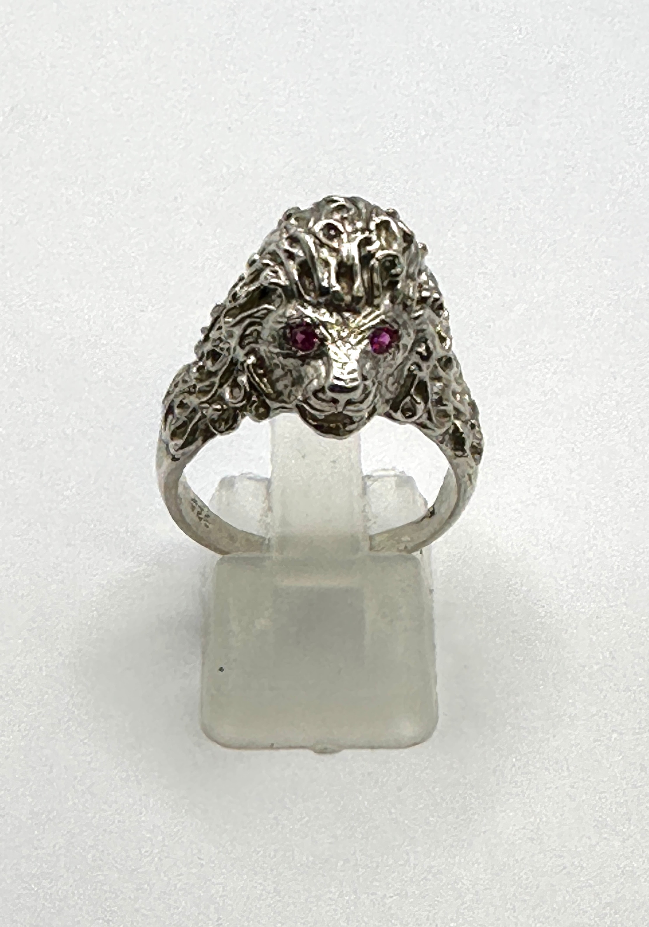 A Men’s 925 Silver Animal Head Ring with Ruby Eyes. Crafted from 925 silver, this ring features a detailed three-dimensional lion’s head design as its primary motif. The lion’s eyes are set with two small, round, red stones. No distinct maker’s marks or other text are visible on the ring itself.