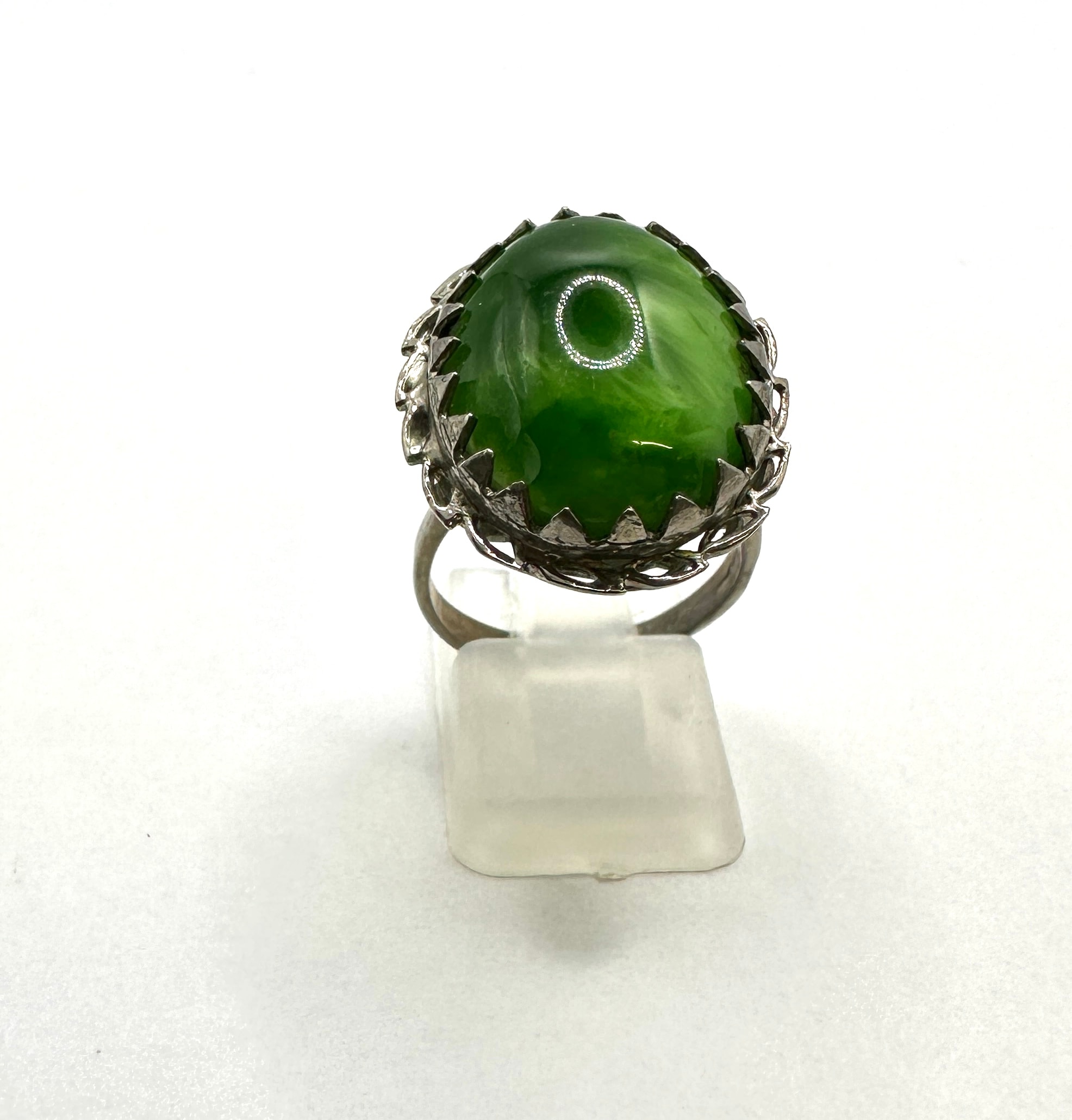 A vintage-style ring crafted from 925 silver, featuring a prominent jade cabochon. The ring features a high-domed oval cabochon stone with a mottled, translucent to opaque deep green color, exhibiting visible internal swirling patterns. The stone is set within an elaborate, openwork bezel of 925 silver, detailed with decorative pierced or filigree-like elements, atop a simple, polished band of the same material. No discernible hallmarks or manufacturer’s marks are clearly visible on the ring’s exterior surfaces.