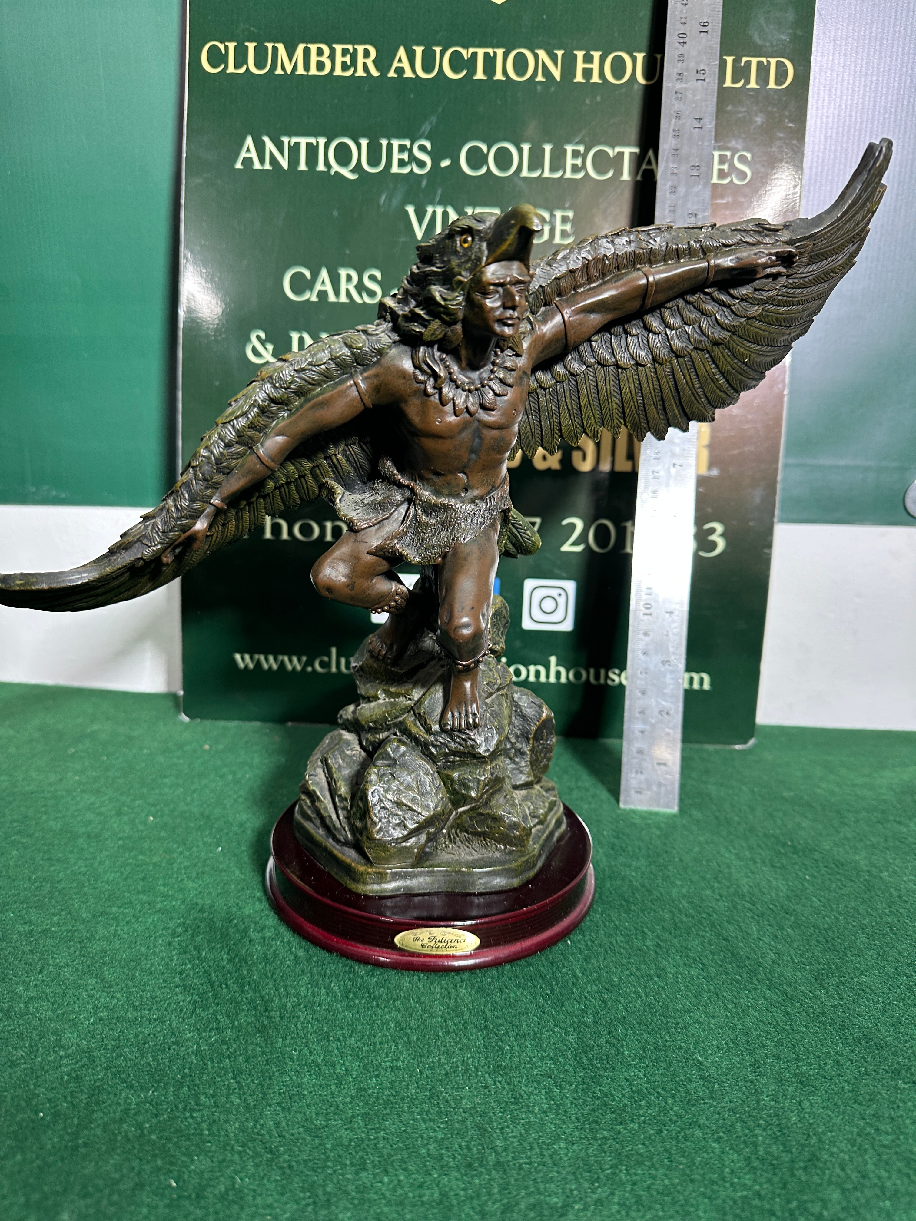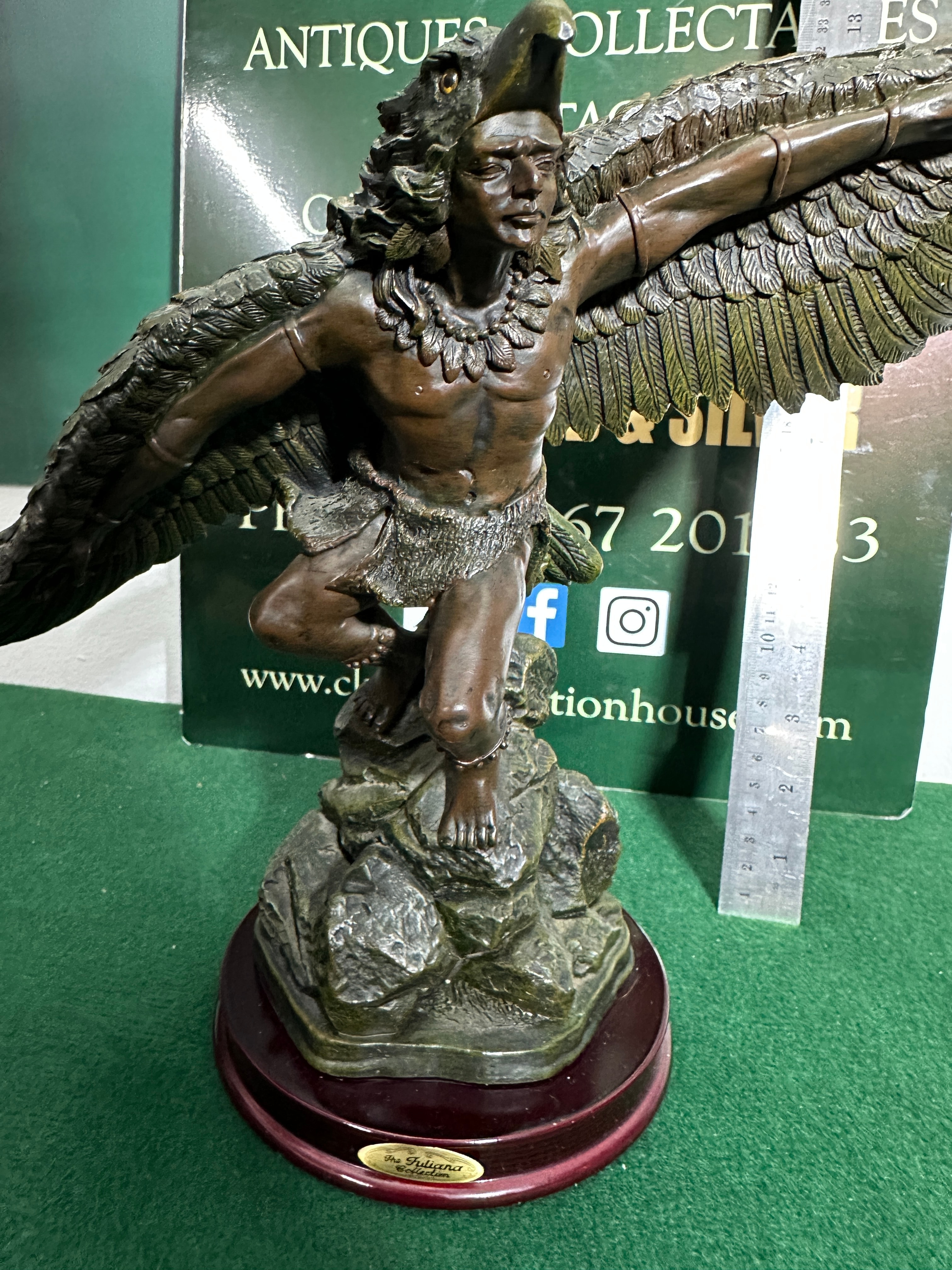 A statuette titled ‘The Owyhee’ by Christopher A. Pardell, from the Legacy Collection, dated 1989. This late 20th-century figurative statuette is crafted from bronze or a bronze-finished resin and mounted on a polished dark wood base. The piece depicts a male winged figure, possibly an eagle shaman or mythical being, captured in a dynamic, ascending pose. The figure wears an eagle-head headdress, a necklace, and a loincloth, and stands on a textured rock-like formation which forms part of the sculptural base.