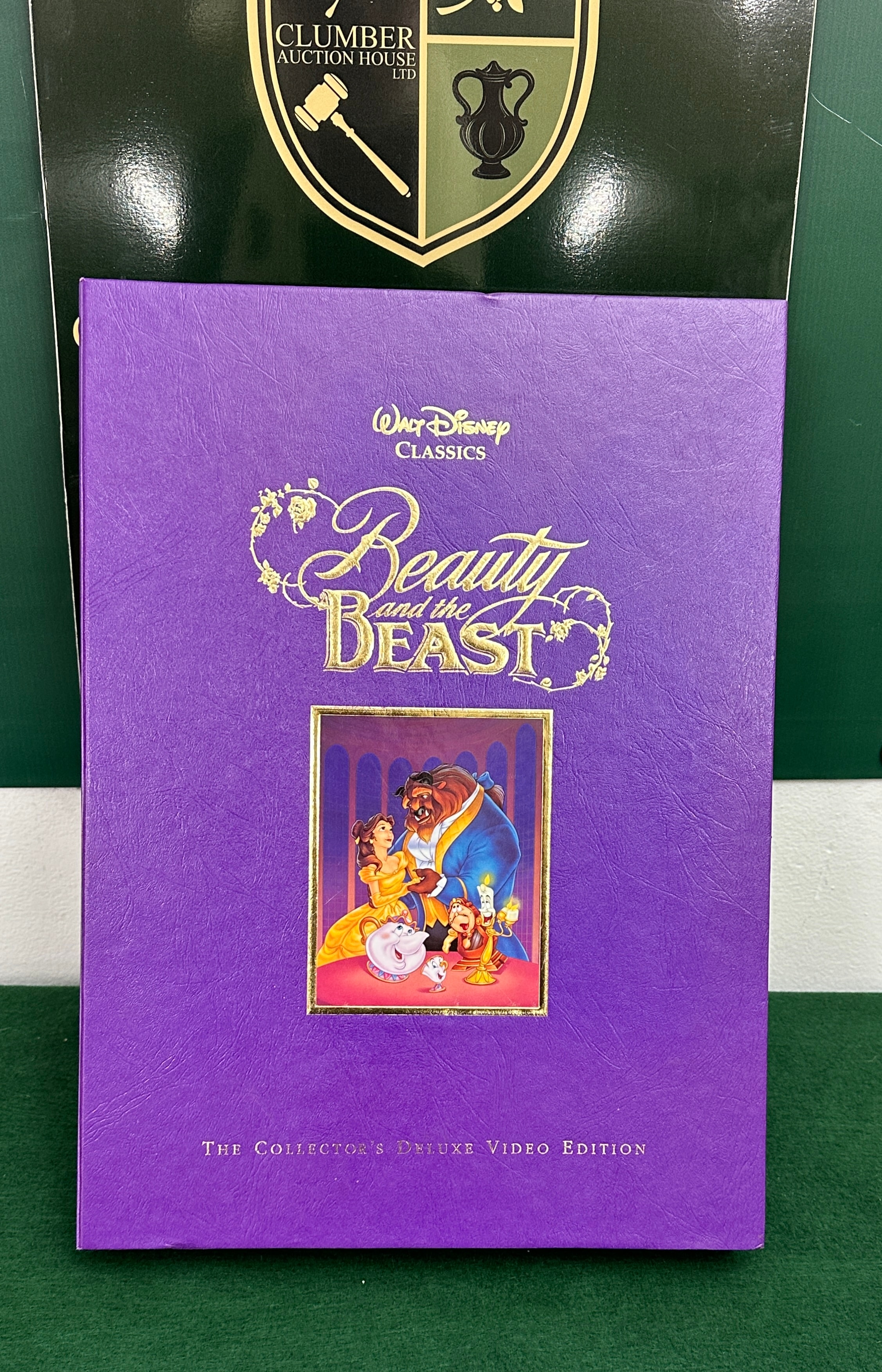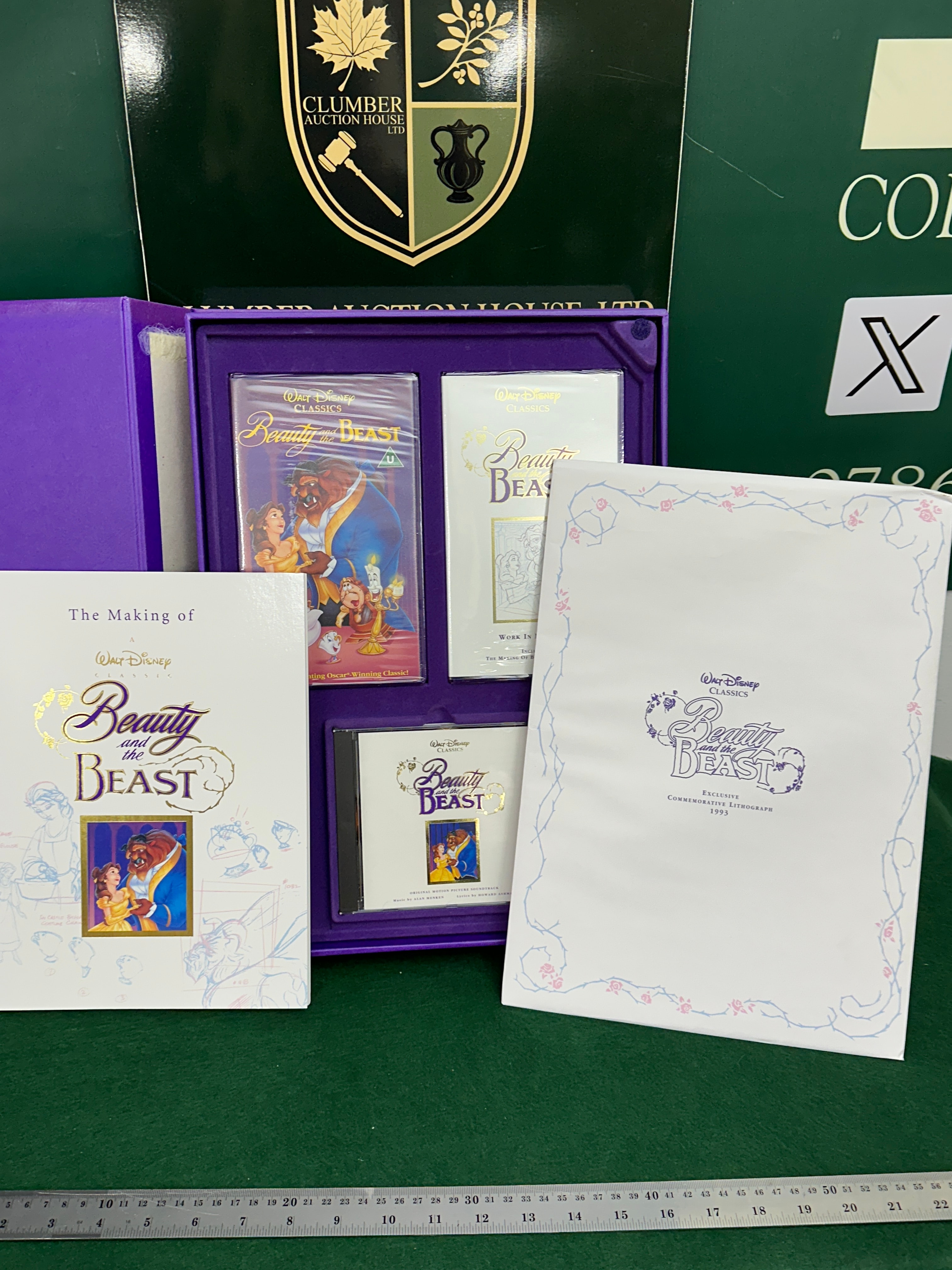 Walt Disney’s Beauty and the Beast: The Collector’s Deluxe Video Edition. This set is presented in a textured purple faux-leather or paperboard box with gilt lettering and an illustration on the front, featuring the “Walt Disney Classics” branding. The set includes a standard VHS tape of the film, a second white-sleeved video cassette, a bound softcover book titled “The Making of Walt Disney Beauty and the Beast,” a small framed commemorative pin or plaque, and a flat white envelope containing a “COMMEMORATIVE LITHOGRAPH.” The overall style is consistent with high-end home video releases from the late 20th century.