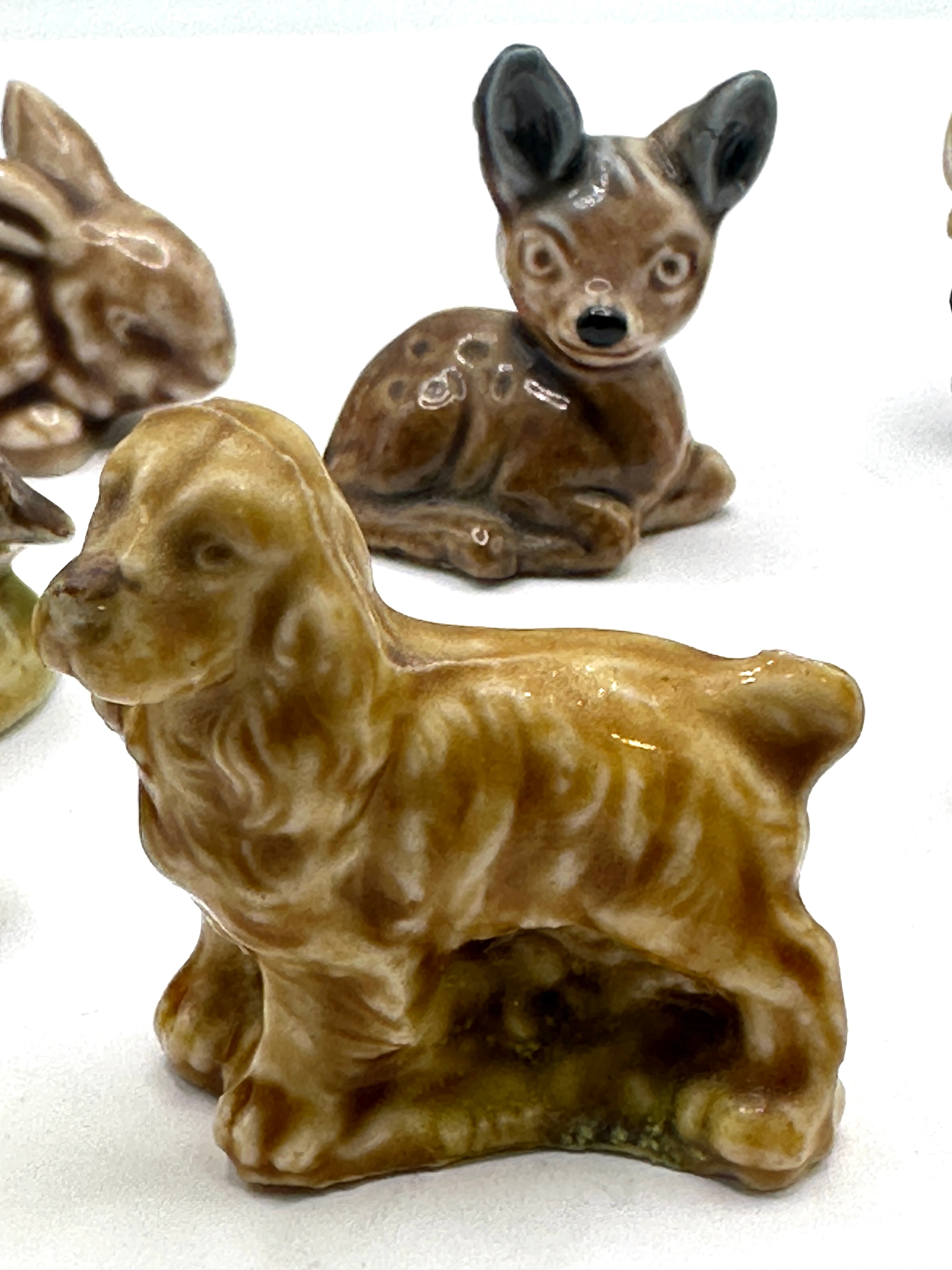 A collection of twelve Wade Whimsies Red Rose Tea animal figurines, crafted from glazed porcelain. The group features a variety of domestic and wild animals including a rabbit, pelican, fish, deer, horse, several distinct dog figurines, a lamb, a bear, a cat, a bird, and a hedgehog. Each figurine is rendered in a consistent, stylized manner, predominantly in earthy tones of brown, beige, and grey. The base of at least one figurine is impressed with the manufacturer’s stamp ‘WADE PORCELAIN’ and ‘MADE IN ENGLAND’, followed by a single character, possibly an ‘S’ or ‘G’.