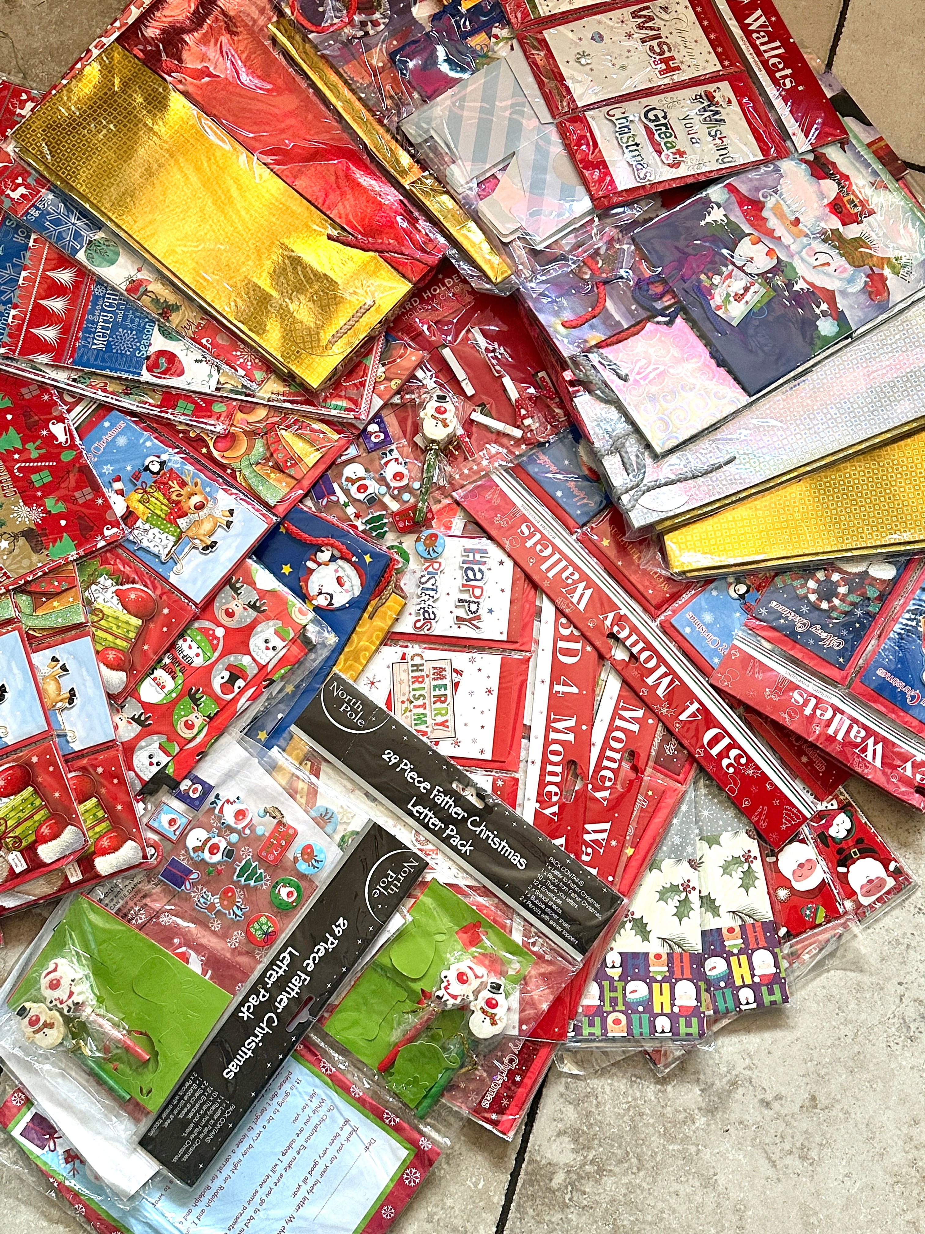 A collection of contemporary Christmas-themed stationery and craft items. The lot includes multiple “North Pole” branded “29 Piece Father Christmas Letter Packs,” each detailing its contents as “Letter to Father Christmas,” “Reply from Father Christmas,” “Thank you letters,” “Envelopes,” “Stencil sheets,” “Bubble sticker sheet,” and “Pencils with eraser toppers.” A section of the sample letter reads: “It is going to be a very busy night for Rudolph and I. Once you are asleep I will leave some presents under the tree for you. Please don’t forget to leave a carrot for Rudolph and a mince pie for me.” Also present are numerous money wallets (some marked “Wallets” or “3D 4 Money Wallets,” often with “includes envelopes”), assorted greeting cards featuring Santa Claus, reindeer, snowmen, and festive patterns, along with gift bags, sticker sheets, small pencils, pencil toppers, and small decorative clips. The items are primarily constructed from paper and cardstock, with plastic components used for packaging, stickers, and various accessories.