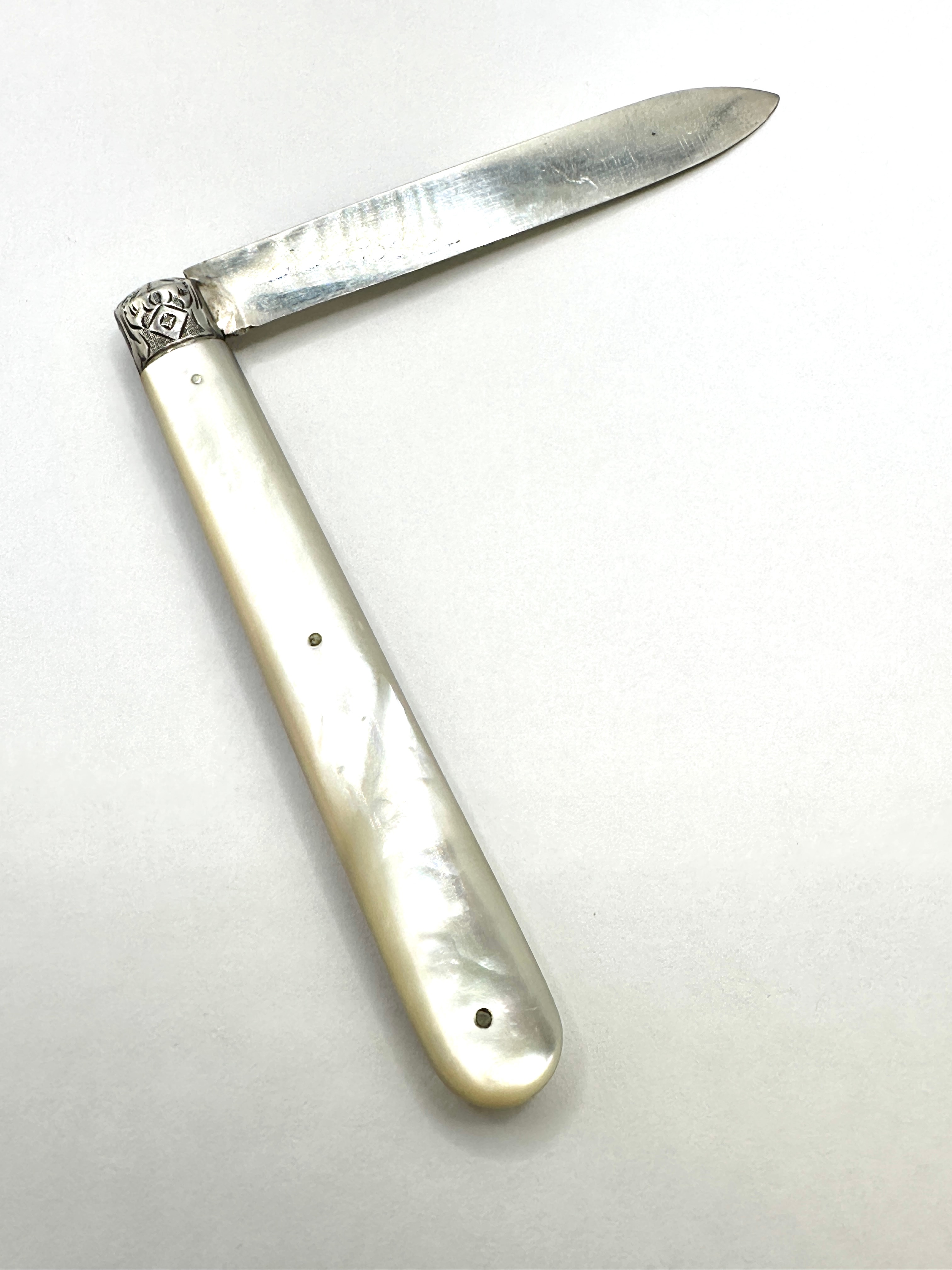 A Sheffield 925 silver blade and mother-of-pearl fruit knife. This folding pocket knife features a single 925 silver blade, visibly marked with the numbers “1894” and impressed hallmarks near the hinge, including a lion passant, an assay mark, and maker’s initials “DWD”. The handle scales are crafted from mother-of-pearl. It has a decorated 925 silver bolster with a geometric pattern, also bearing hallmarks. One mother-of-pearl scale is set with a small rectangular 925 silver plaque, engraved with the text “T. C. BROWN / 1S-1-36”.