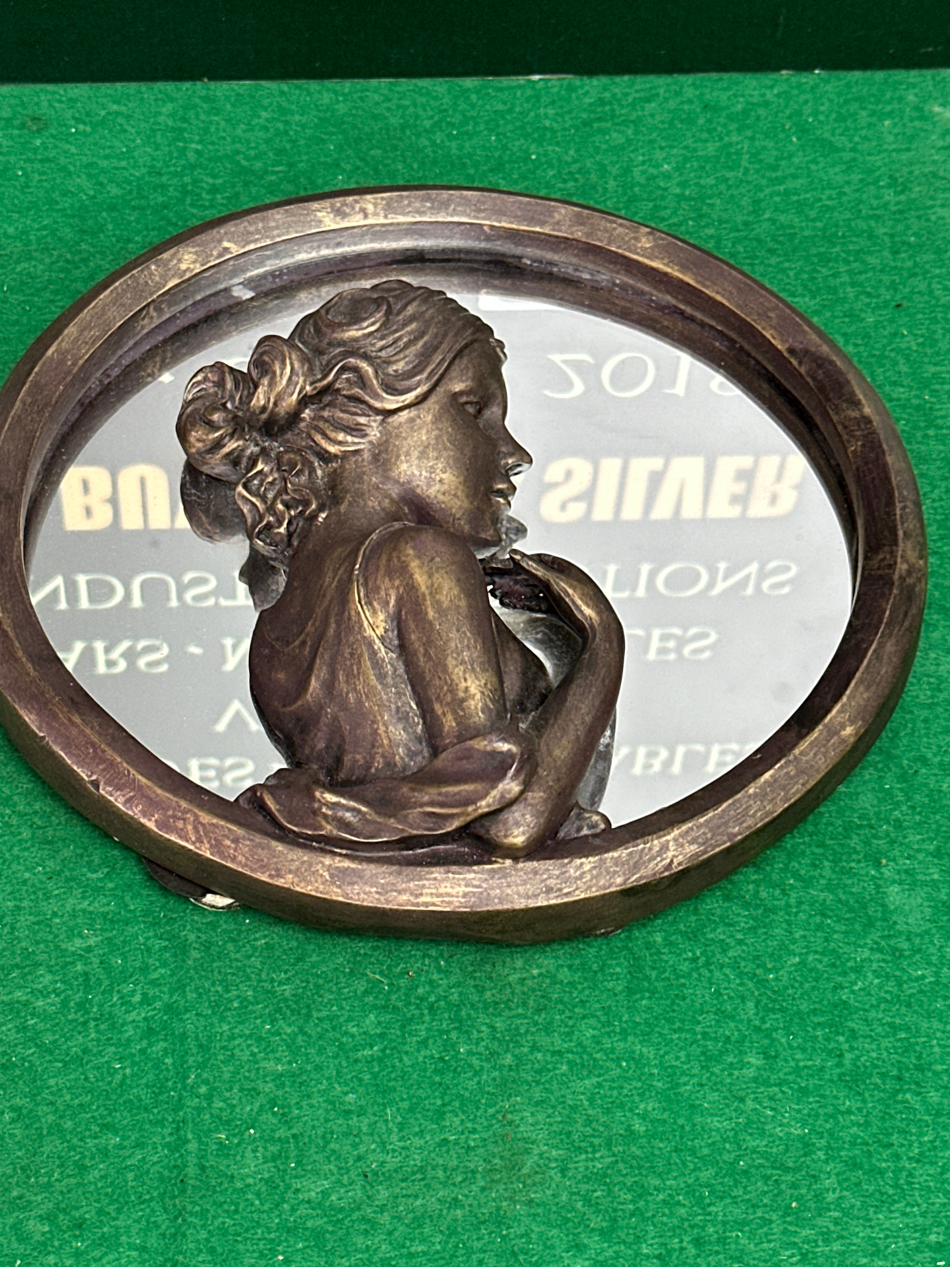 A relief mirror titled ‘Cherish’ by Bill Mack (American, b. 1949), dated 2001. This oval-shaped decorative tabletop mirror features a three-dimensional relief bust of a woman. The frame and the bust, rendered in a classical or neoclassical style with draped garments and an upswept hairstyle, are crafted from a patinated bronze or bronze-finished cast metal, surrounding a central mirrored surface. The item is equipped with a folding stand on the reverse for display.