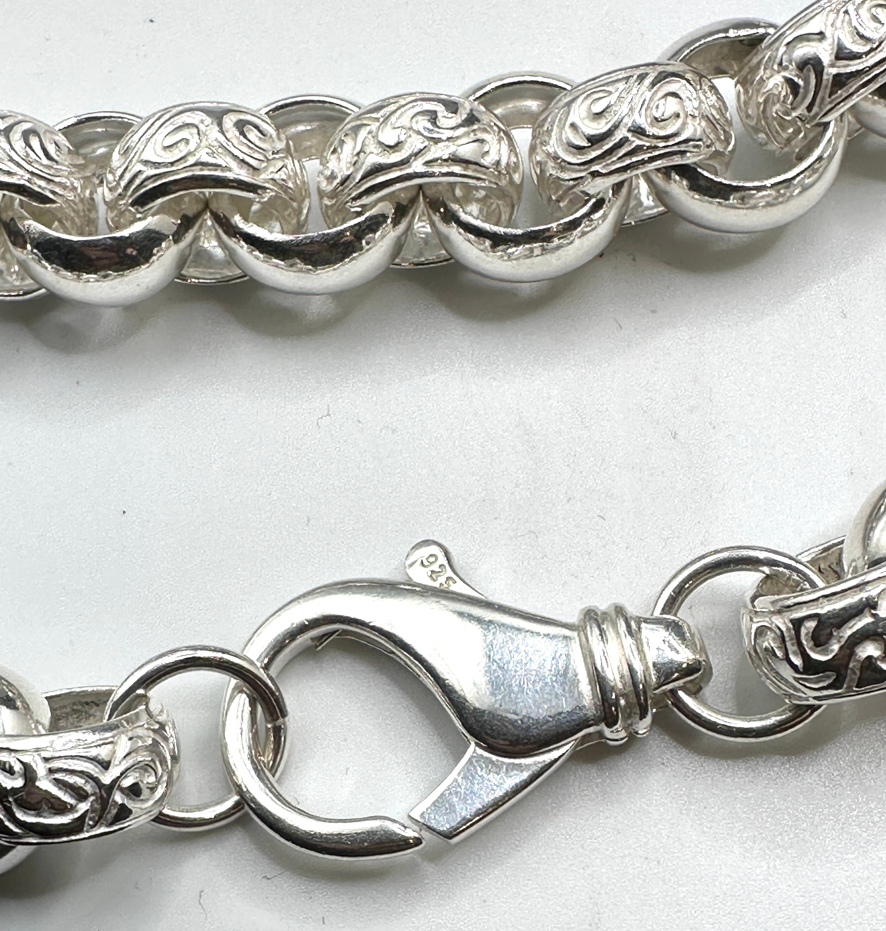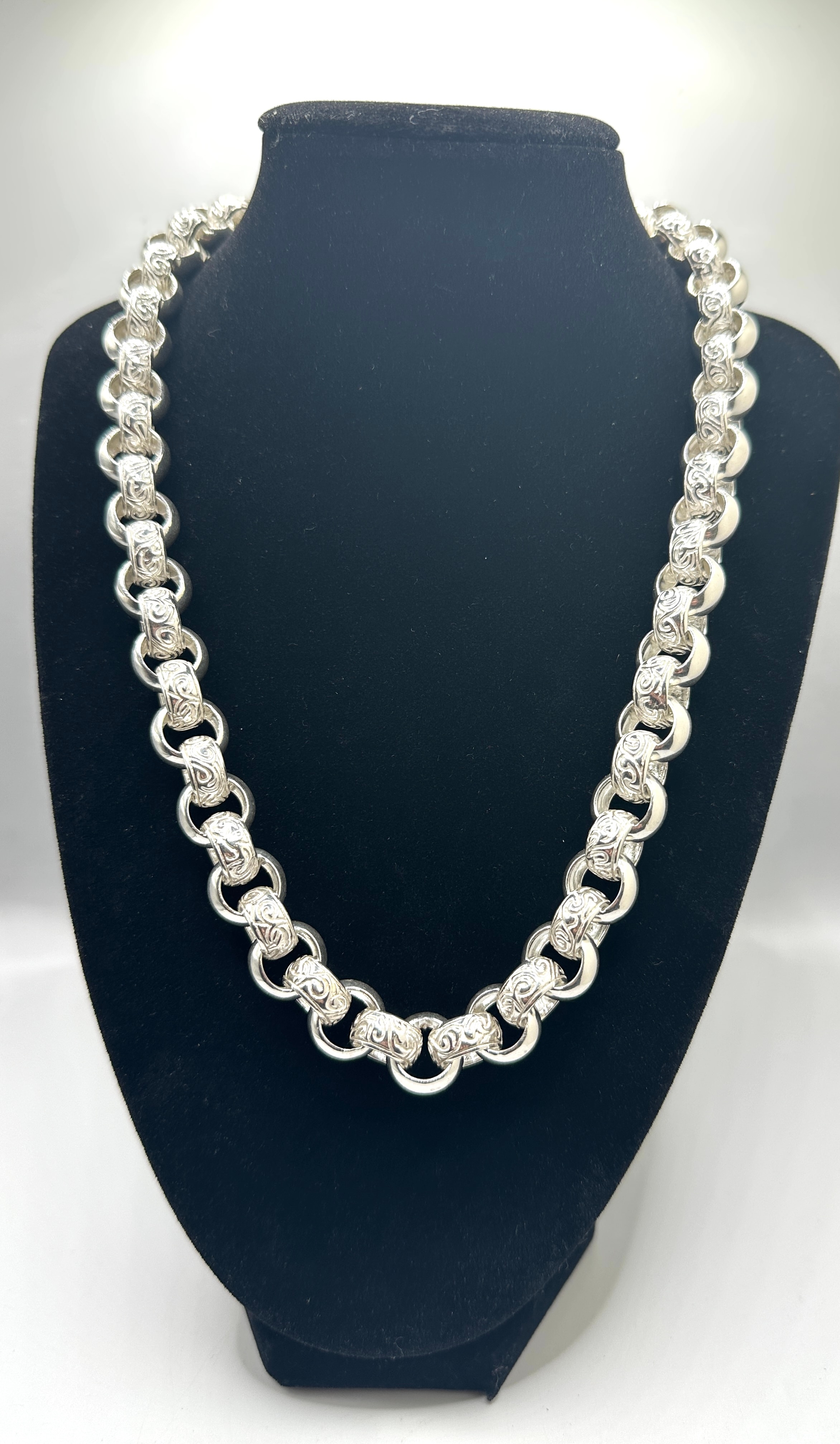 A 925 silver belcher chain necklace, featuring a substantial design composed of alternating smooth, polished round links and intricately engraved round links adorned with a swirling foliate pattern. The necklace is secured by a large lobster claw clasp, which is clearly hallmarked “925”.