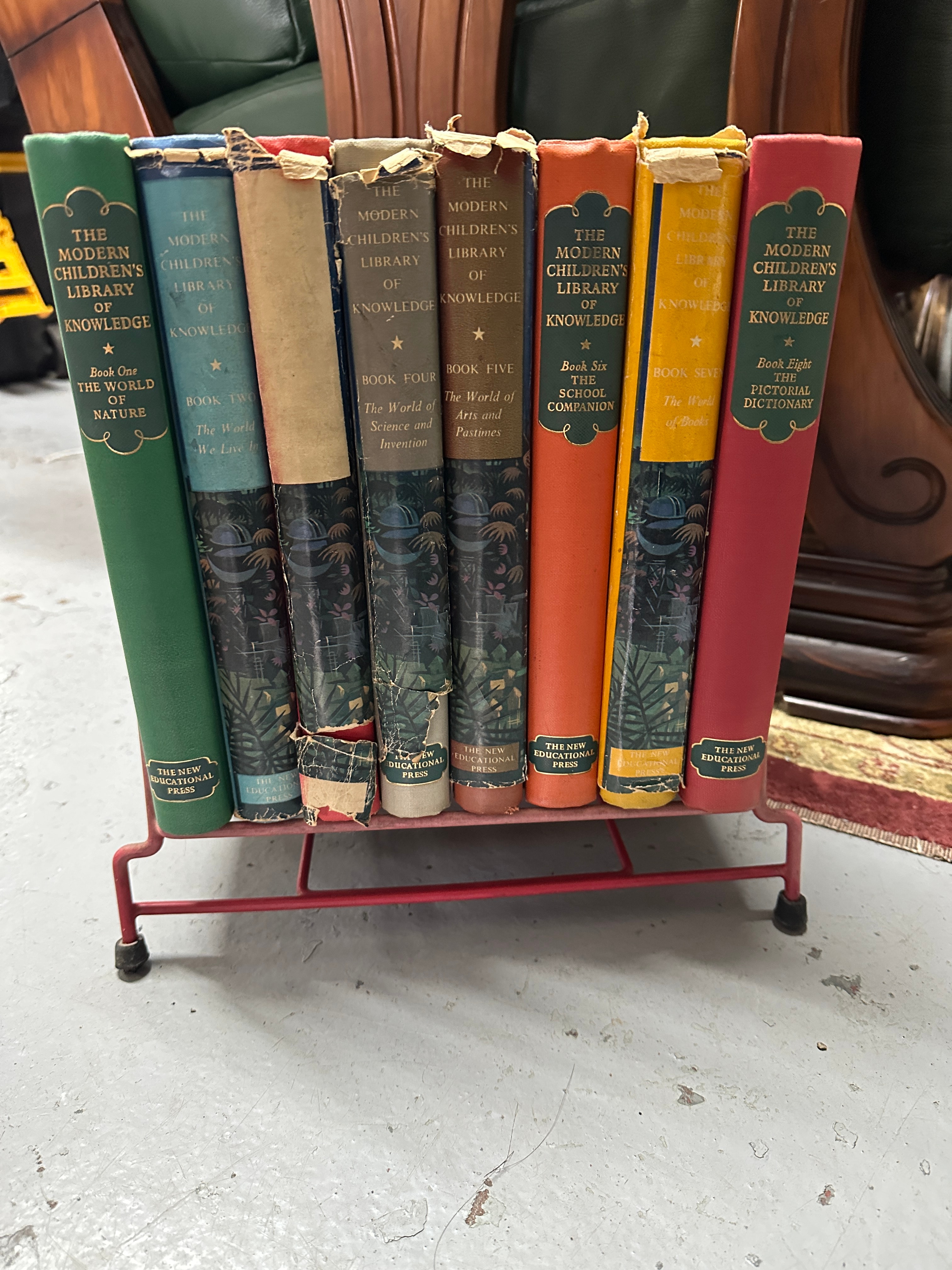 A set of eight hardcover books from “THE MODERN CHILDREN’S LIBRARY OF KNOWLEDGE” series, published by “THE NEW EDUCATIONAL PRESS,” presented within a red painted metal book rack. The books feature a mix of spine colors including green, light blue, grey, brown, orange, yellow, and red, with several volumes displaying a patterned lower spine design. Visible titles and numbering include “Book One THE WORLD OF NATURE,” “Book Two The World We Live In,” “Book Four The World of Science and Invention,” “Book Five The World of Arts and Pastimes,” “Book Six THE SCHOOL COMPANION,” “Book Seven The World of Books,” and “Book Eight THE PICTORIAL DICTIONARY.”