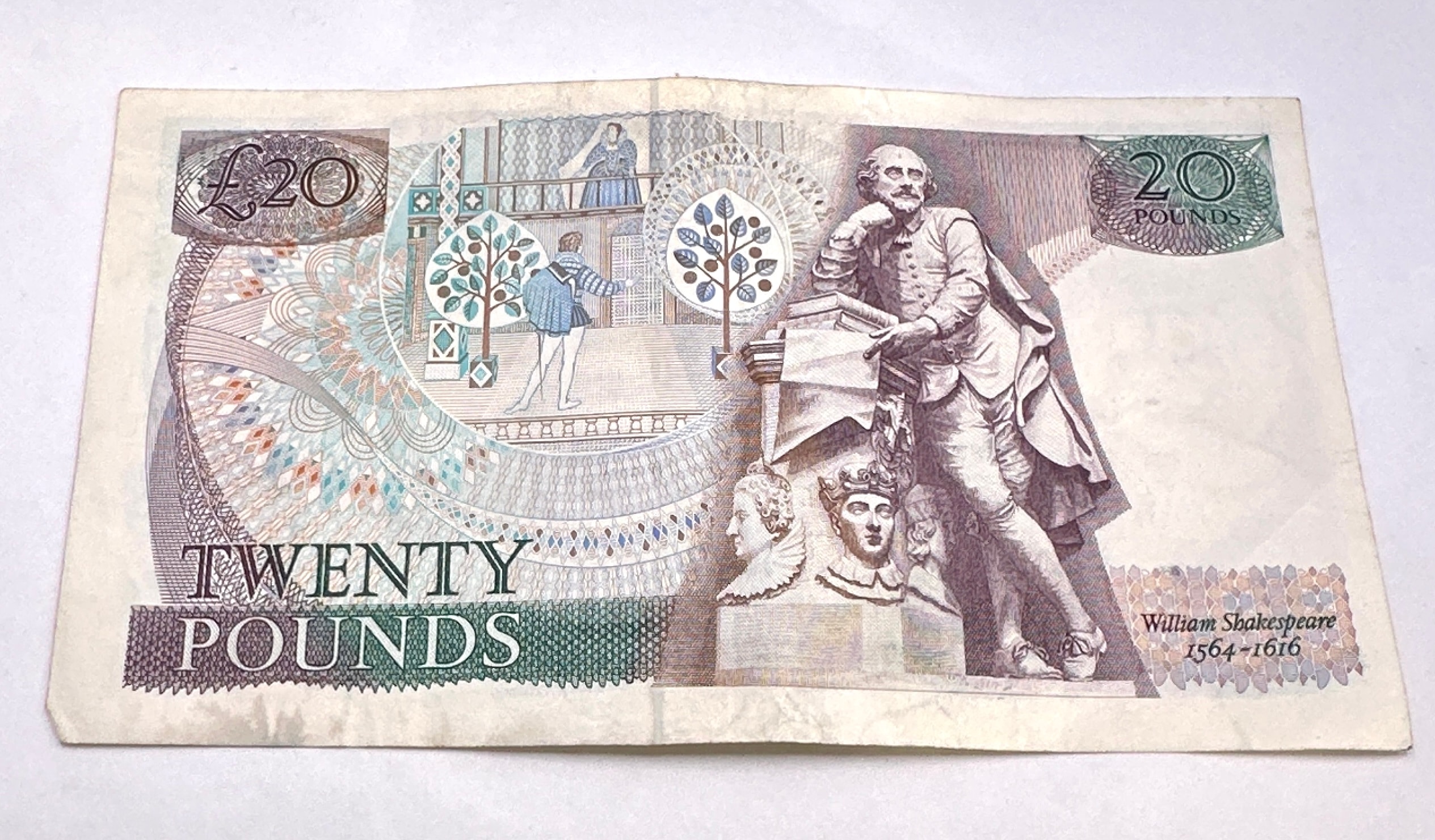 A circulated Bank of England Twenty Pounds banknote, issued circa 1970s-1980s, featuring Queen Elizabeth II and signed by D. H. F. Somerville, Chief Cashier. The obverse displays a portrait of Queen Elizabeth II, a depiction of St. George slaying the Dragon, and a seated allegorical figure. The serial number is “72E 174087”. Text includes “BANK OF ENGLAND” and “I PROMISE TO PAY THE BEARER ON DEMAND THE SUM OF TWENTY POUNDS”. The reverse prominently features a portrait of William Shakespeare, dated “1564-1616”, alongside a theatrical scene.