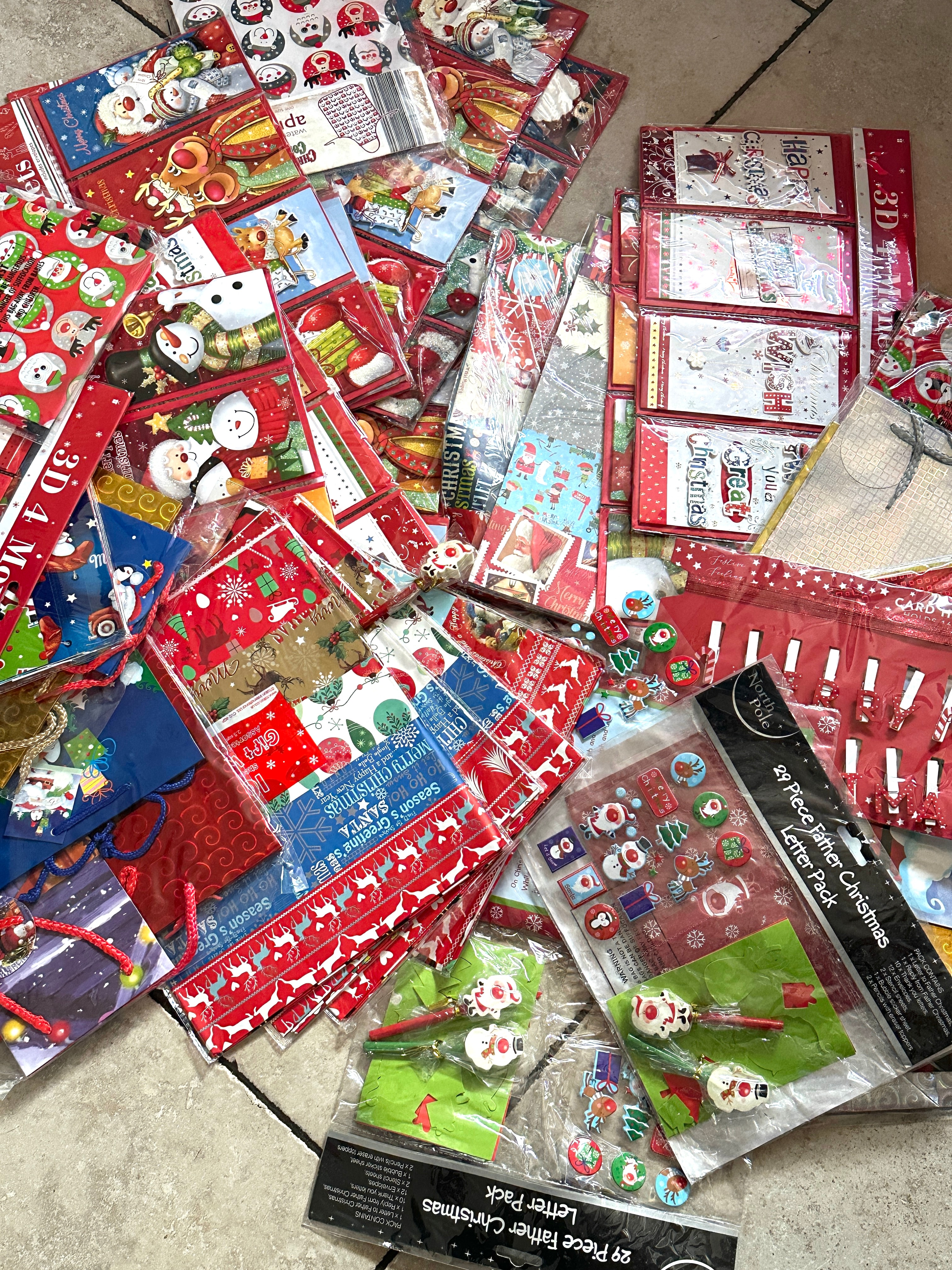 This large lot comprises new, packaged Christmas-themed stationery and accessories, designed in a contemporary, mass-produced style. The collection includes greeting cards (some noted as “3D”), gift bags, wrapping paper, sticker sheets, and “29 Piece Father Christmas Letter Packs.” The “29 Piece Father Christmas Letter Packs” contain items such as letters, reply forms, thank you letters, envelopes, stencil sheets, bubble stickers, and pencils with eraser toppers featuring Santa and snowmen. Dominant motifs include Santa Claus, snowmen, reindeer, festive patterns, gifts, and snowflakes, rendered in a vibrant palette of red, green, blue, and white. Visible text includes “Merry Christmas,” “Happy Christmas,” “Season’s Greetings,” “Ho Ho Ho!,” “North Pole,” and “Gift Assorted.” The items are primarily composed of paper, cardstock, and plastic packaging.