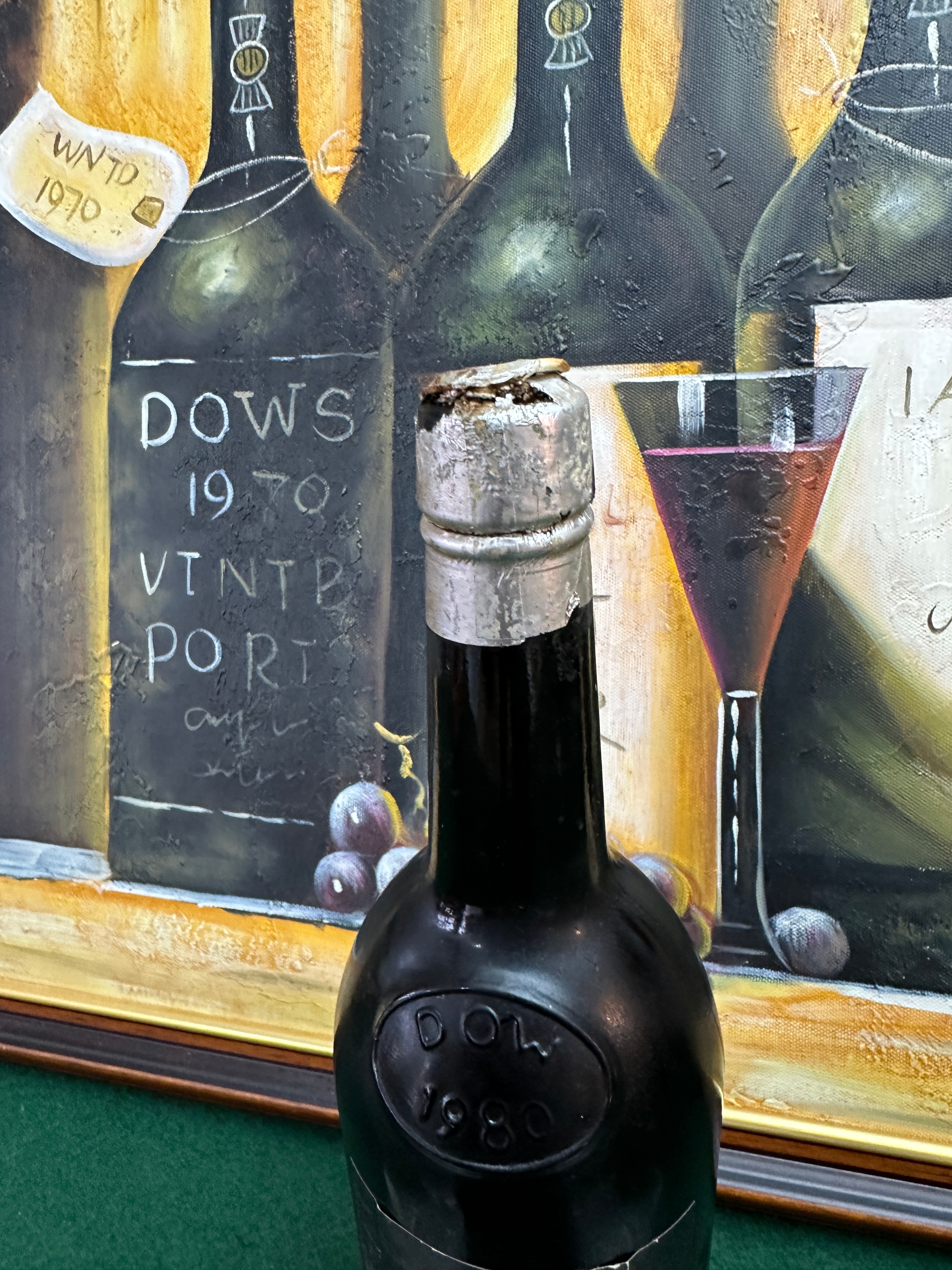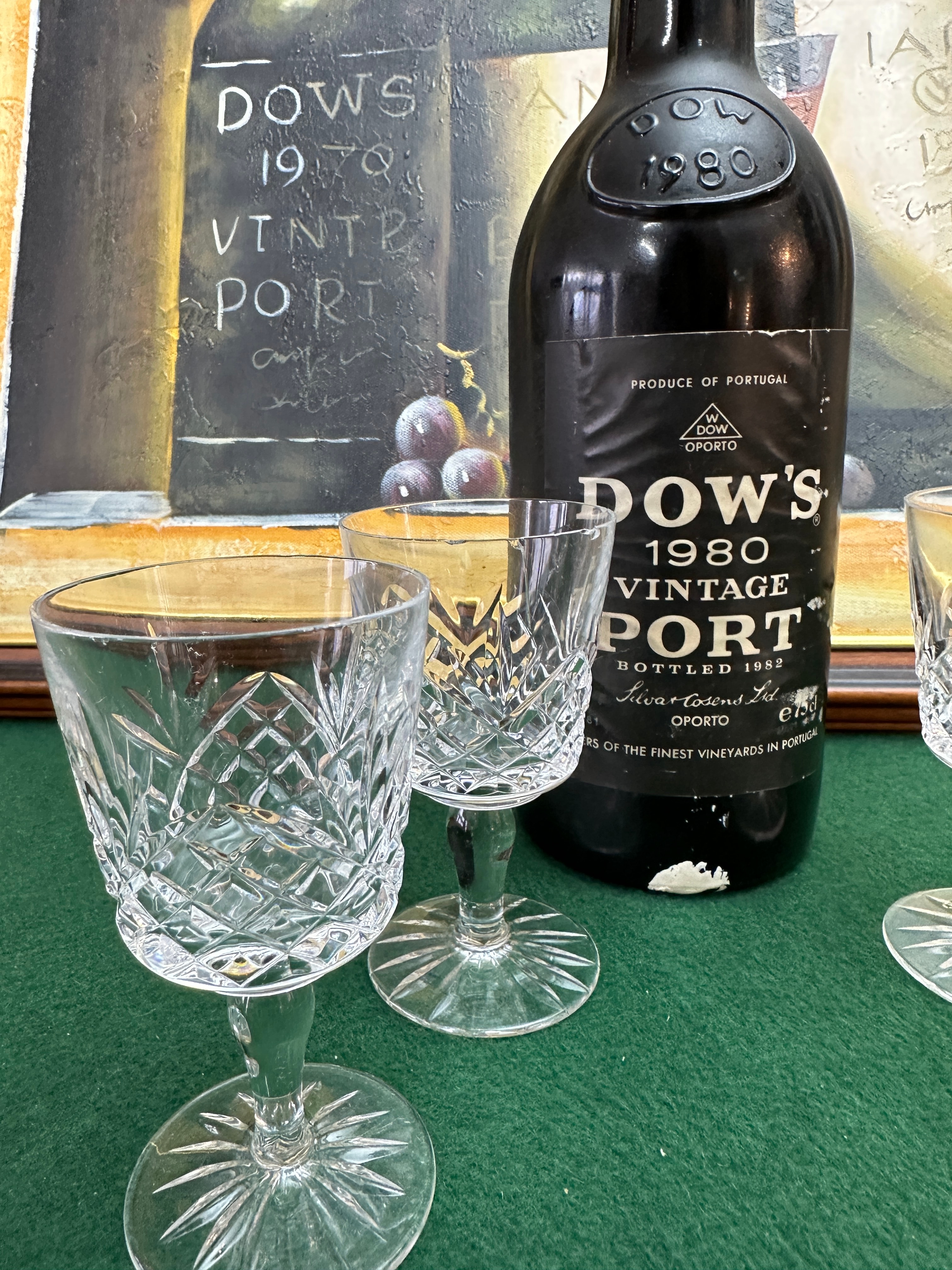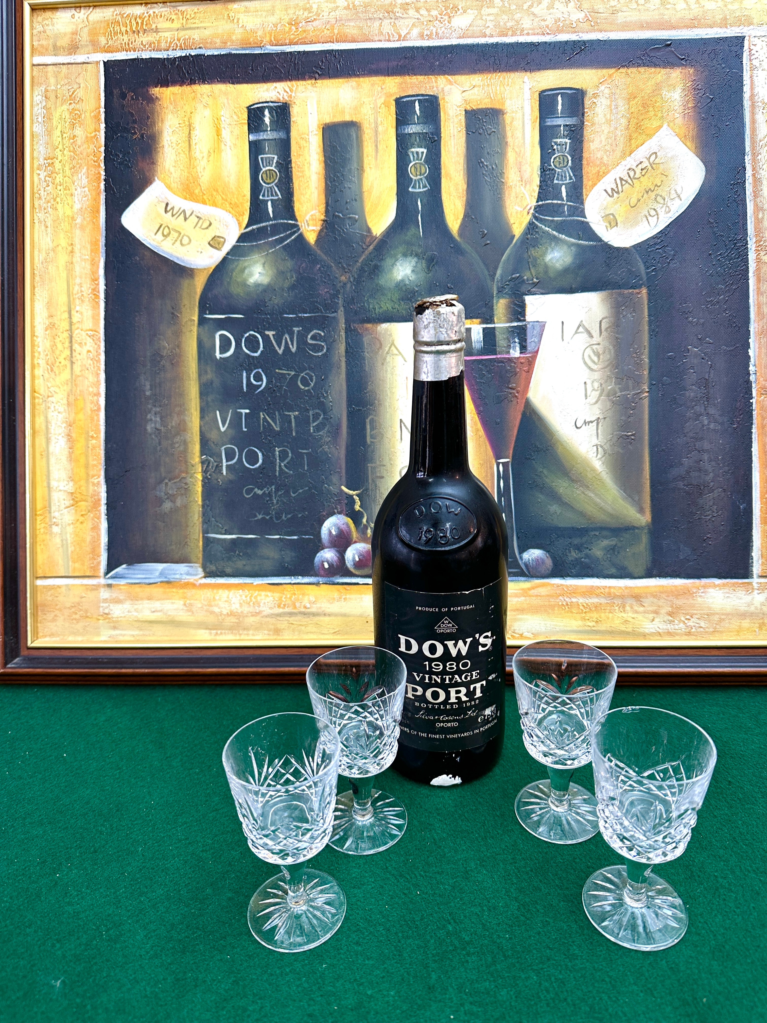 This ensemble features a dark glass bottle of Dow’s 1980 Vintage Port, confirmed by its black label stating “PRODUCE OF PORTUGAL” and “BOTTLED 1982” by “Silva & Cosens Ld. OPORTO”. The bottle shoulder is embossed with “DOW’S 1980”. Accompanying the bottle is a group of four clear stemmed glasses, likely cut crystal, featuring intricate diamond and fan patterns. The collection is presented with a framed oil painting depicting a still life of wine bottles and a glass, housed in a gold-colored wooden frame. The painting displays hand-painted text including “DOWS 1970 VINTAGE PORT”, “WNTD 1970”, and “WARRE 1984”.