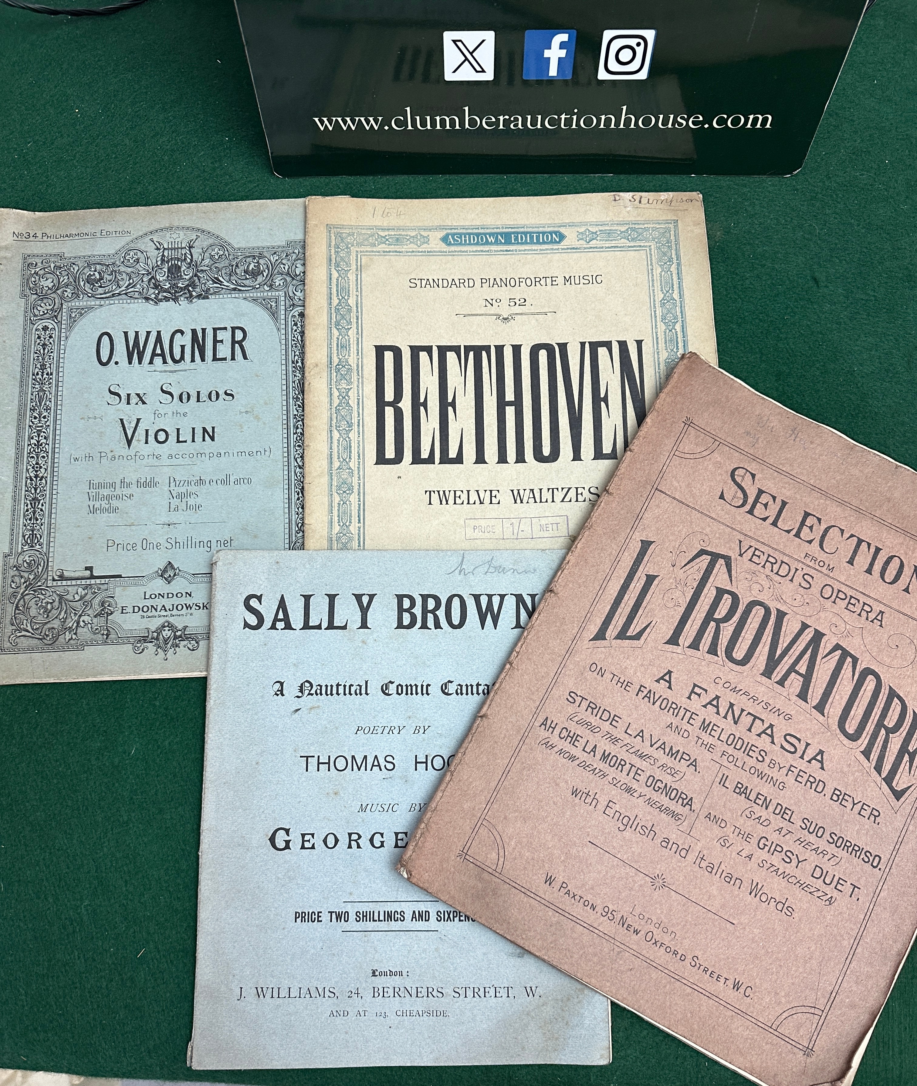 A collection of six vintage or antique printed sheet music booklets and one loose sheet of music, primarily dating from the late 19th to early 20th century, as suggested by typography, publishing details, and pricing in shillings. The items are made of printed paper and cardstock. The collection prominently features a ‘Selection from Verdi’s Opera Il Trovatore,’ explicitly noting ‘English and Italian Words,’ and arranged as ‘A Fantasia by Ferd. Beyer.’ Other noteworthy titles include ‘O. Wagner Six Solos for the Violin,’ ‘Beethoven Twelve Waltzes,’ and ‘Sally Brown A Nautical Comic Cantata.’ Publishers identified include E. Donajowski, Ashdown Edition, J. Williams, and W. Paxton. The loose sheet, ‘At Sunset by W.S. Rockstro,’ features musical notation with handwritten pencil annotations including the Italian ‘Andante grazioso’ and dynamic markings (p, pp, f, ff).