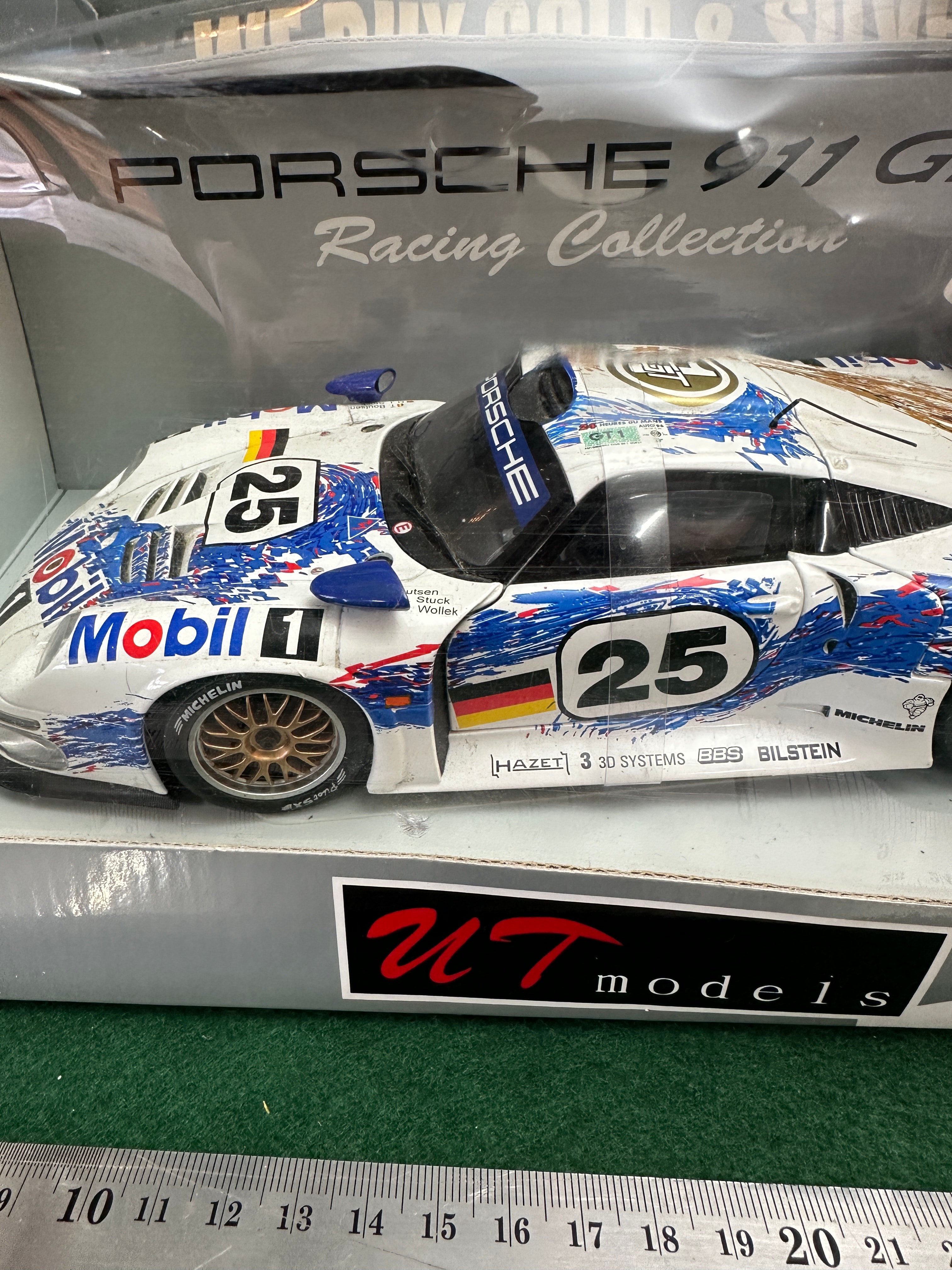 A UT Models Porsche 911 GT1 Racing Collection 1:18 scale diecast model car. The model depicts a Porsche 911 GT1 racing car, featuring a distinctive white, blue, red, and gold splatter livery. Prominently displayed are “Mobil 1” and “PORSCHE” branding, the racing number “25,” a German flag motif, and sponsor logos including “MICHELIN,” “HAZET,” “3D SYSTEMS,” “BBS,” and “BILSTEIN.” Visible driver names include “Thurn und Taxis,” “A. Hahne,” “W. Reuter,” and “B. Wollek.” The model is sealed within its original clear plastic and grey cardboard display packaging, which is marked “PORSCHE 911 GT1 Racing Collection” and “UT models.”