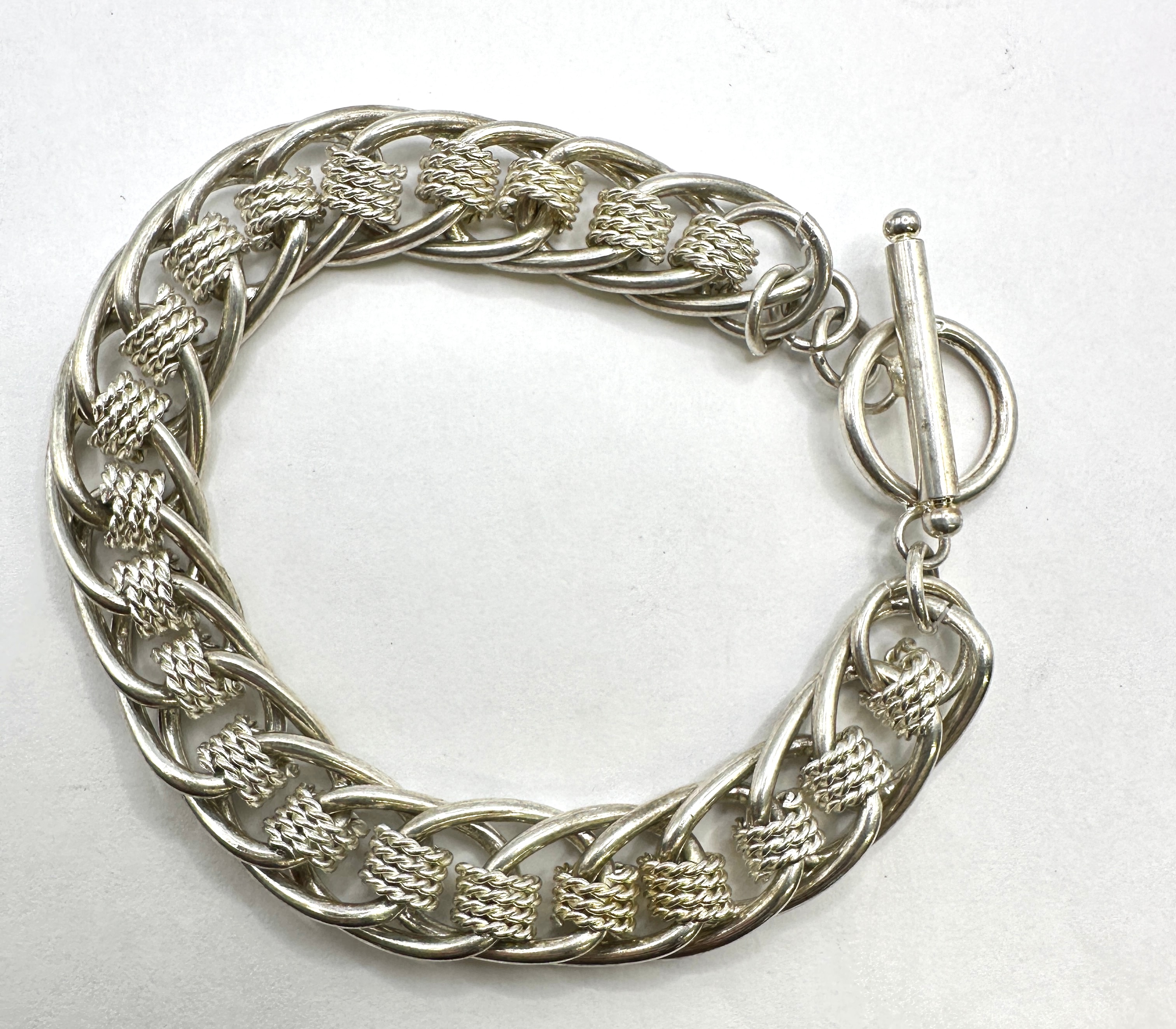 A 925 silver fancy link and weave bracelet. This substantial bracelet features large, elongated oval links interconnected by pairs of smaller, textured, woven-style links, forming a prominent chain pattern. It is secured by a toggle clasp consisting of a T-bar and a simple ring. No visible hallmarks or specific manufacturer’s markings are apparent on the item itself.