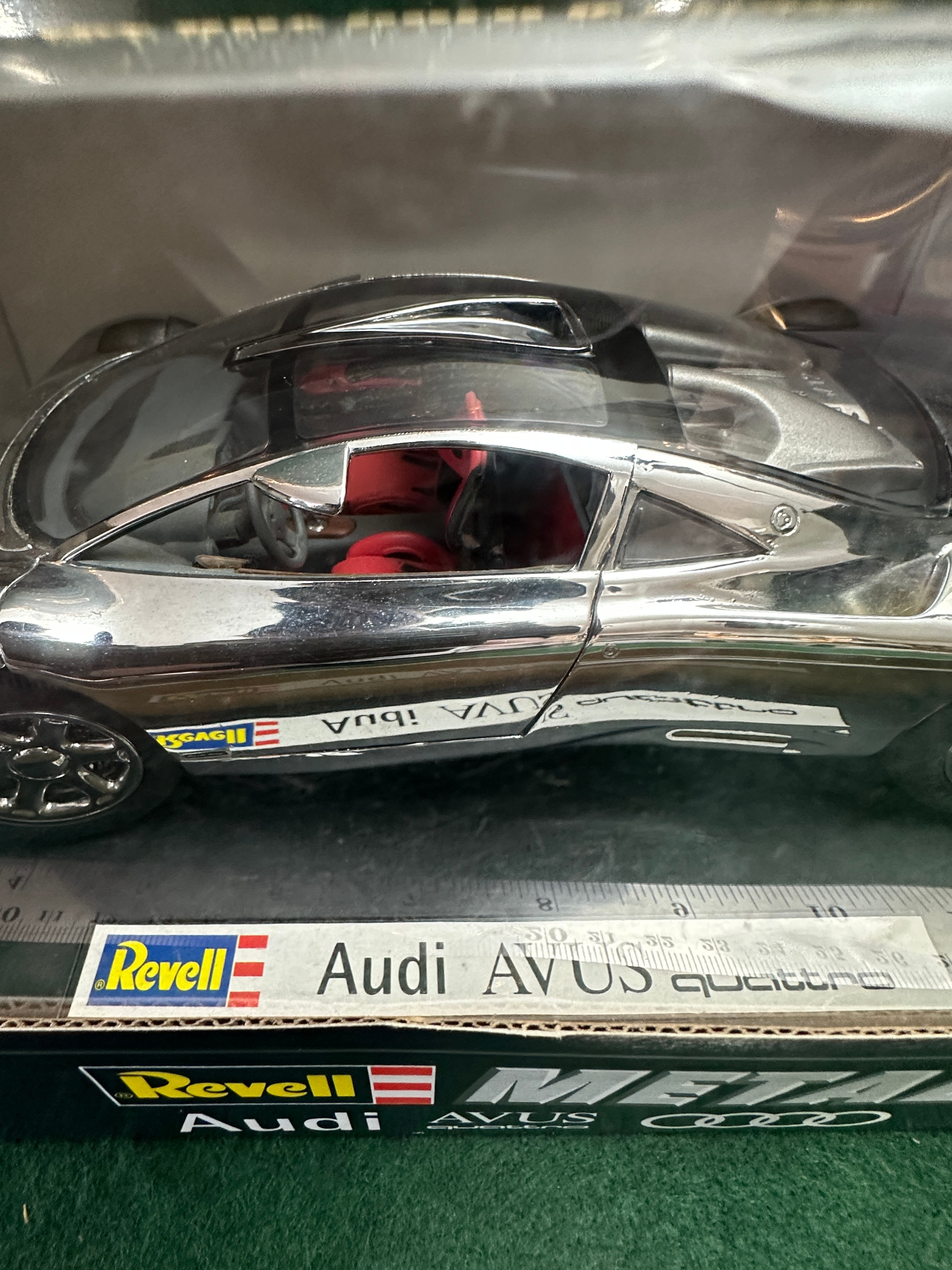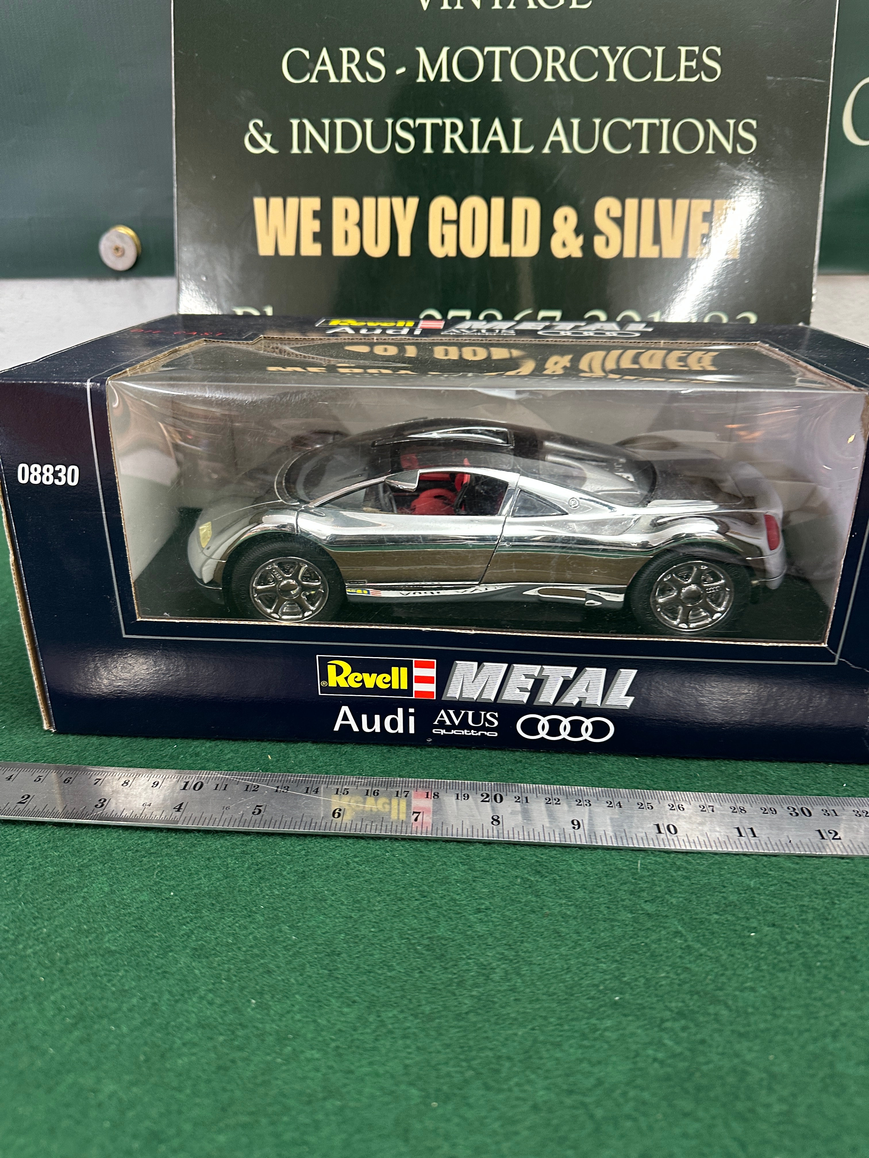 A Revell 1/18 scale die-cast model of the Audi AVUS Quattro, product number 08830. The model features a chrome or silver finish with a red interior and a small Revell logo decal near the front wheel. It is presented in its original cardboard box packaging with a clear plastic window, marked with the Revell logo, “METAL” branding, “Audi AVUS quattro” text, and the product number “08830”.