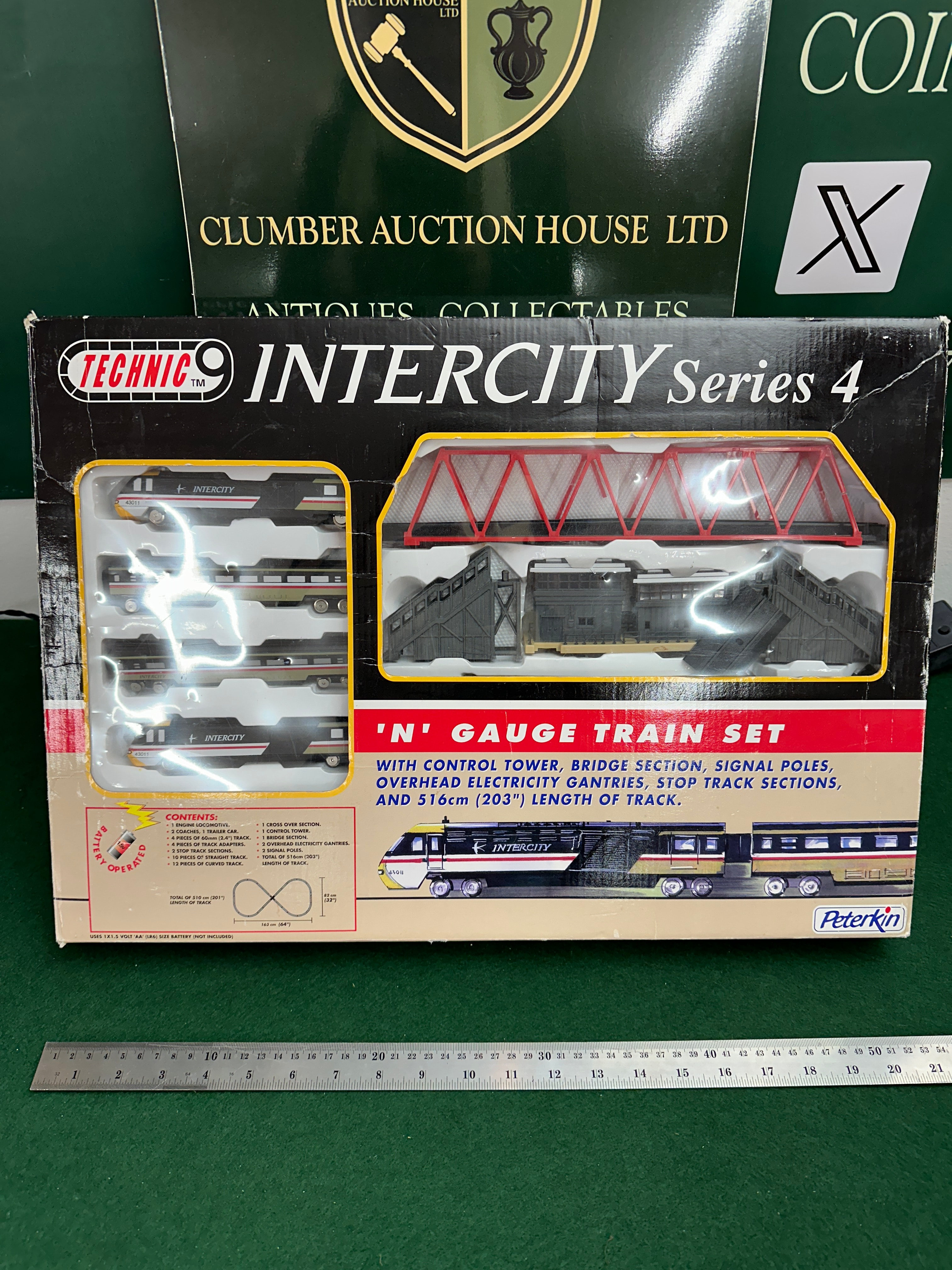 A Peterkin Technic N Gauge Intercity Series 4 model train set, manufactured in P.R.C. in 2001. The set includes a black and cream-colored locomotive, three matching passenger carriages, and various track sections comprising curved, straight, stop, and an ‘X’ crossing. Additional components include a red girder bridge section, a control tower, signal poles, and overhead electricity gantries. The set is presented in its original cardboard retail packaging with a molded plastic insert. The box states a total track length of 516cm (203″).