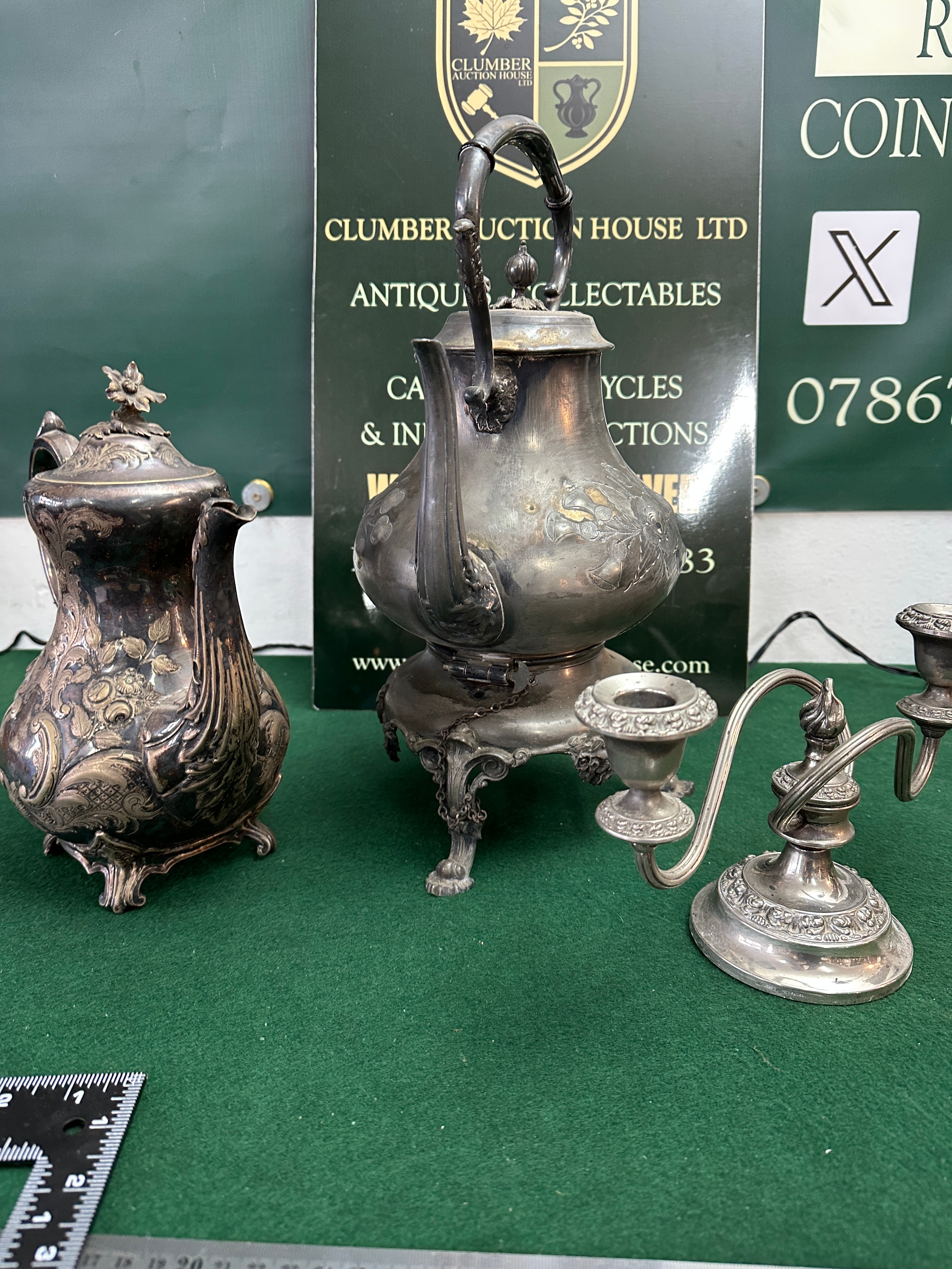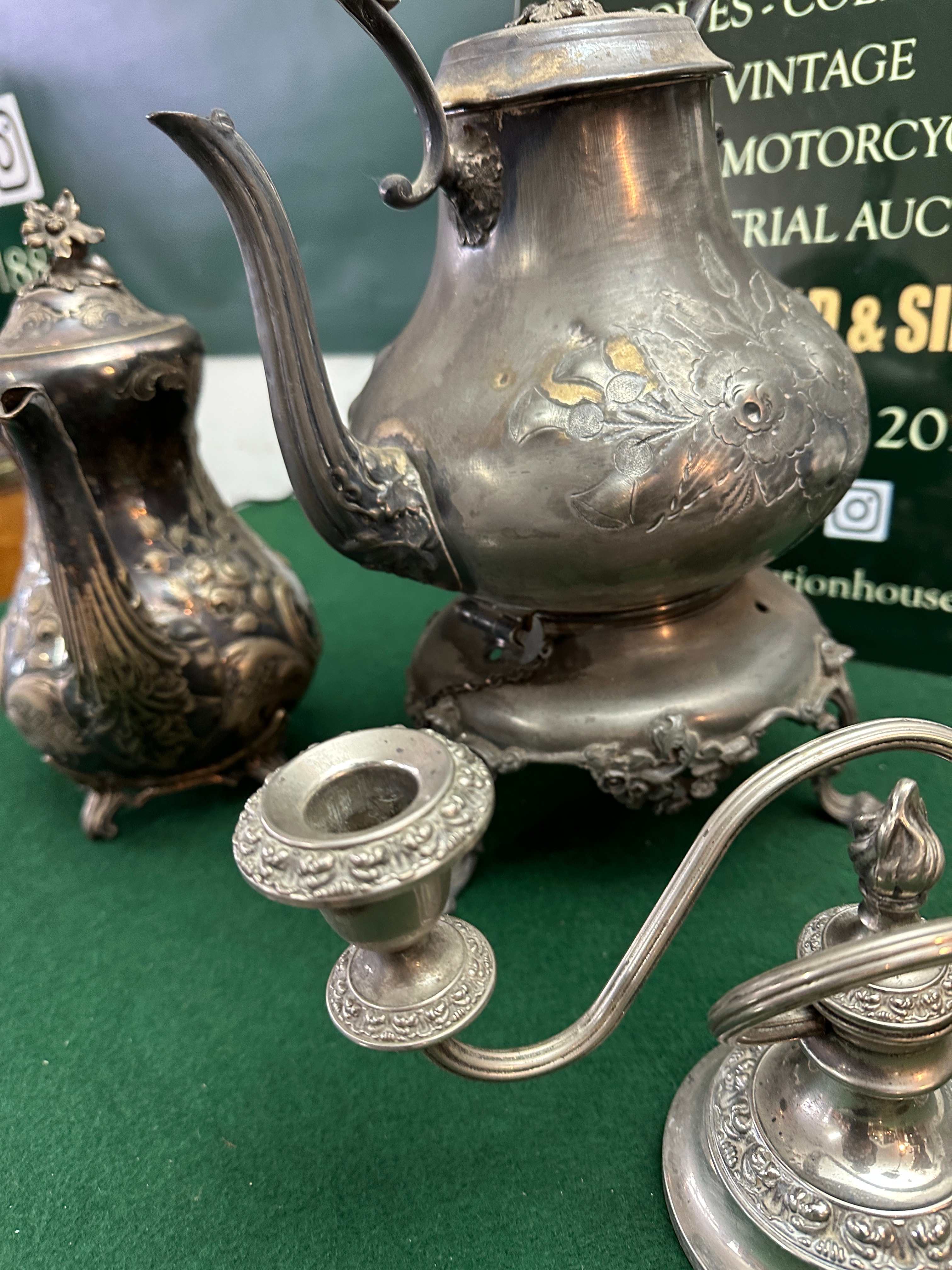A group of three late Victorian or Edwardian silver-toned metallic tableware items. Comprising a large lidded tea kettle or urn on an ornate footed stand with a swing handle (appearing to be ebonized wood or similar), a small lidded pitcher, and a two-arm candelabra. All pieces are richly decorated with ornate repoussé or chased floral and foliate patterns, indicative of the period. No specific manufacturer’s marks or textual inscriptions are discernible.