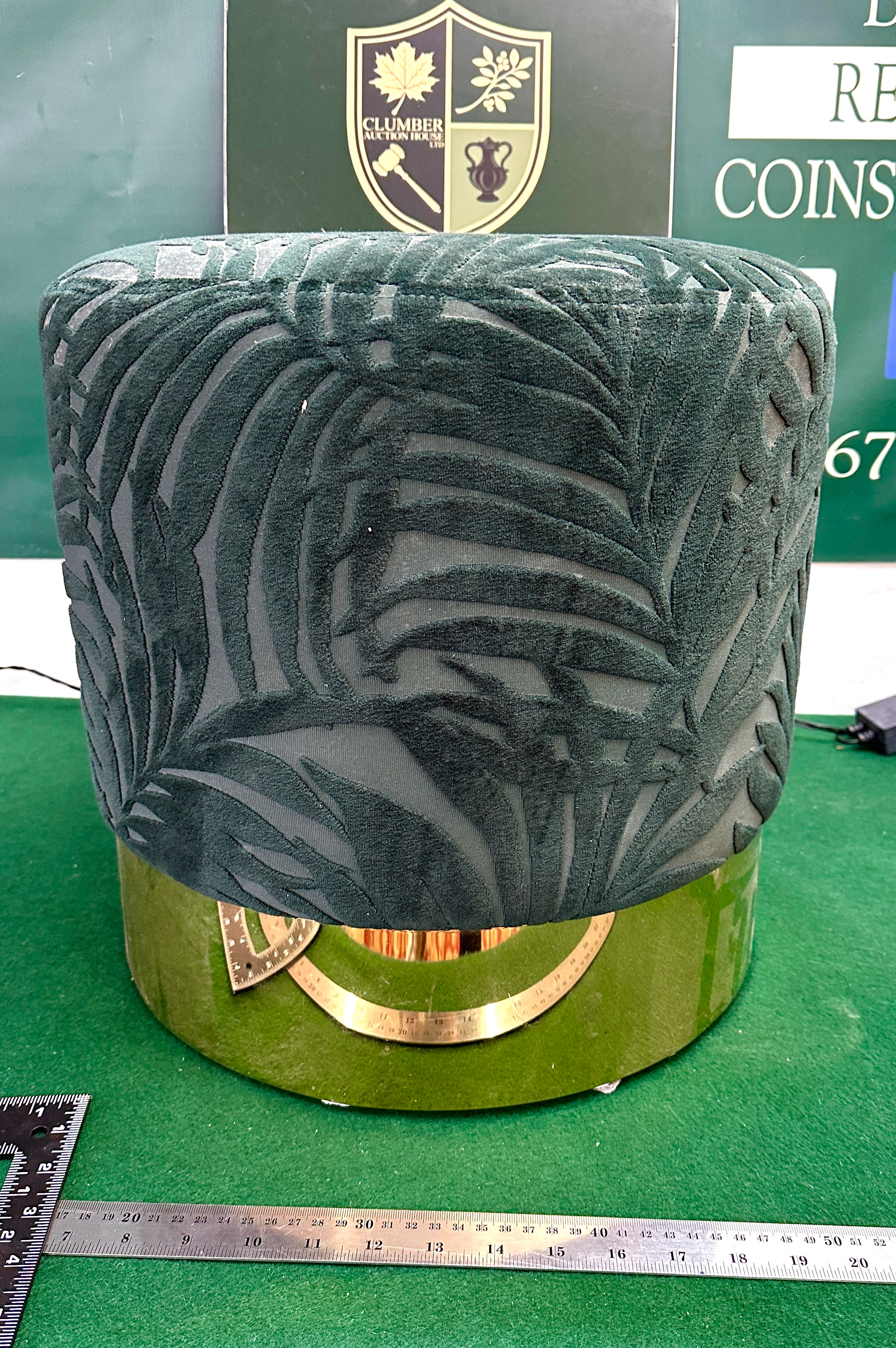 This is a LIFA LIVING Round Velvet Pouf, featuring a palm leaf pattern. The upper section is covered in a dark forest green velvet-like fabric with a raised, darker botanical leaf pattern. The lower section is a solid, lighter olive green cylindrical base, likely constructed from painted wood or cardboard. It is topped with a metallic gold-toned band that exhibits engraved numerical markings and a scale, resembling a protractor.