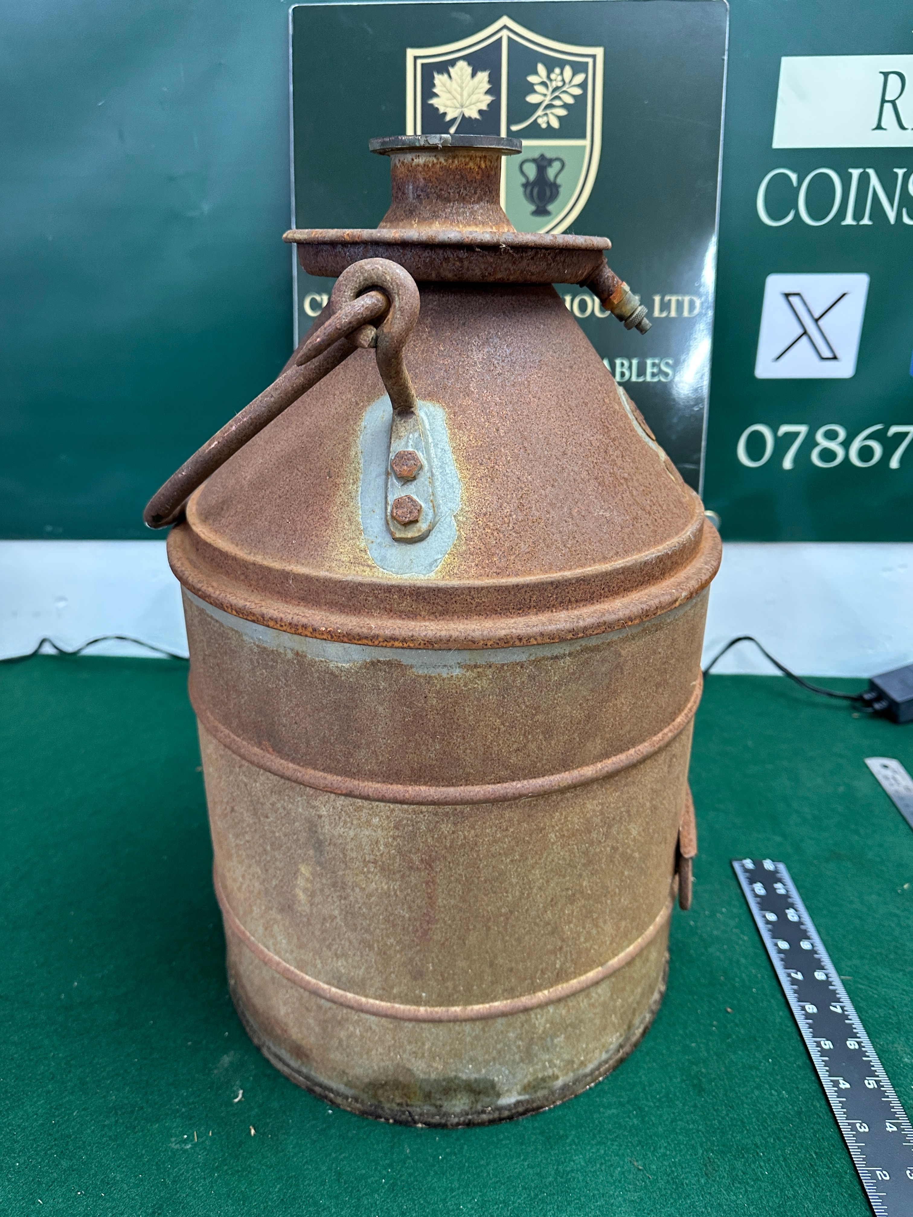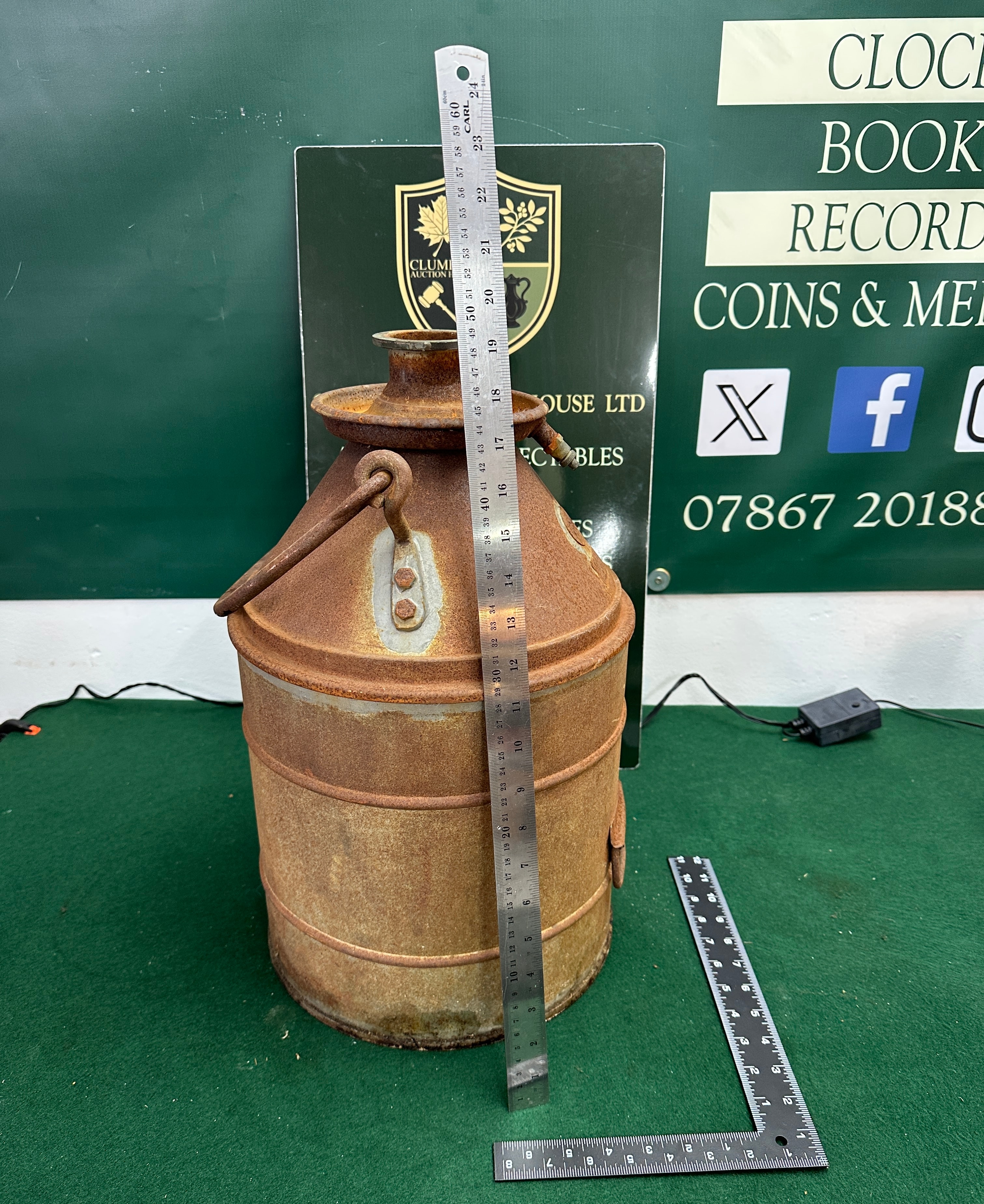 A 19th Century Copper Milk Can. Featuring a cylindrical body with a tapering conical top, an integrated lid, a small spigot or spout, and two hinged loop handles. A prominent circular raised boss on the front of the conical section bears the embossed number ’26’ above a smaller, rectangular raised panel that appears blank or illegibly marked. This utilitarian vessel was likely used for agricultural or industrial liquids.