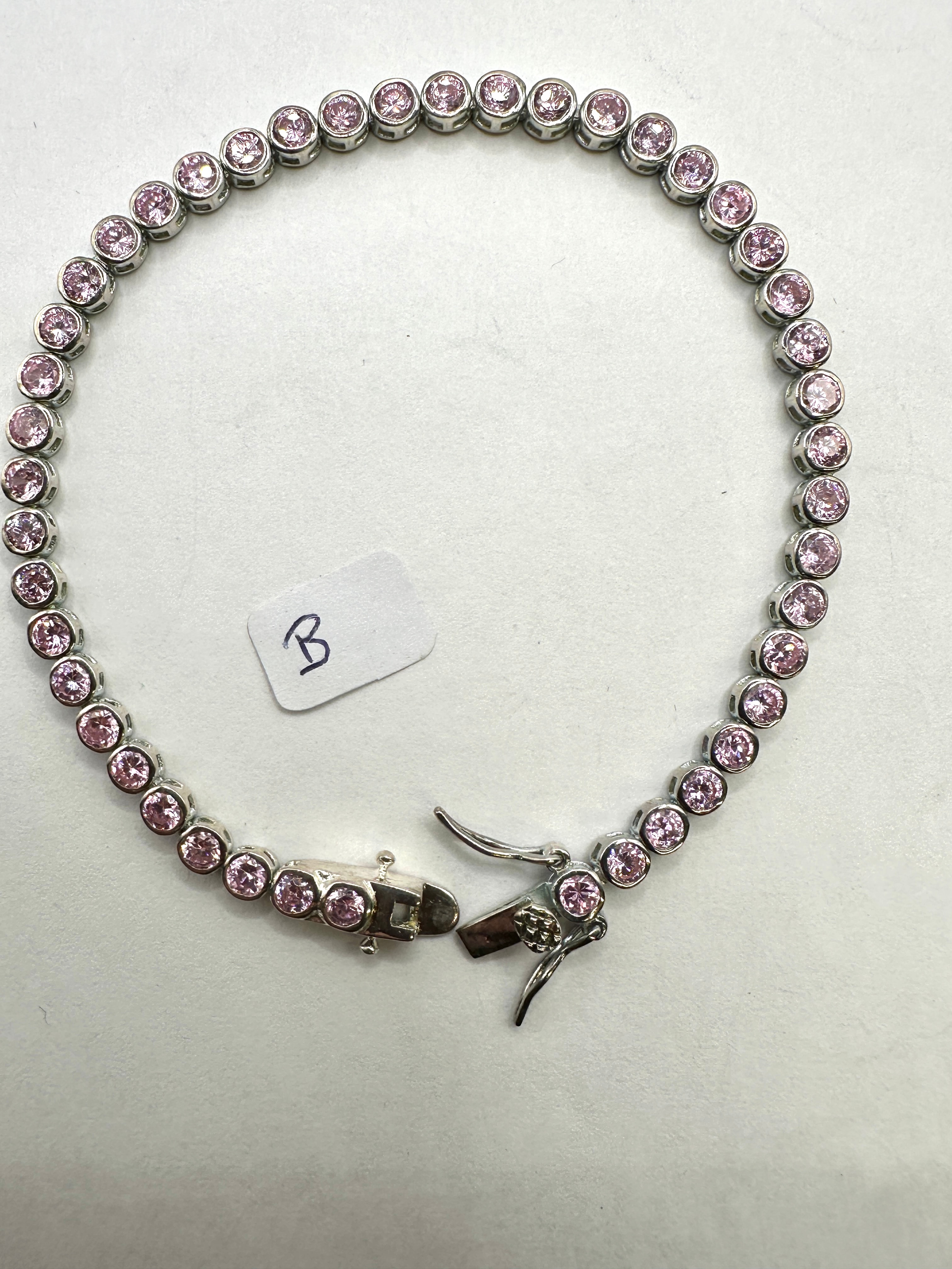 A contemporary-style pink stone tennis bracelet, crafted from 925 silver. The bracelet features a continuous line of numerous round, faceted pink stones, each individually set in a bezel-style mount. It is secured by a box clasp with a visible “925” hallmark and includes a fold-over safety catch.