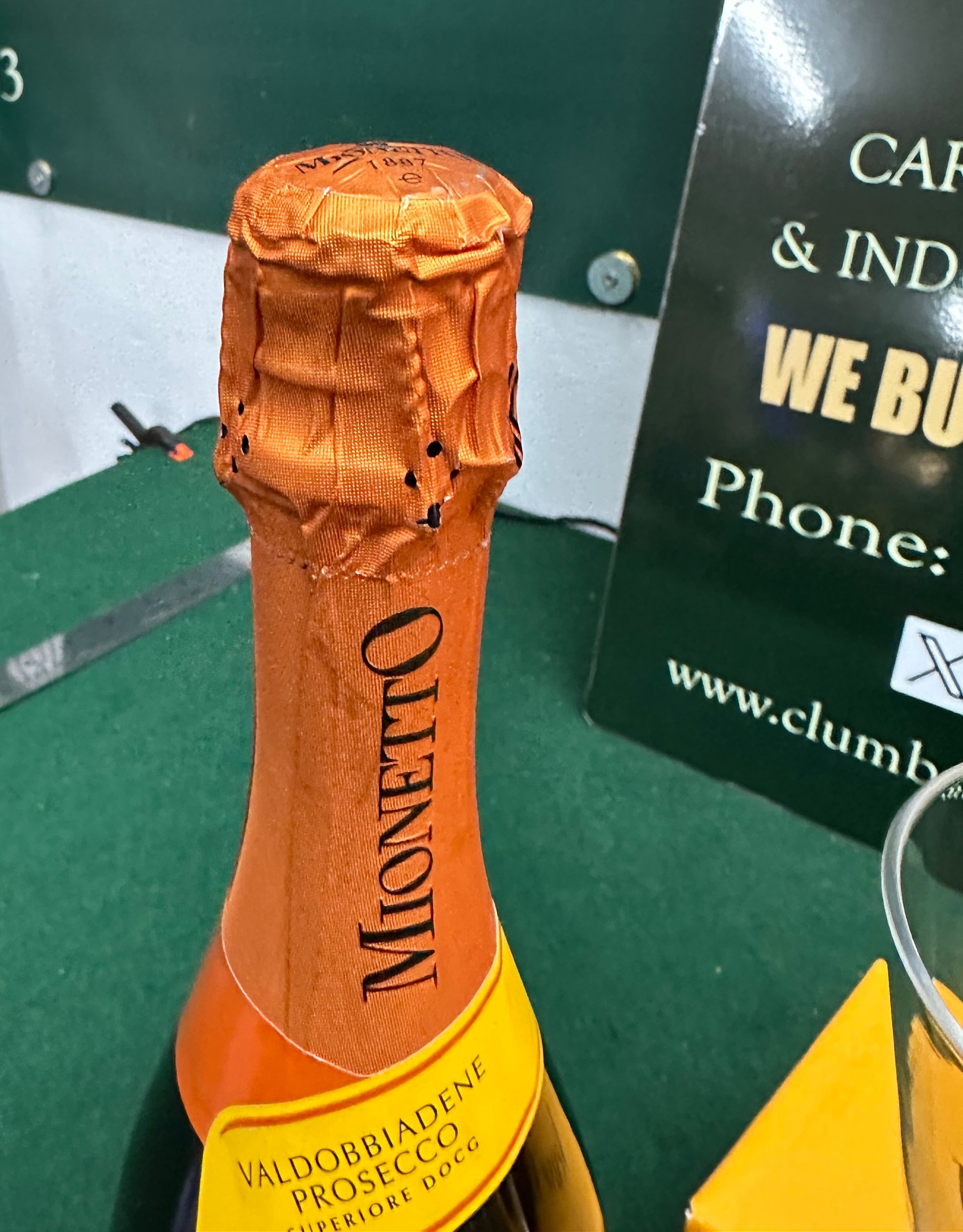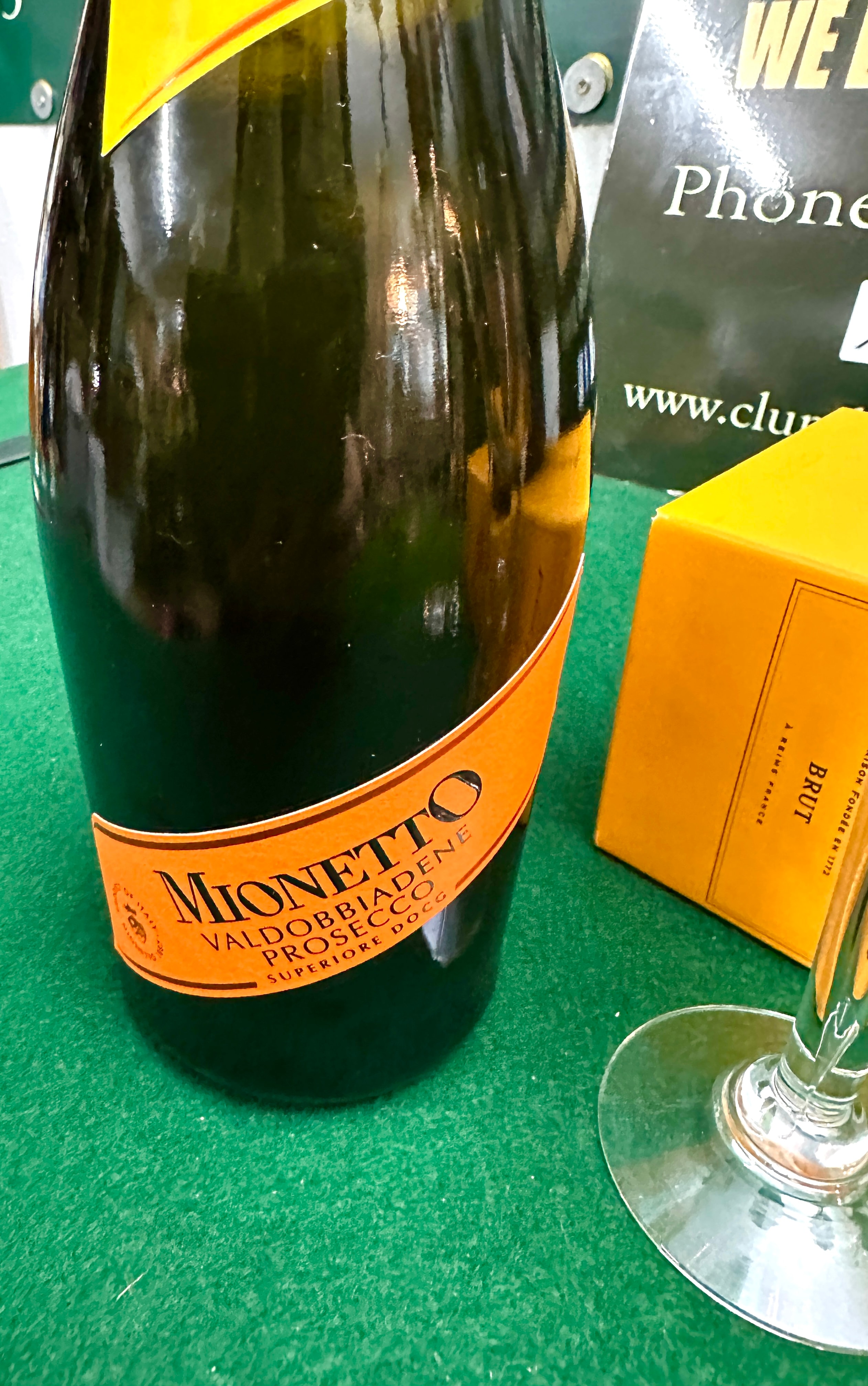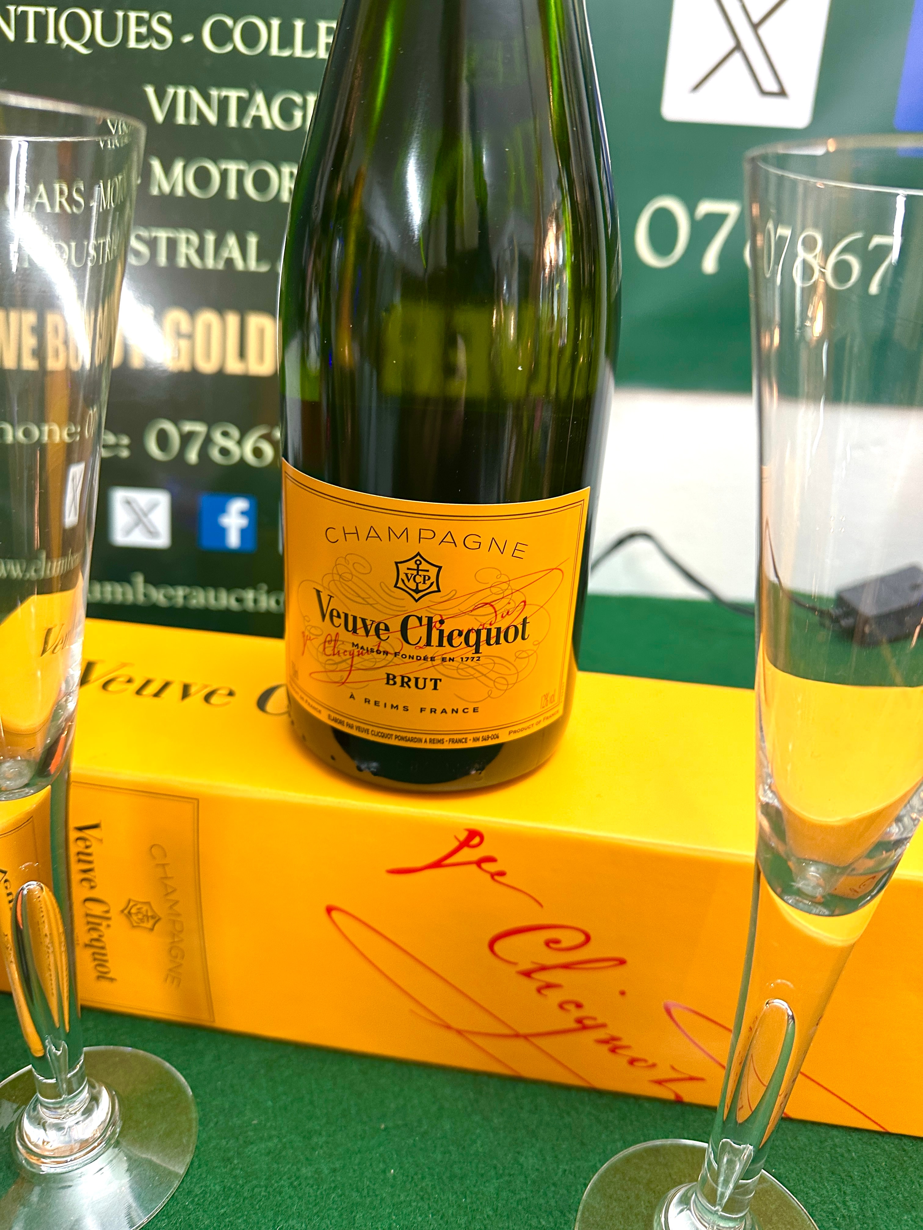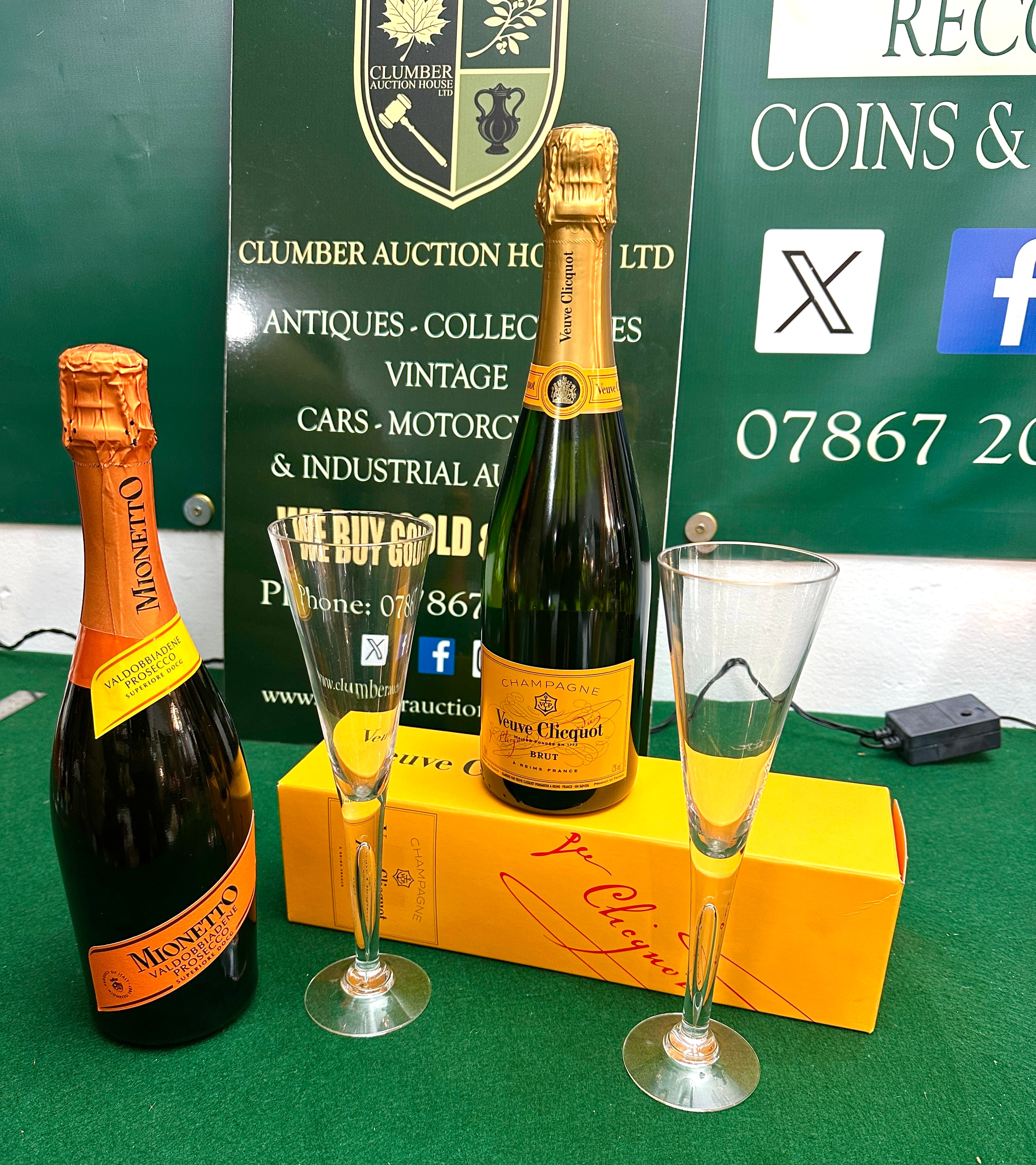 A bottle of Veuve Clicquot Yellow Label Brut Champagne, 75cl. This standard 75cl green glass bottle is labeled with yellow paper, marked “FONDÉE EN 1772” and “A REIMS FRANCE”, and features a golden foil-wrapped cork and neck with royal warrant markings. Accompanying this is a bottle of Mionetto Valdobbiadene Prosecco Superiore DOCG, featuring an orange foil-wrapped cork and neck with matching orange and yellow labels, marked “EST. 1887”. The lot also includes two tall, clear glass champagne flutes, each etched with the “Veuve Clicquot” logo on the base. A clear glass Veuve Clicquot branded presentation box, in yellow, completes the set.