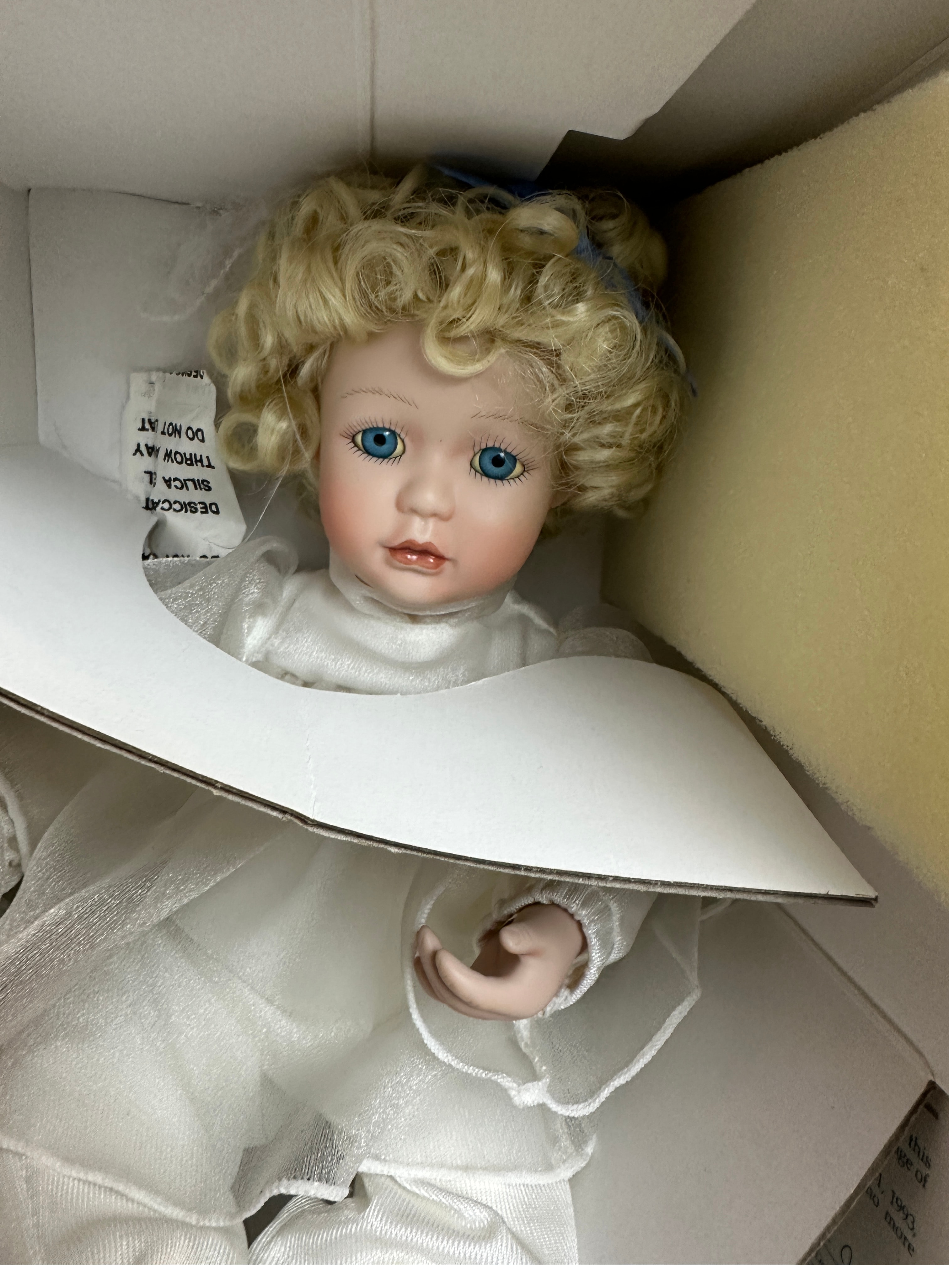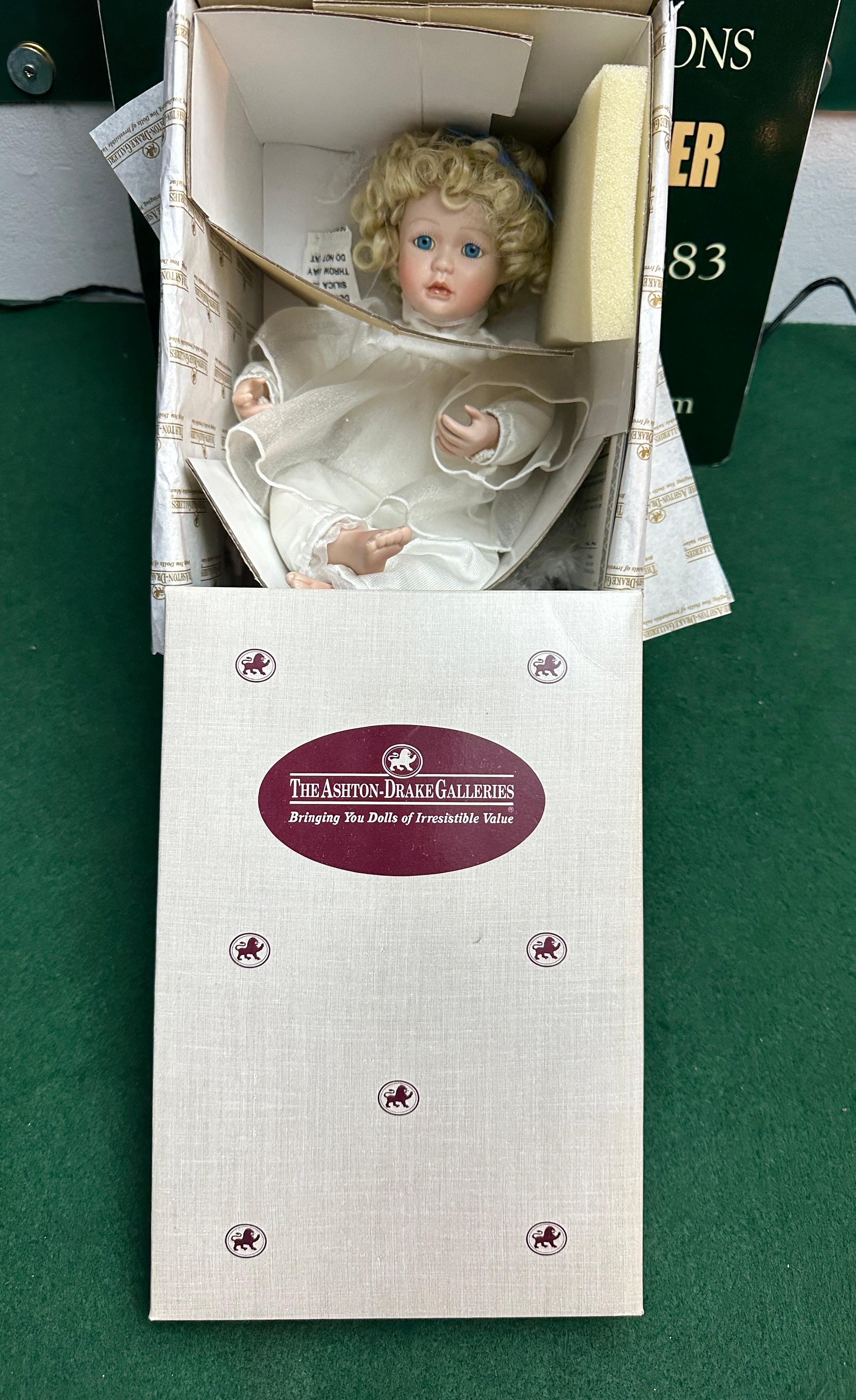 An Ashton-Drake Galleries ‘Sweet Dreams’ porcelain doll, dated 1993. The child-like collectible doll features a blonde, curly-haired head and hands, appearing to be bisque or porcelain, with blue eyes. It is dressed in a white sheer fabric gown. The doll is presented in its original manufacturer’s box with internal cardboard supports. The box lid is marked with ‘The Ashton-Drake Galleries’ and ‘Bringing You Dolls of Irresistible Value’ within an oval logo, surrounded by repeated stylized horse emblems. A ‘DESICCANT SILICA GEL DO NOT EAT THROW AWAY’ packet is visible within the box. Additional visible text on adjacent boxes includes ‘GALLERIES’ and ‘1993’.