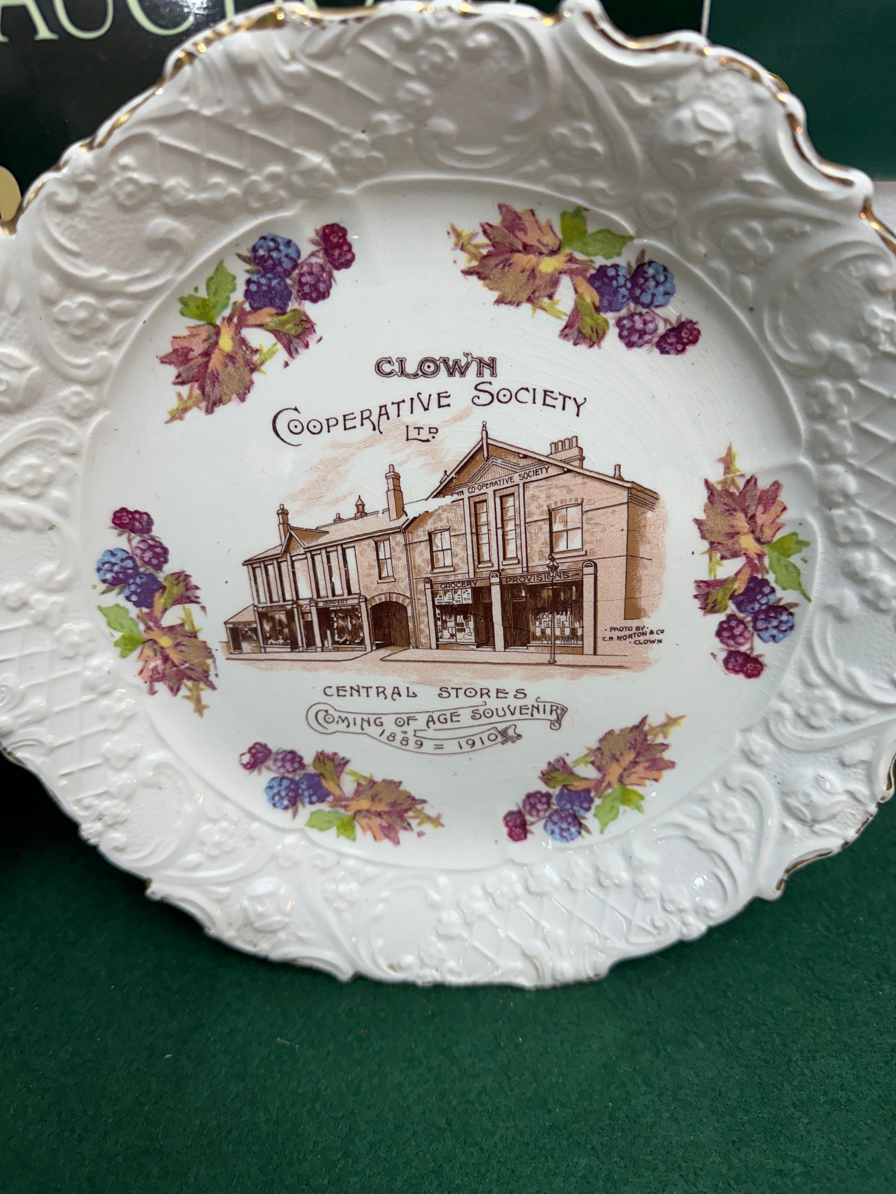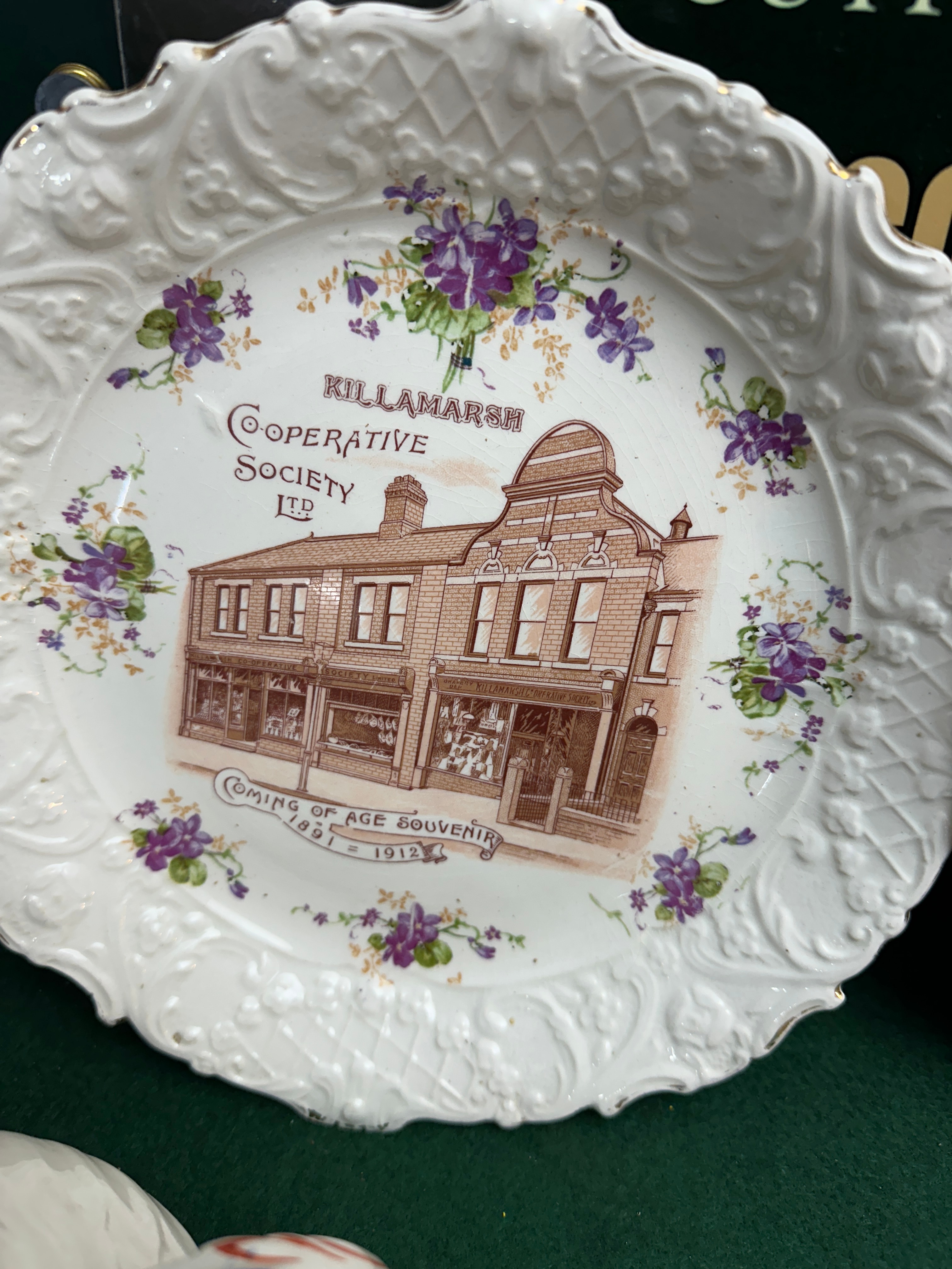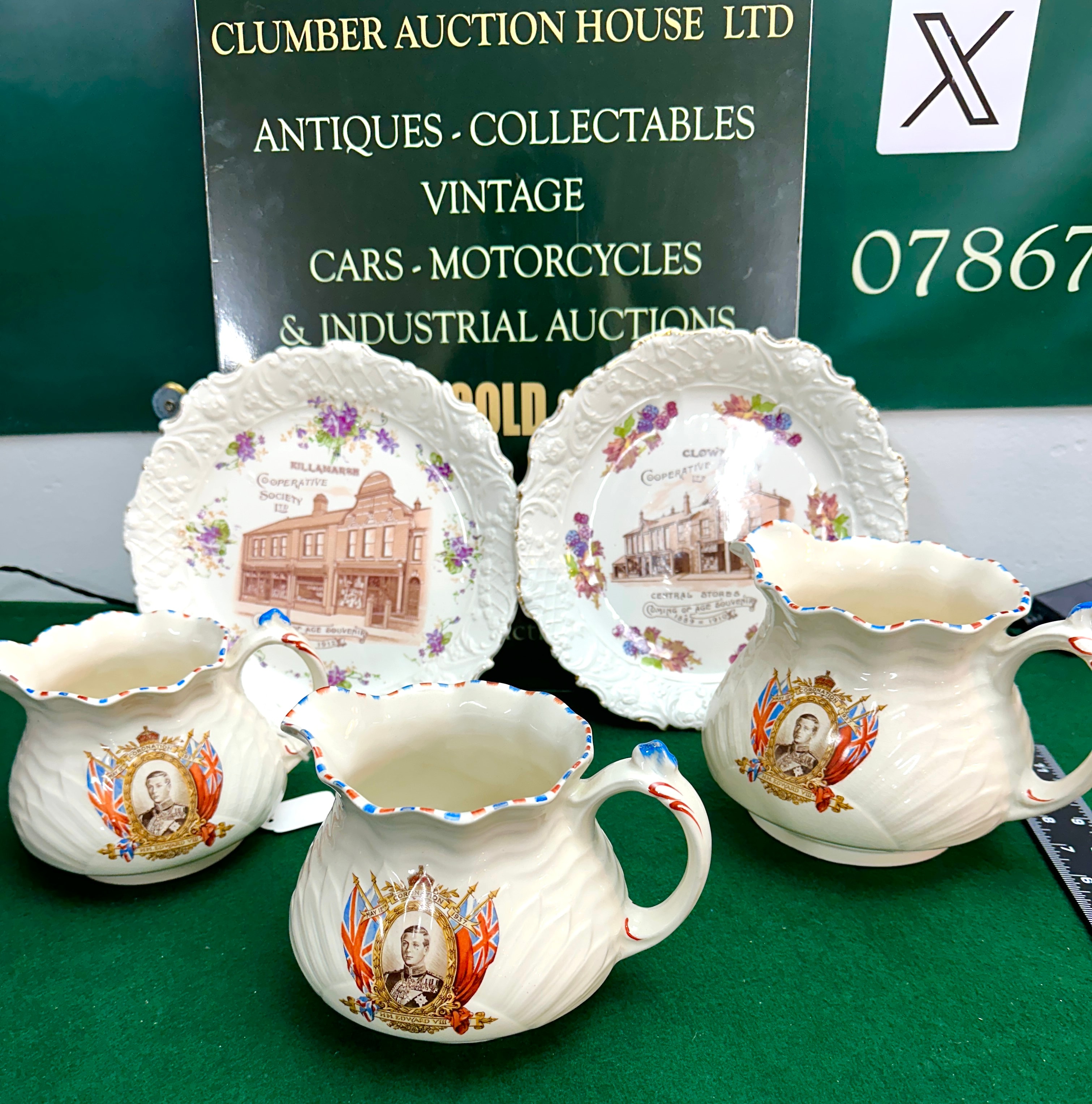 A group of six ceramic items, comprising four creamers and two decorative plates, all featuring a white glazed finish. The four creamers exhibit identical commemorative transferware decoration depicting H.M. Edward VIII in a portrait surrounded by a crown and Union Jack flags, with the text “Coronation” and “H.M. EDWARD VIII,” dating them to circa 1937. One creamer’s base is marked “Coronet Ware, Parrott & Company, Registered Trade Mark, Made in England” alongside a parrot logo. The two decorative plates are also commemorative, featuring sepia-toned architectural images of “CLOWN Cooperative Society LTD” (marked “Coming of Age Souvenir 1885 = 1910”) and “KILLAMARSH Cooperative Society LTD” (marked “Coming of Age Souvenir 1891 = 1912”). Each plate is bordered by painted floral motifs and scalloped, gilded rims. The reverse of one plate bears a green “C.W.S. LONGTON” backstamp with a beehive logo.