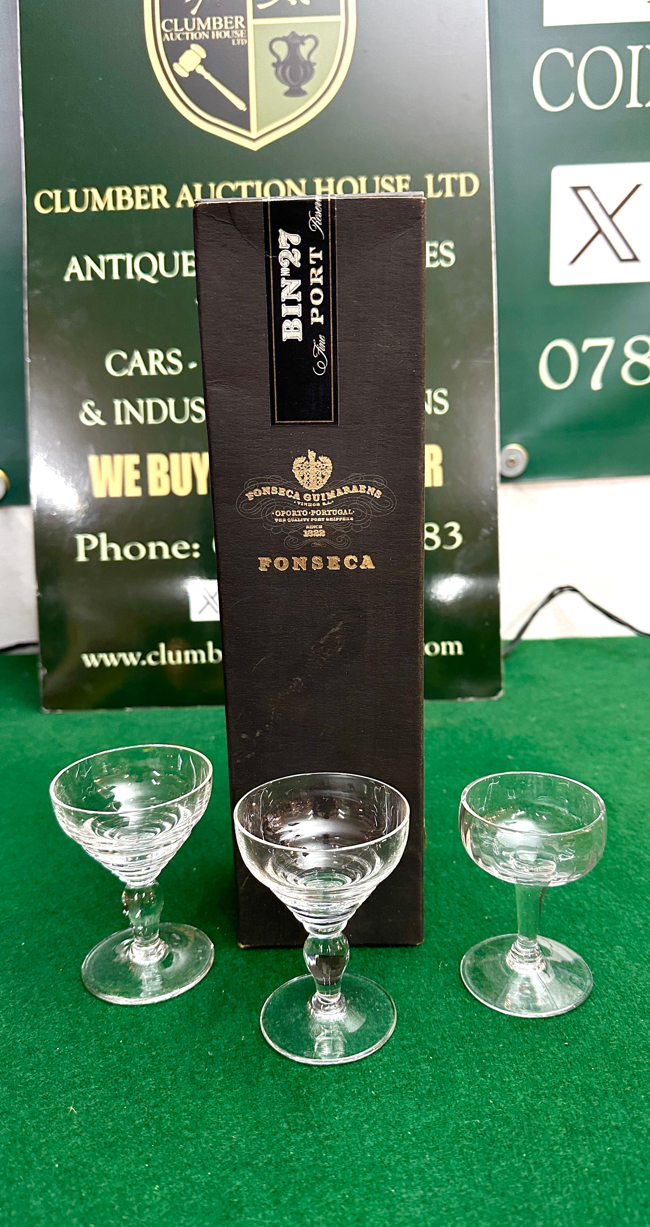 A presentation set comprising a tall, dark brown cardboard box for Fonseca BIN ’27 Fine Ruby Port, bearing the visible text “BIN ’27 Fine PORT Ruby,” “FONSECA GUIMARAENS,” “OPORTO PORTUGAL,” and “REG. TRADE MARK.” Accompanying the box are three small, clear glass stemmed glasses, consistent in style with traditional port or liqueur glasses.